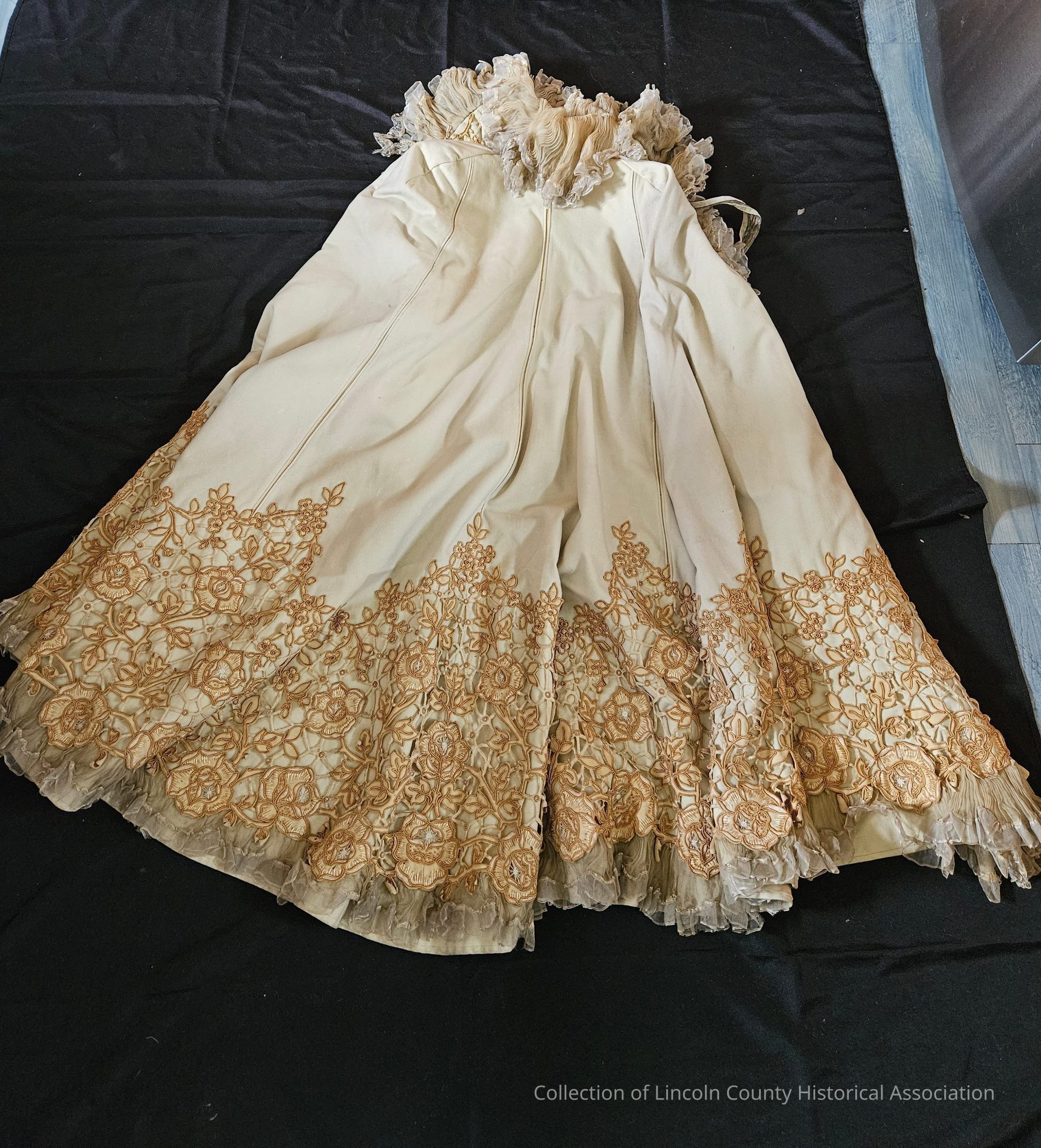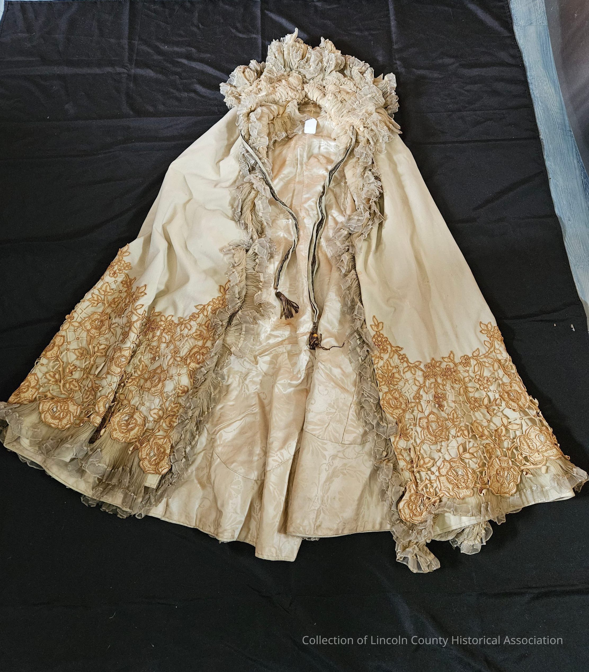 Cream wool flannel cape. Gold floral soutache overlay on the bottom of cape. Ruffled silk trim. Cream floral silk lining. Two tassels hanging from neck.Clothing/Dress/Costume Details