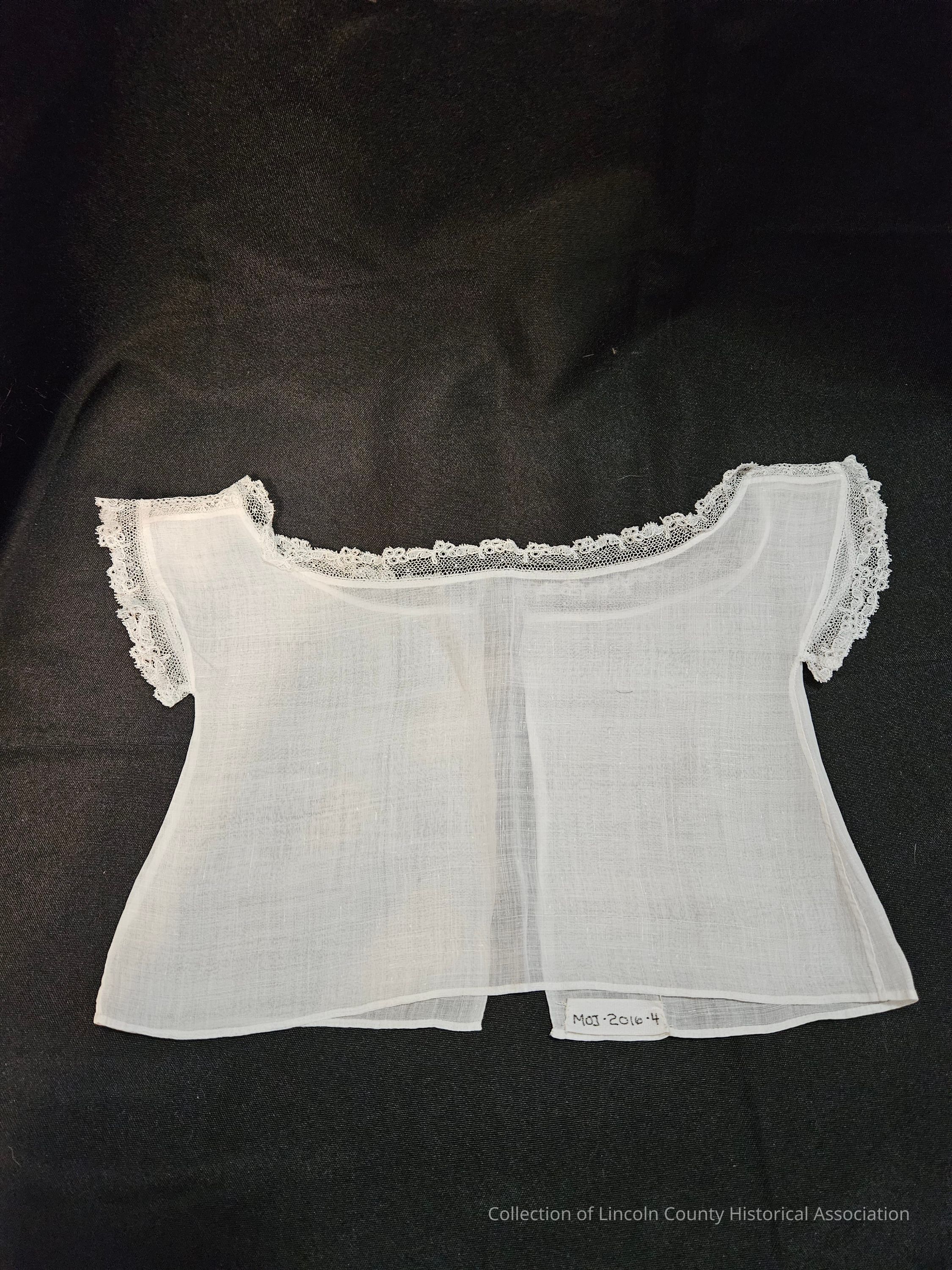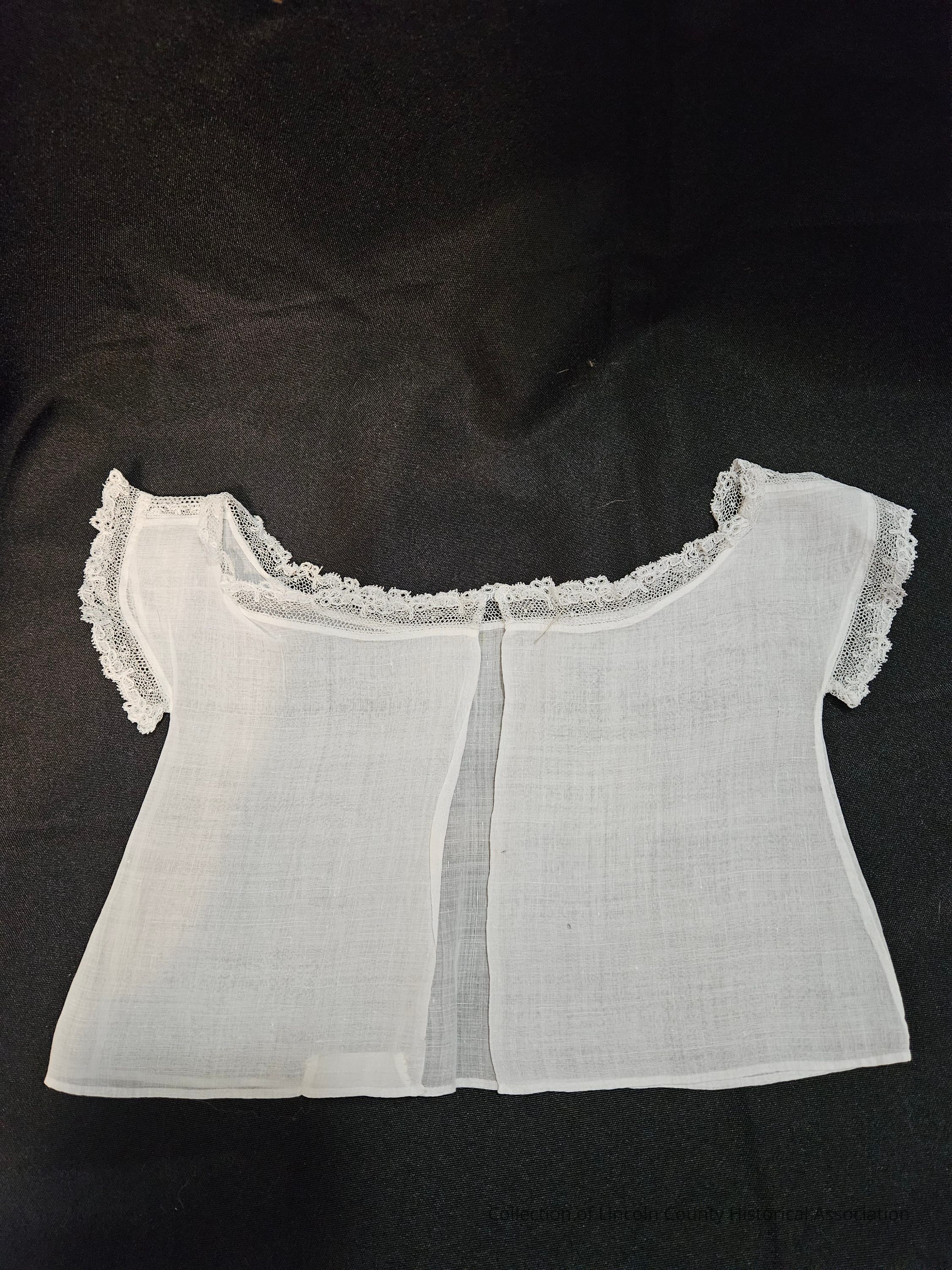 White cotton infant shirt. Lace edging at front and back of neck, top of shoulders, and arms. Back of shirt is not sewn together.Clothing/Dress/Costume Details