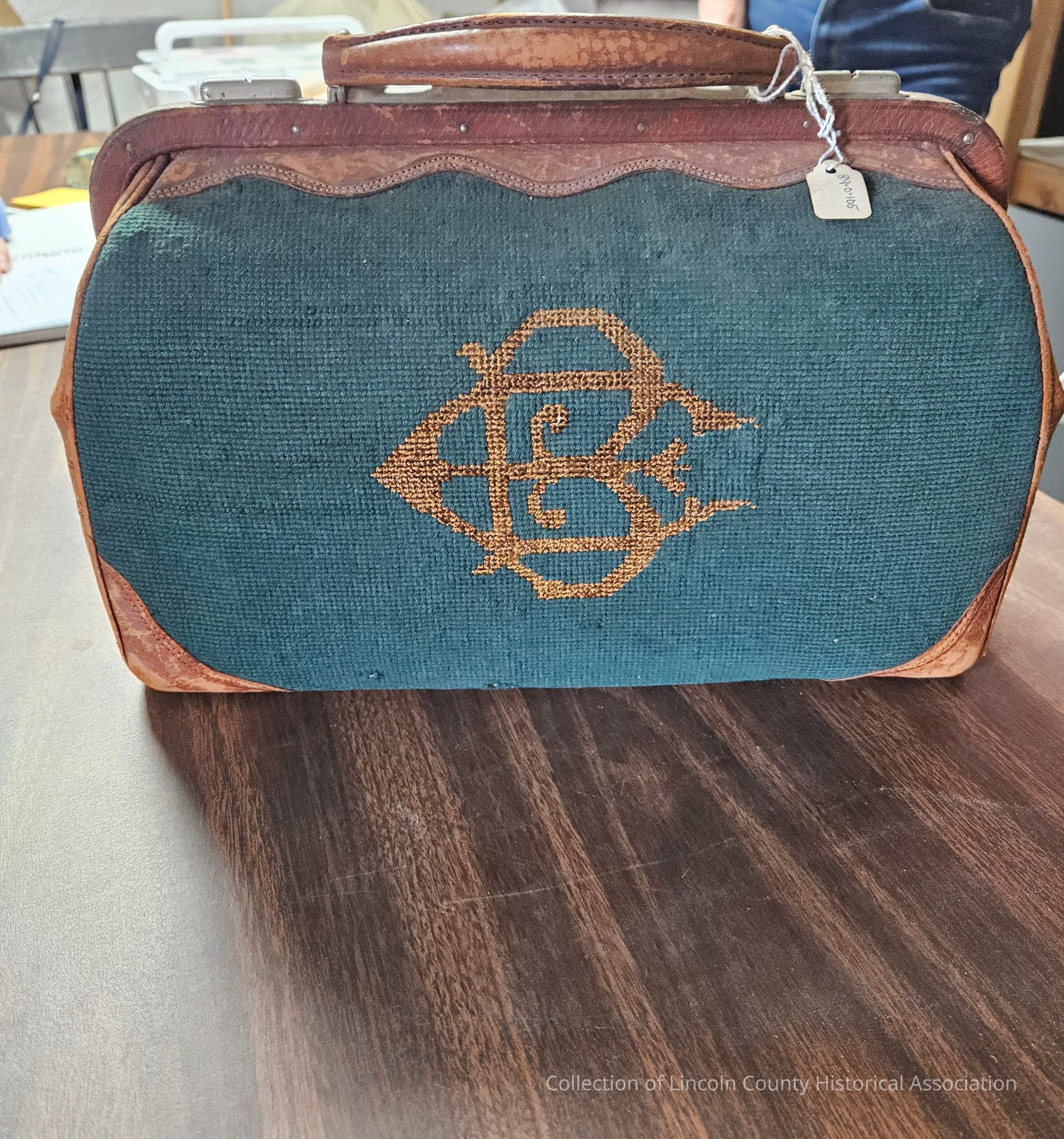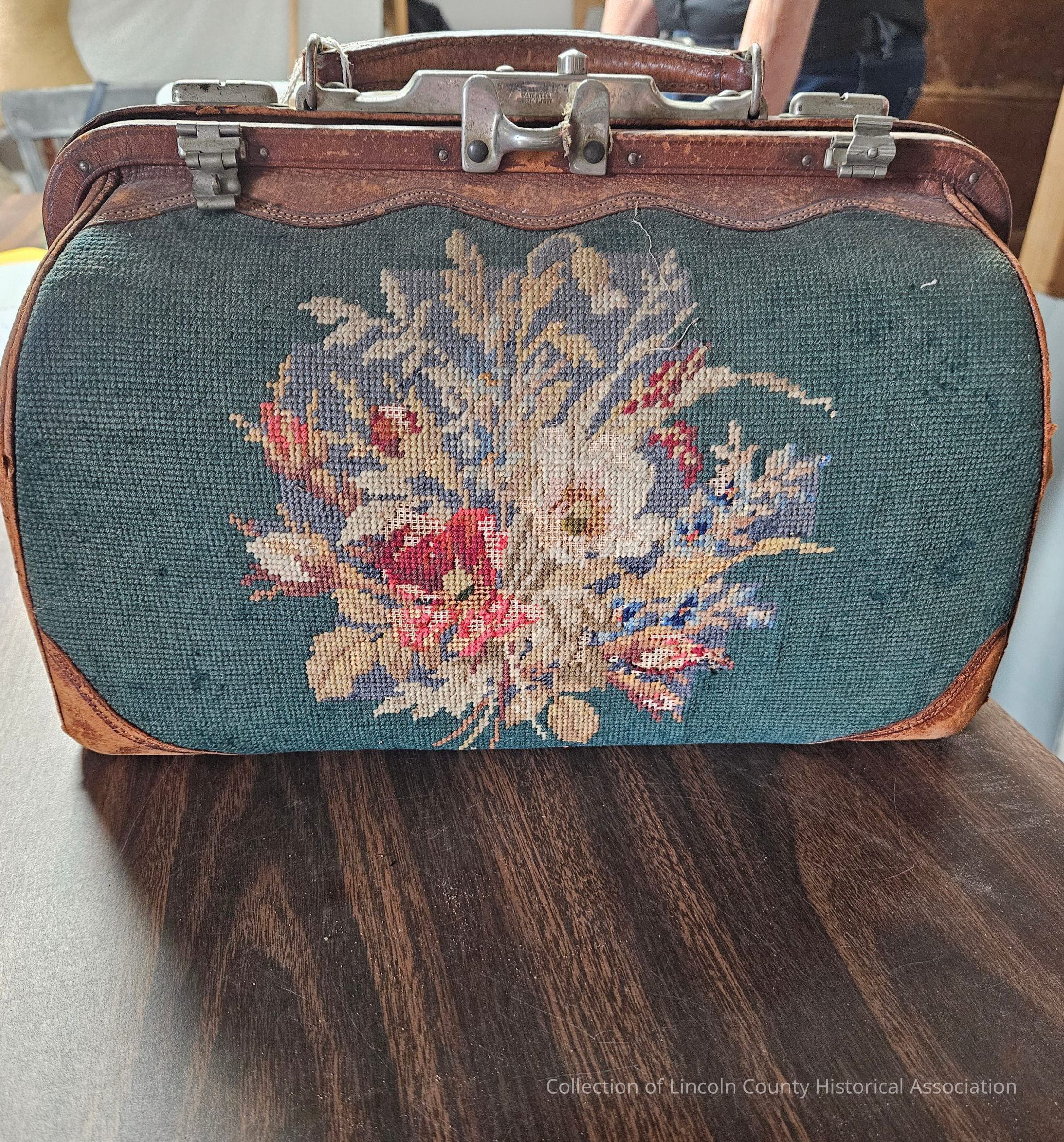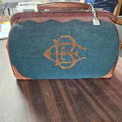 Leather Bag with with a metal frame opening and a leather handle. Needlepoint crewelwork creating ornamental floral patches in green, red, blue, and gold on each side of bag. Embroidered initials "E.B." on back.Made/Created