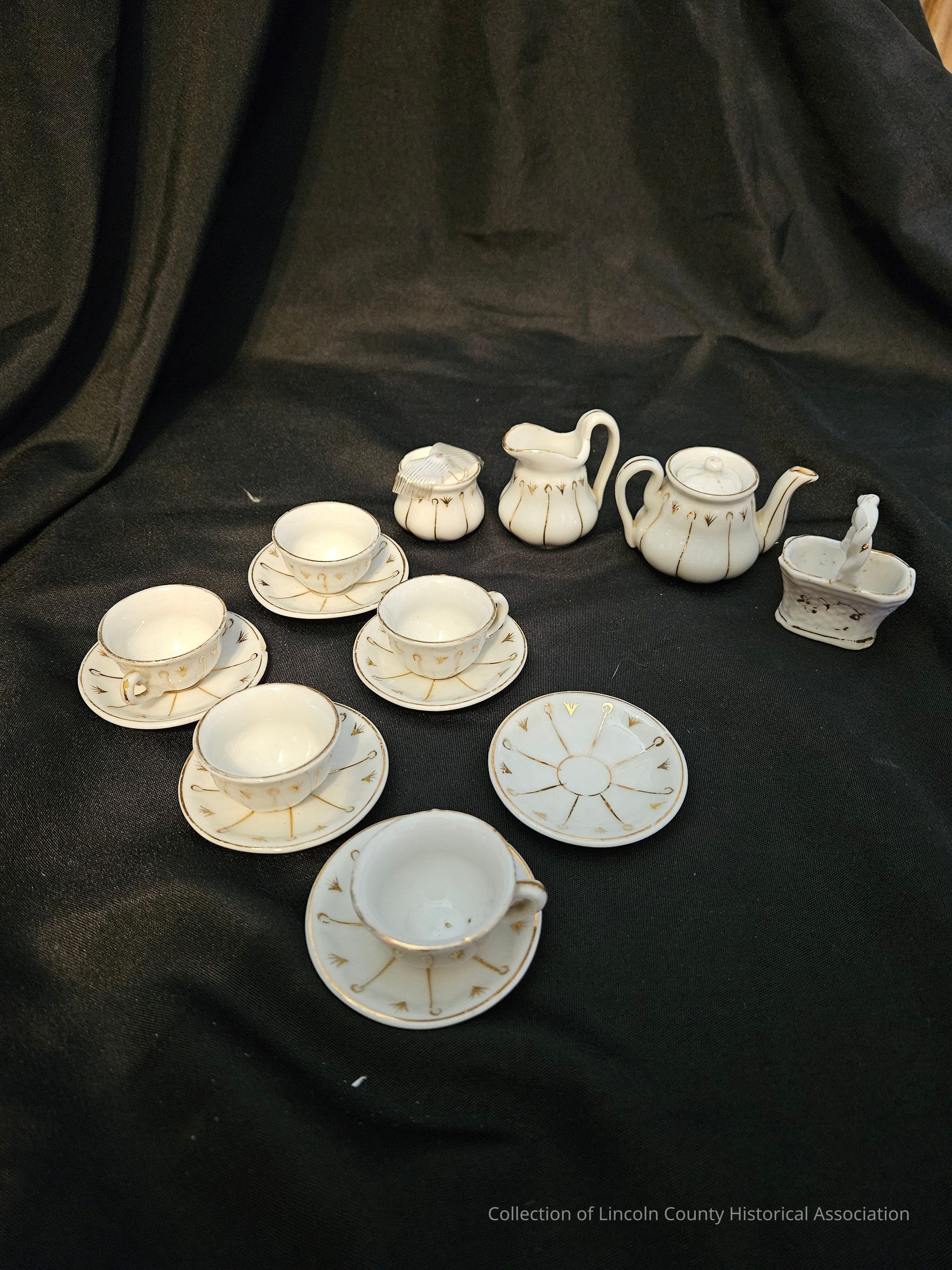 Porcelain tea set, white with gold trim. Includes five cups and six saucers, three different pots, and one basket.Made/Created