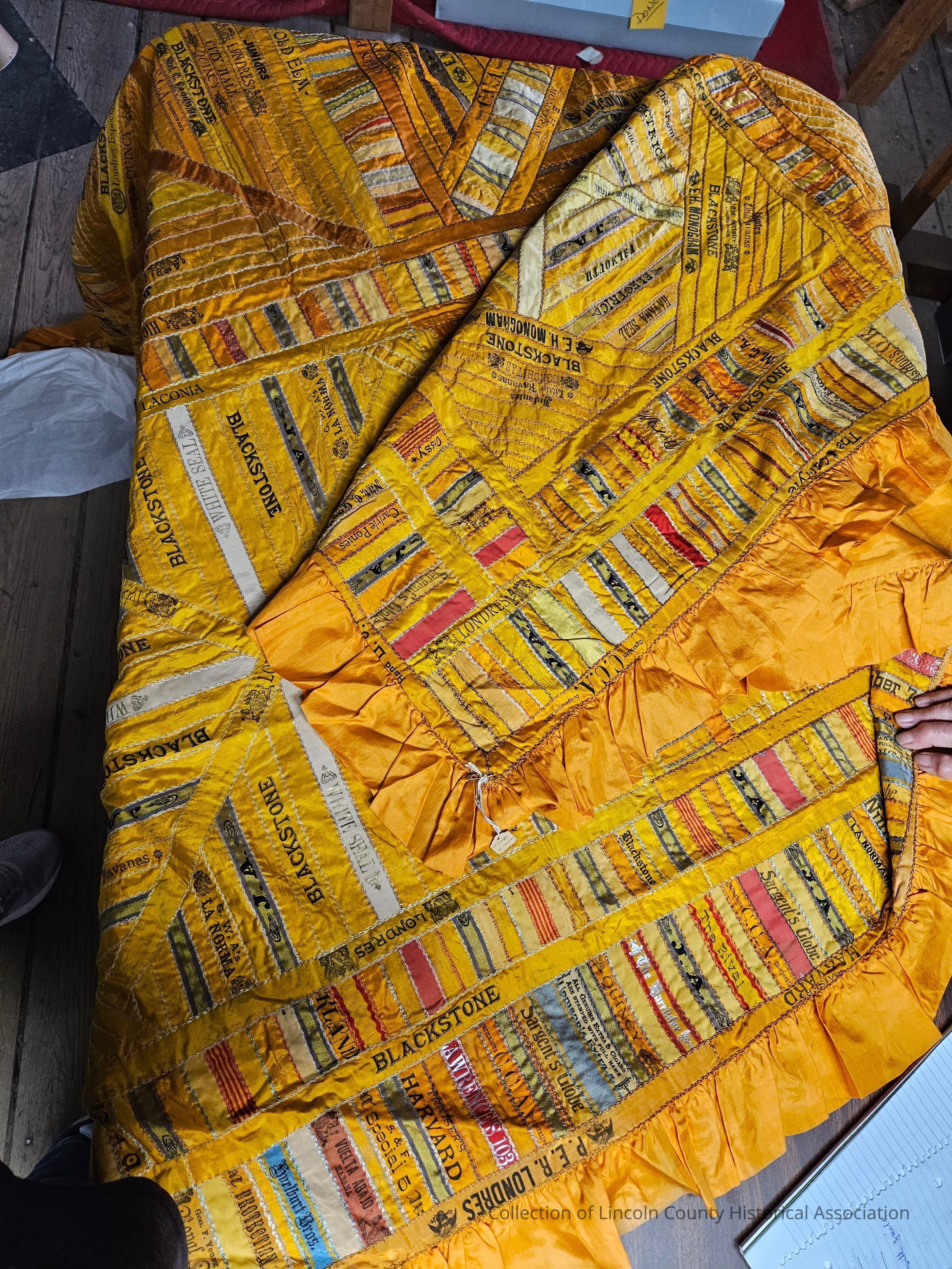 Bright orange silk cigar quilt. Inside filled with labels from cigar/cigarette boxes. Ruffled around the edges.Made/Created