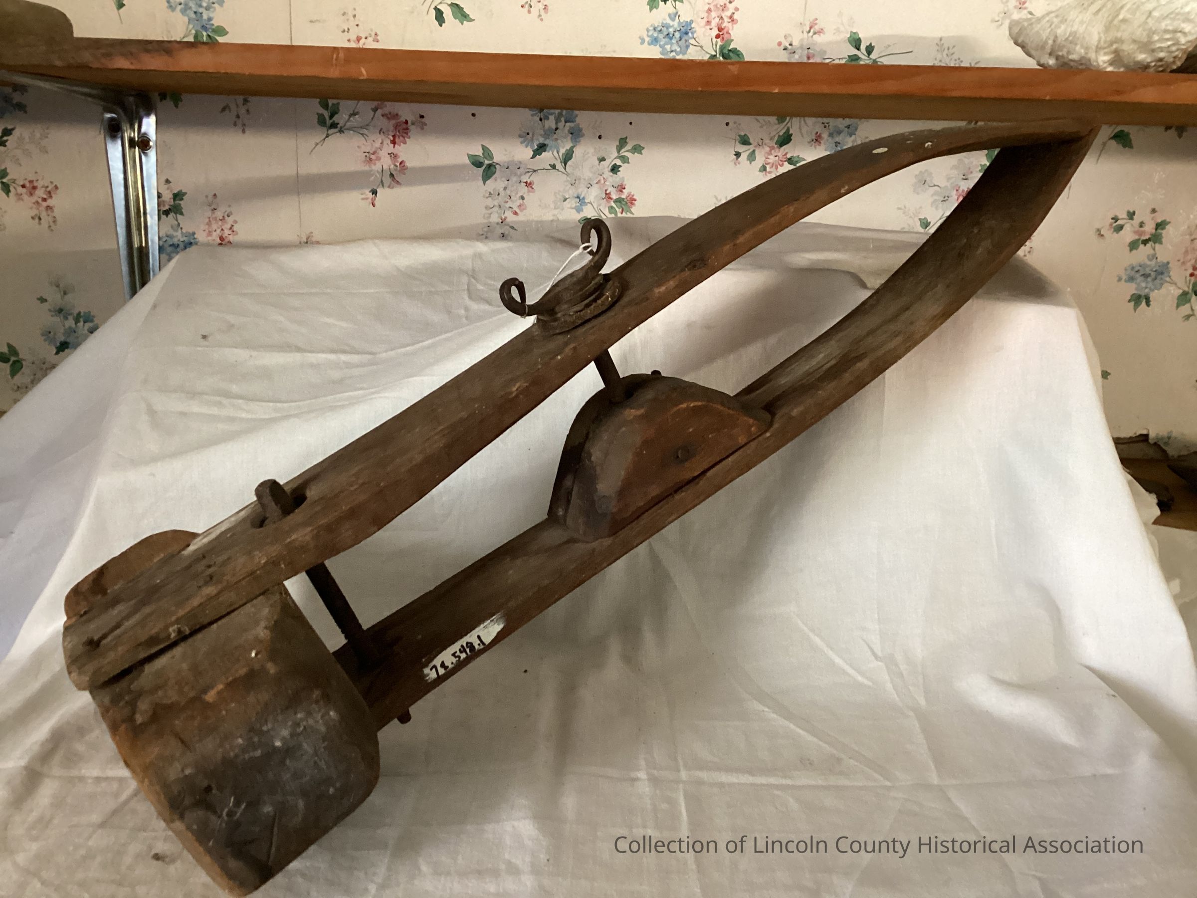 Harness maker's vice. Two inward curving boards nailed to a wooden block. Boards bolted above the block at base and with a screw-like metal shaft with a handle to tighten the boards.