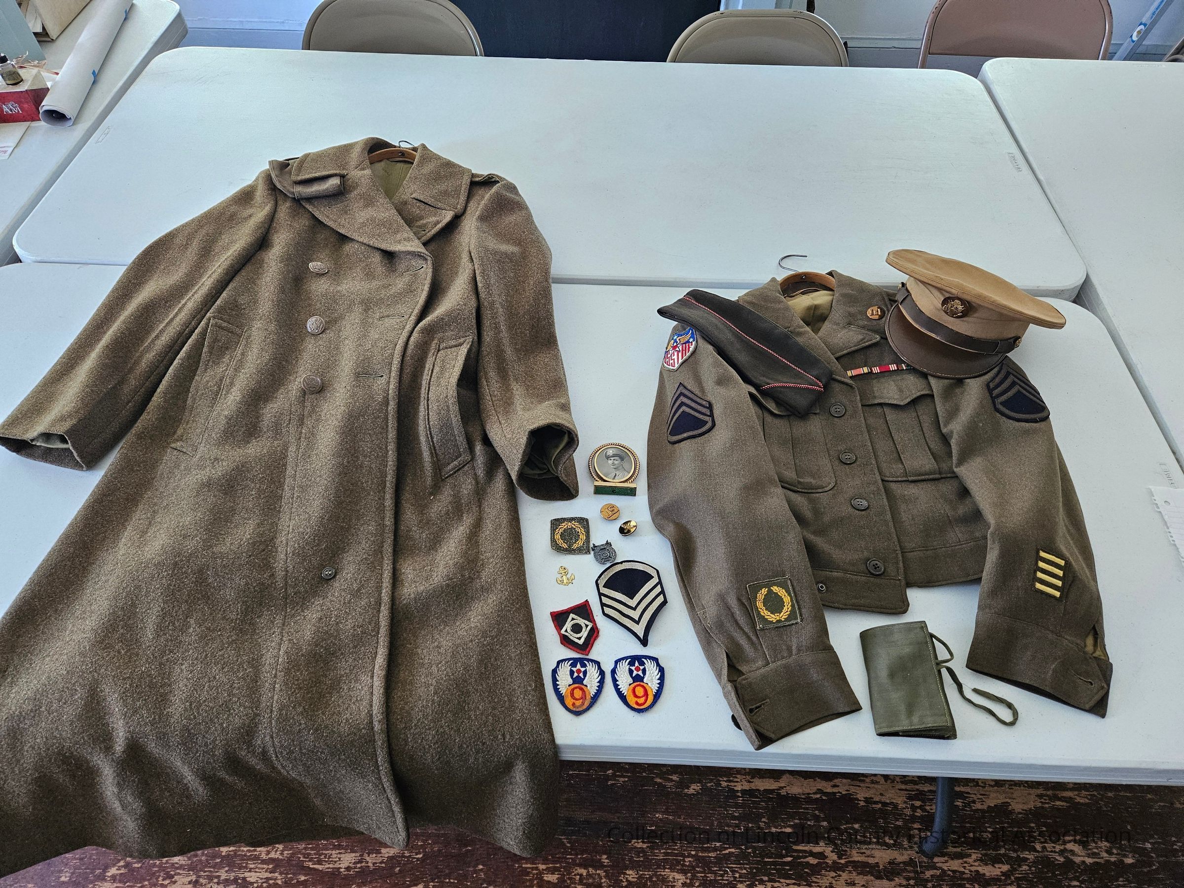 World War II uniform. Includes long coat and short uniform coat along with patches. Also included are two hats, one with brim and one soft fabric one. Photograph of soldier and sewing kit also included in set.Clothing/Dress/Costume Details