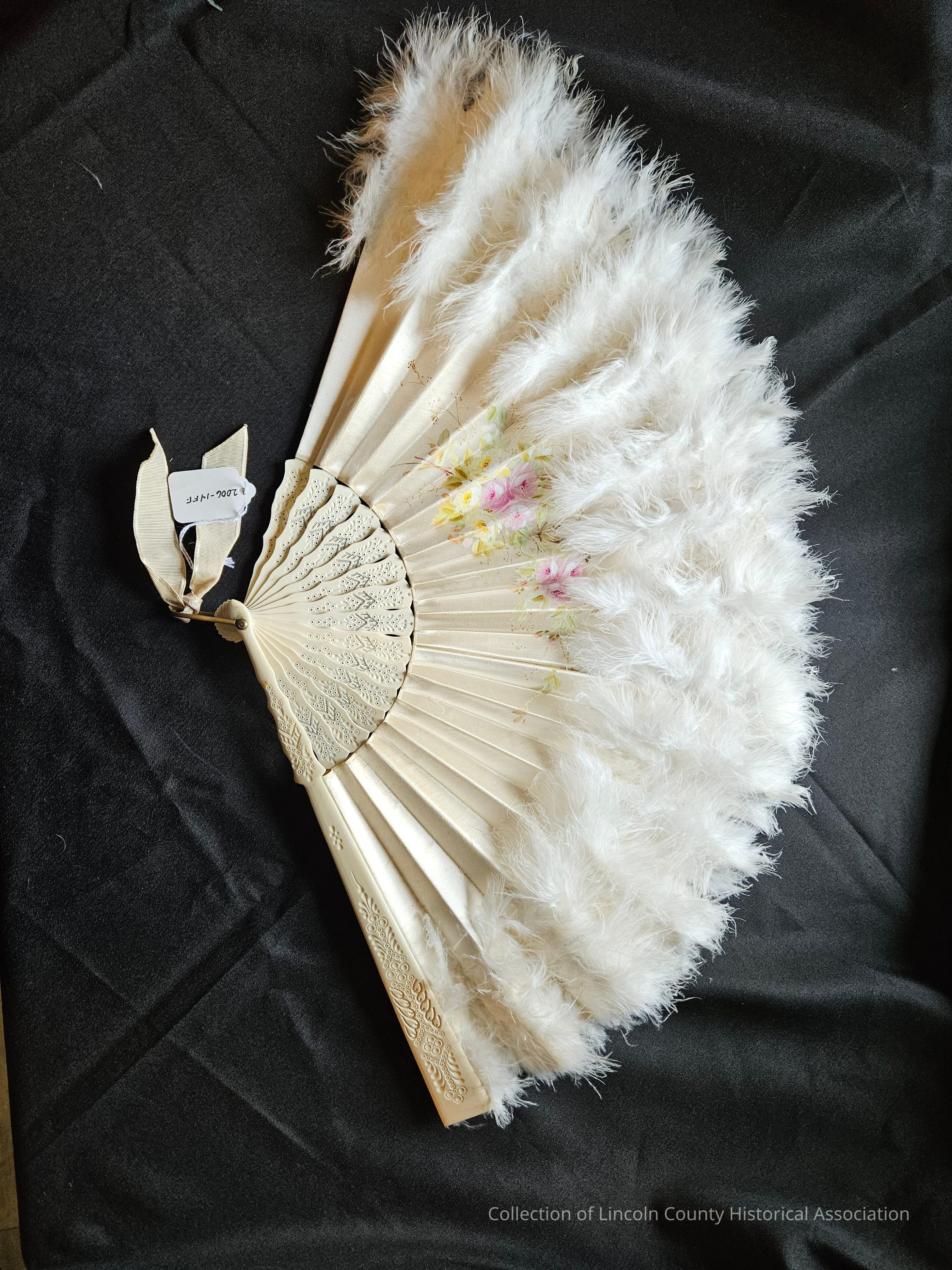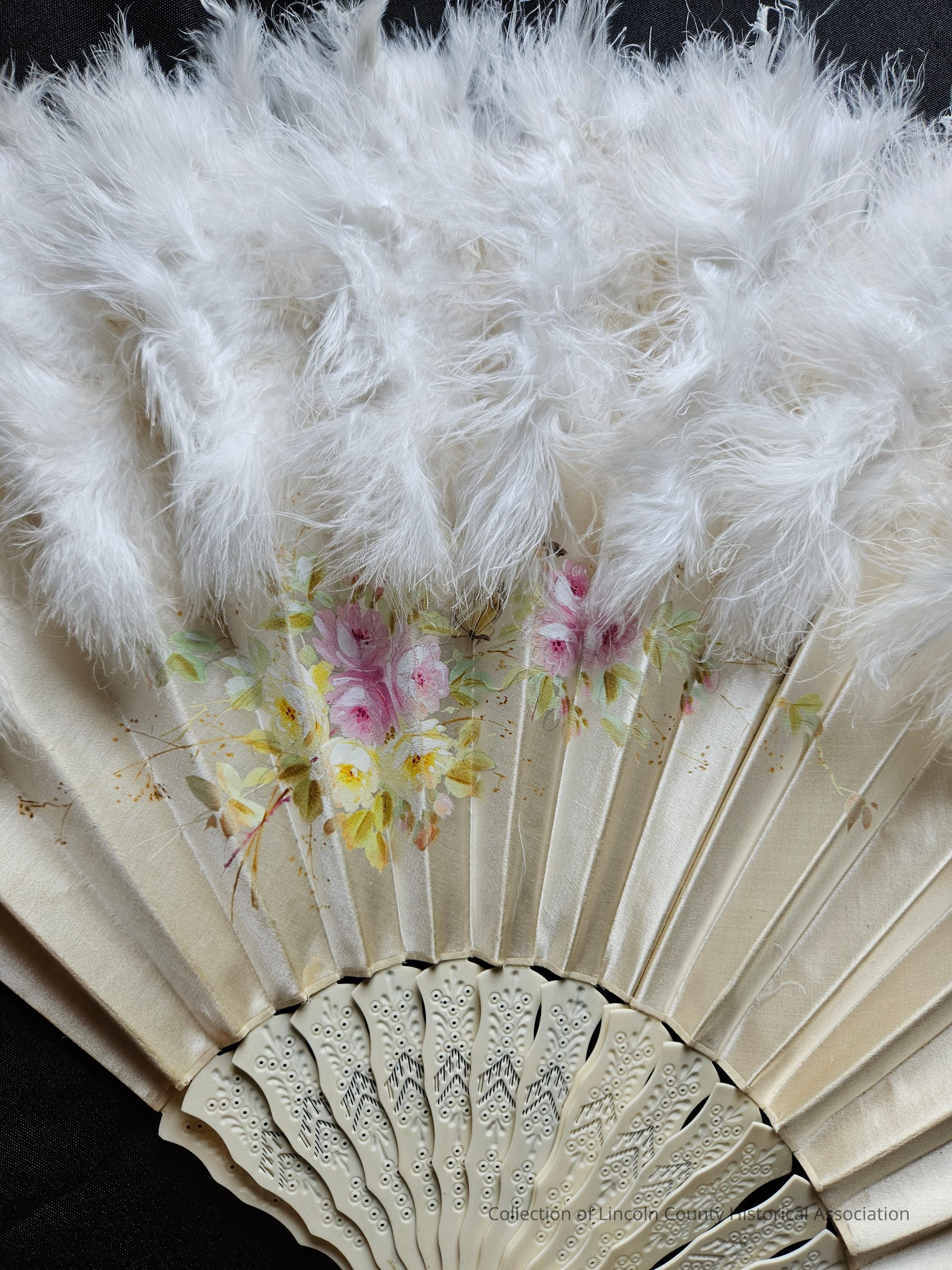 Satin fan with yellow and pink hand painted floral design and white ostrich feathers on top of leaves. 16 incised ivory sticks. Metal pivot with white ribbon attached.