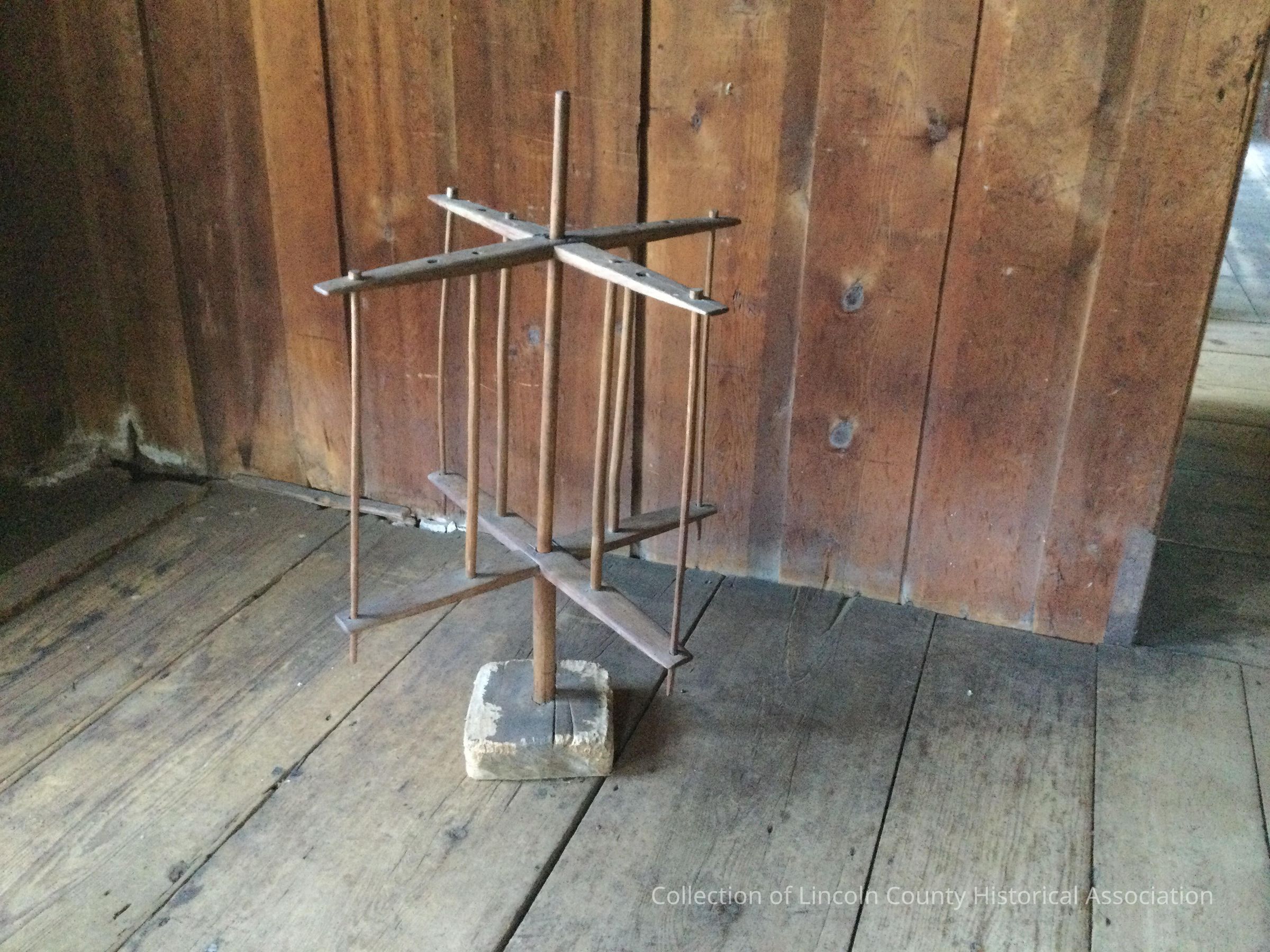 Wooden swift with its central shank set into a wooden block. Two parallel sets of four arms support sets of vertical wooden rodsMade/Created
