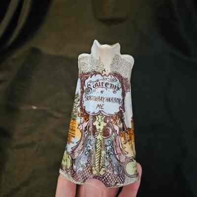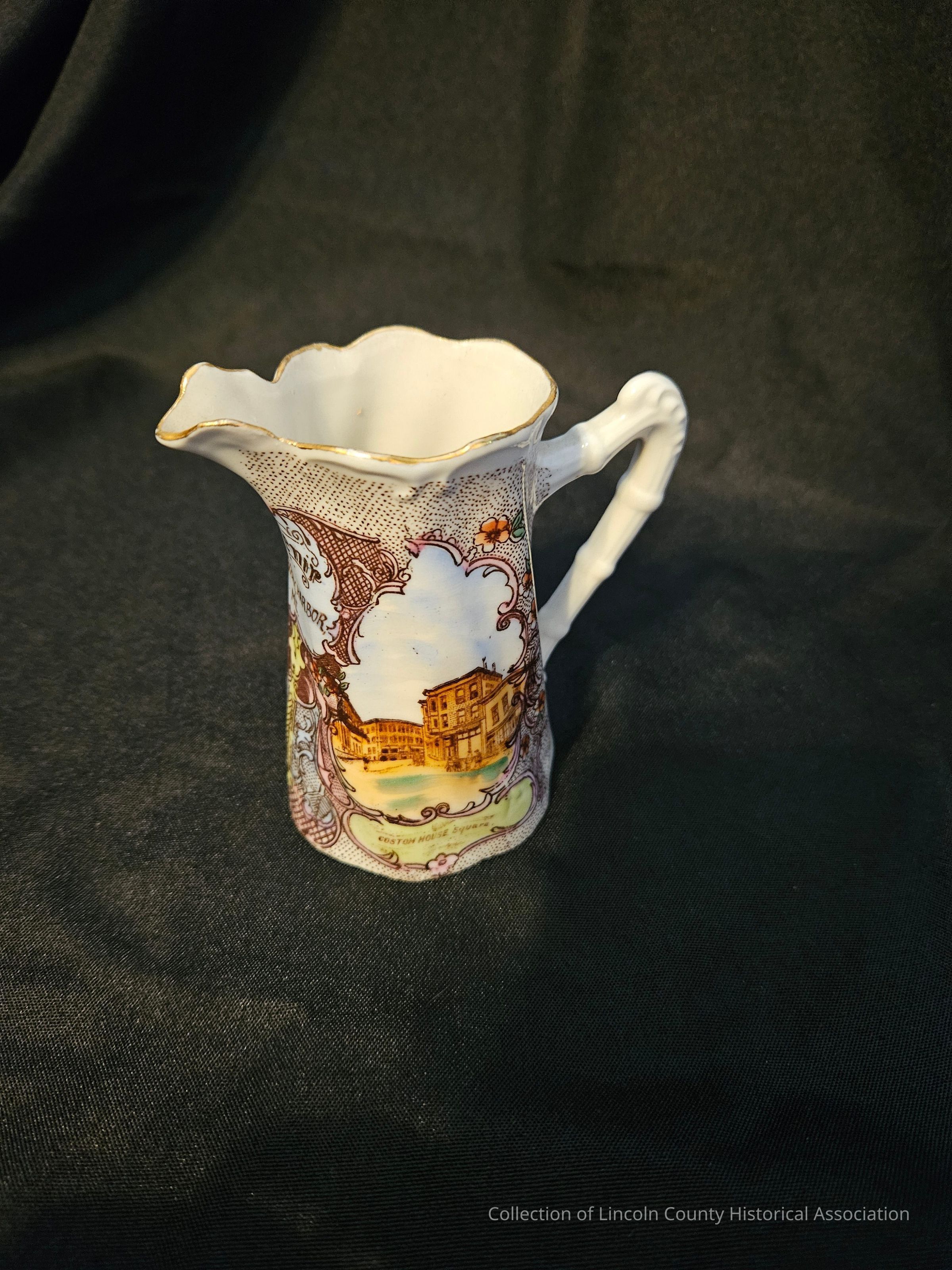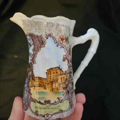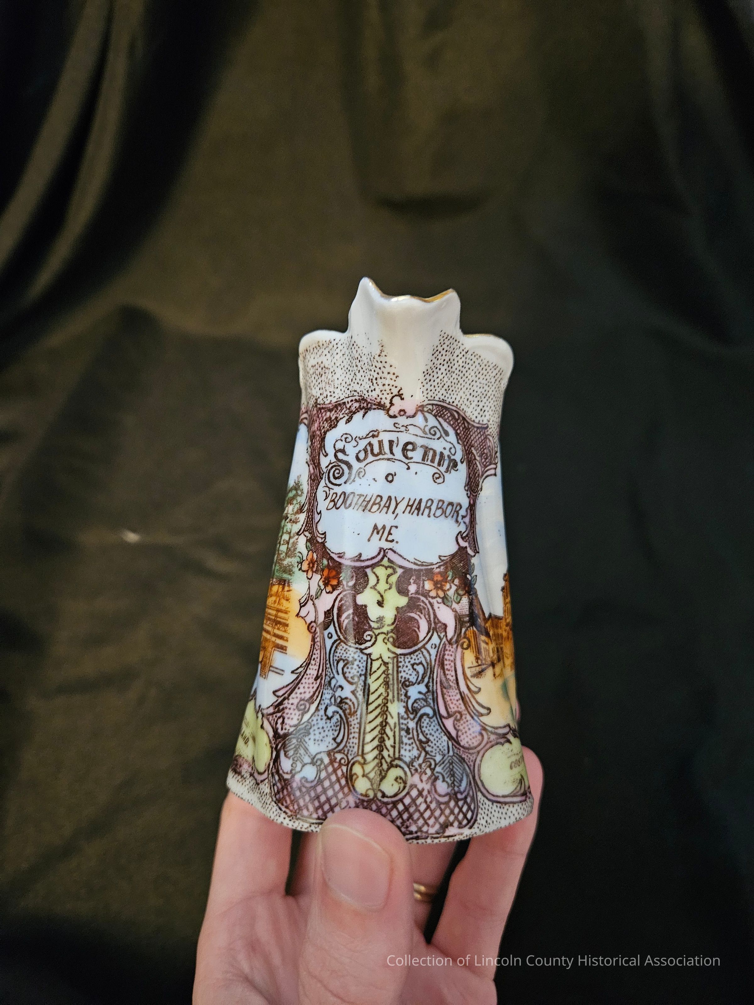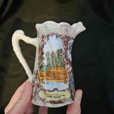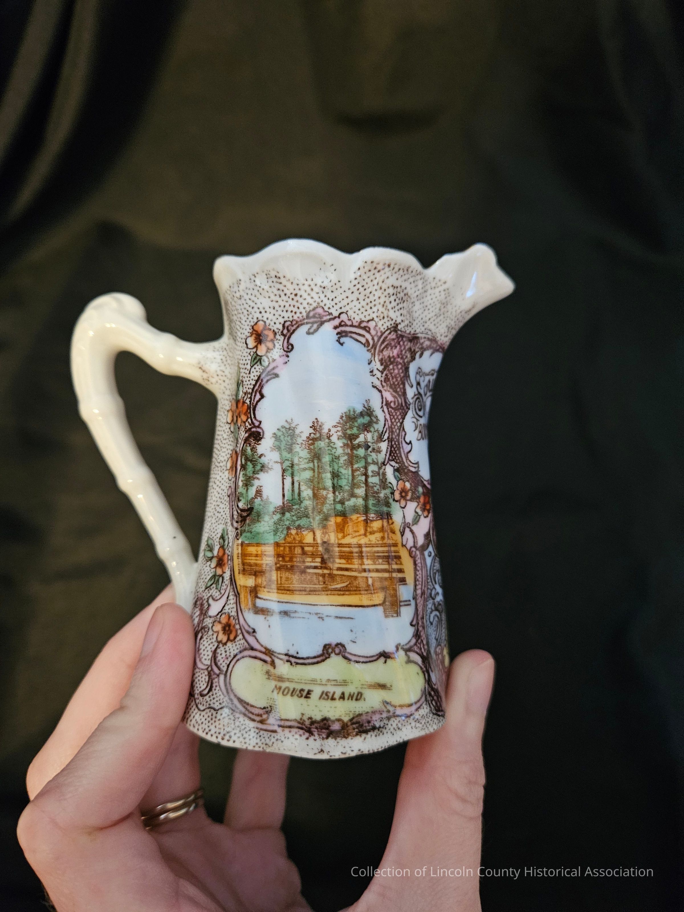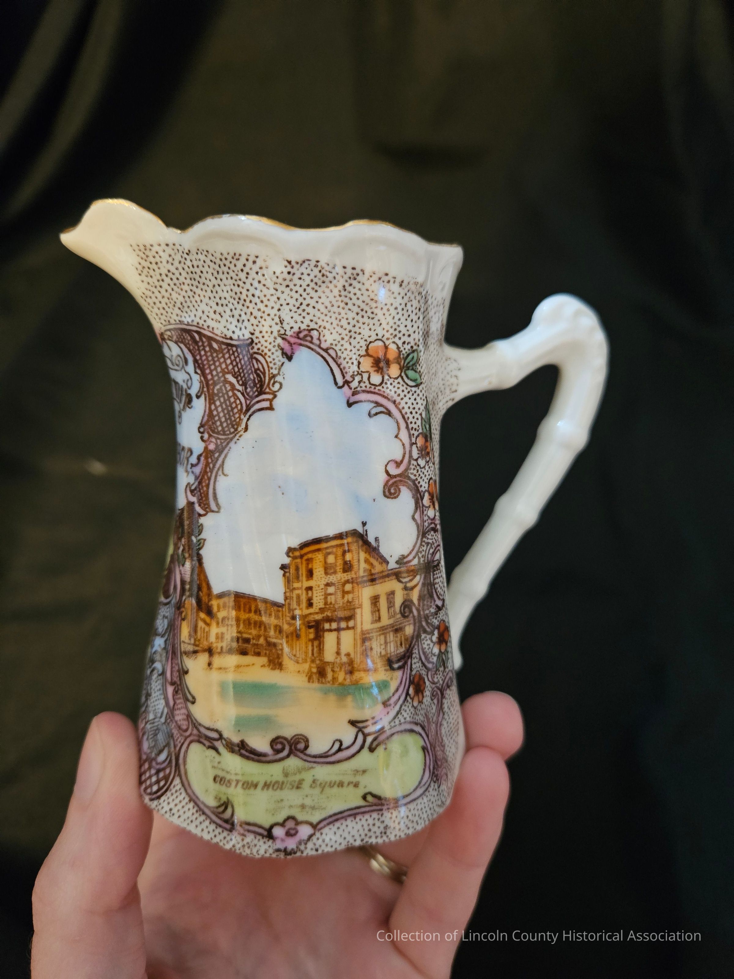 Small souvenir pitcher/cup. Images of the custom house square and Mouse Island in Boothbay Harbor on the cup. Decorative purple, blue, and green swirls and flowers surround images. Also small purple dots surrounding images. Gold lining rim of pitcher.Made/Created