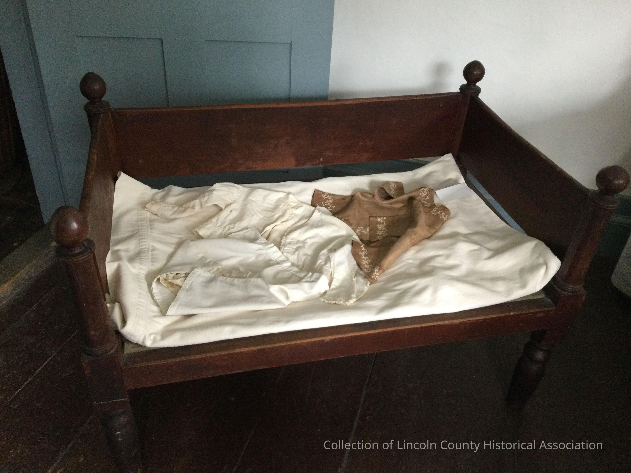 Wooden bed with one lateral side missing for easier handling of the child from an adjacent adult's bed