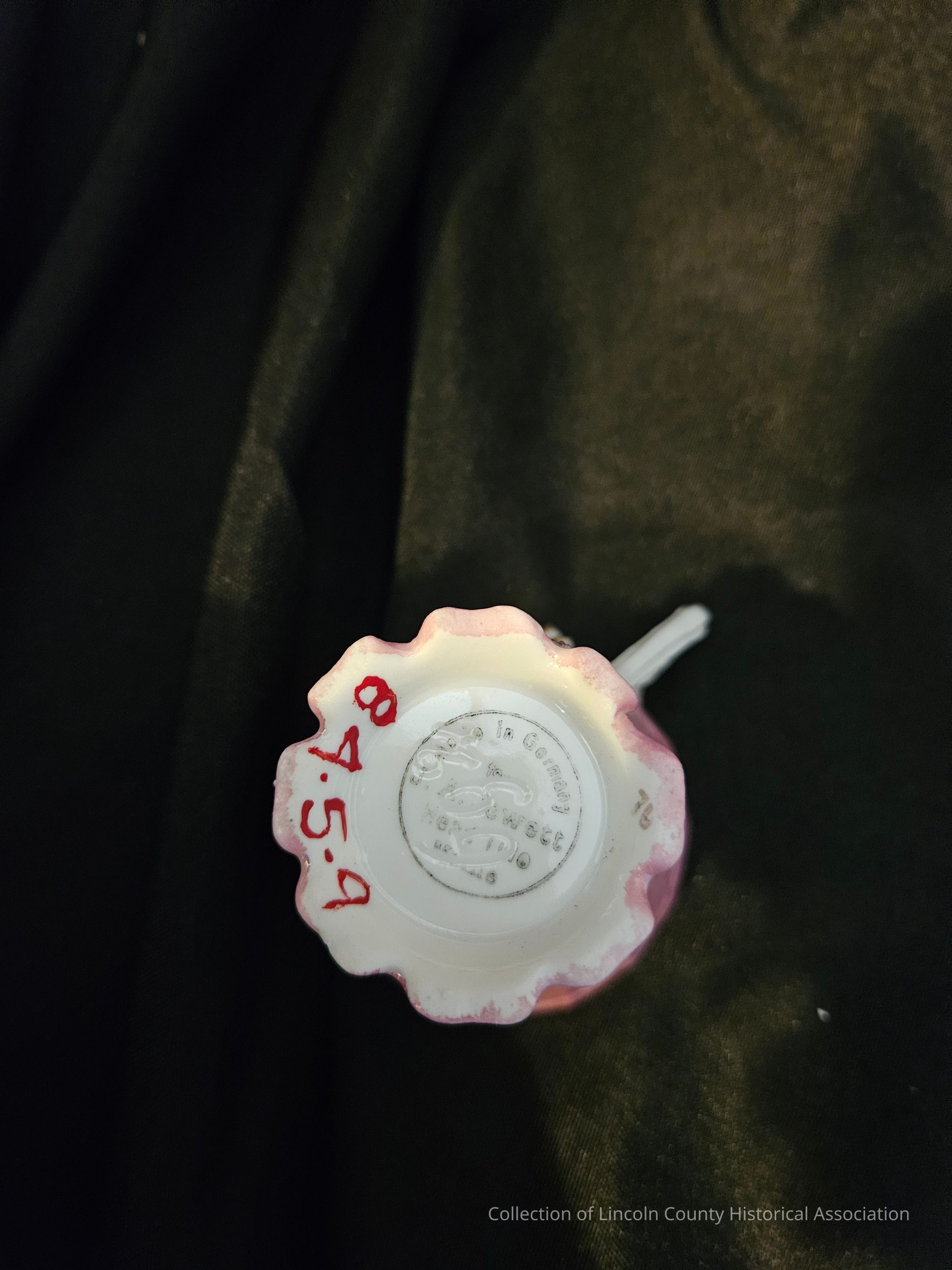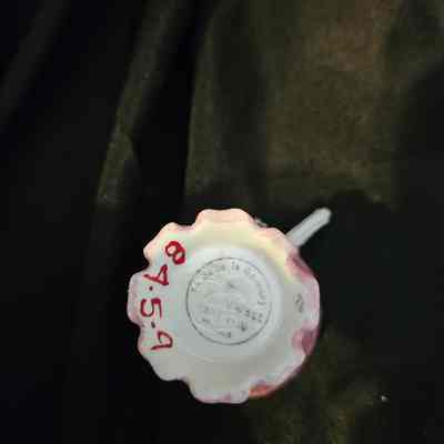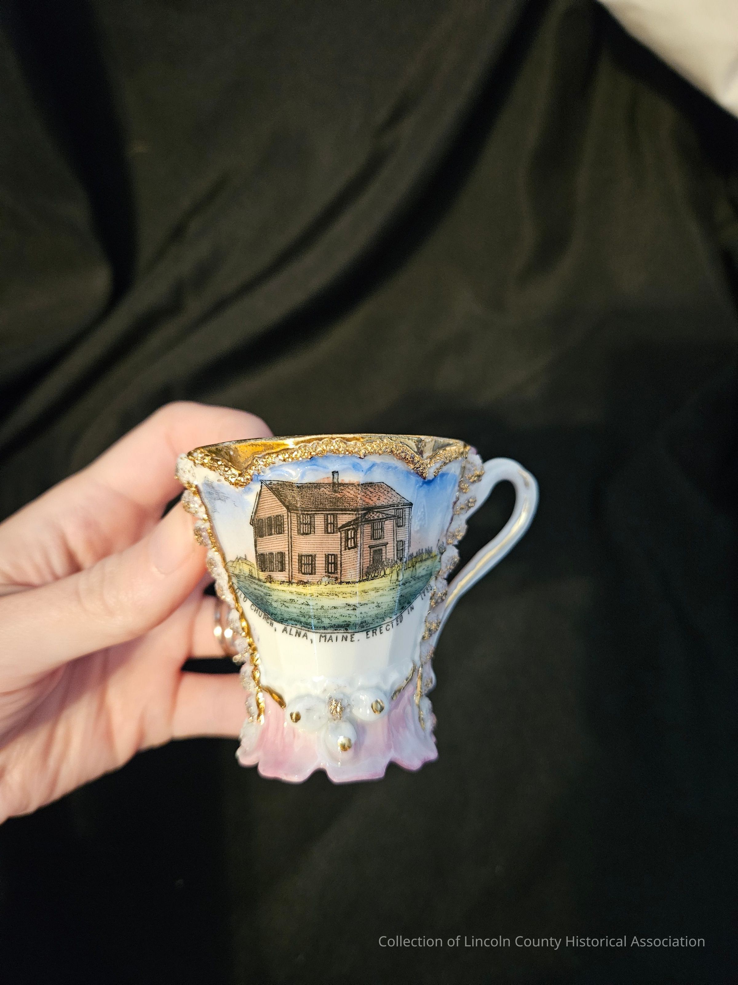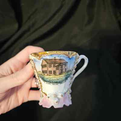 China souvenir cup. Image of Old Church in Alna in center of cup. Raised fancy gold design around image.