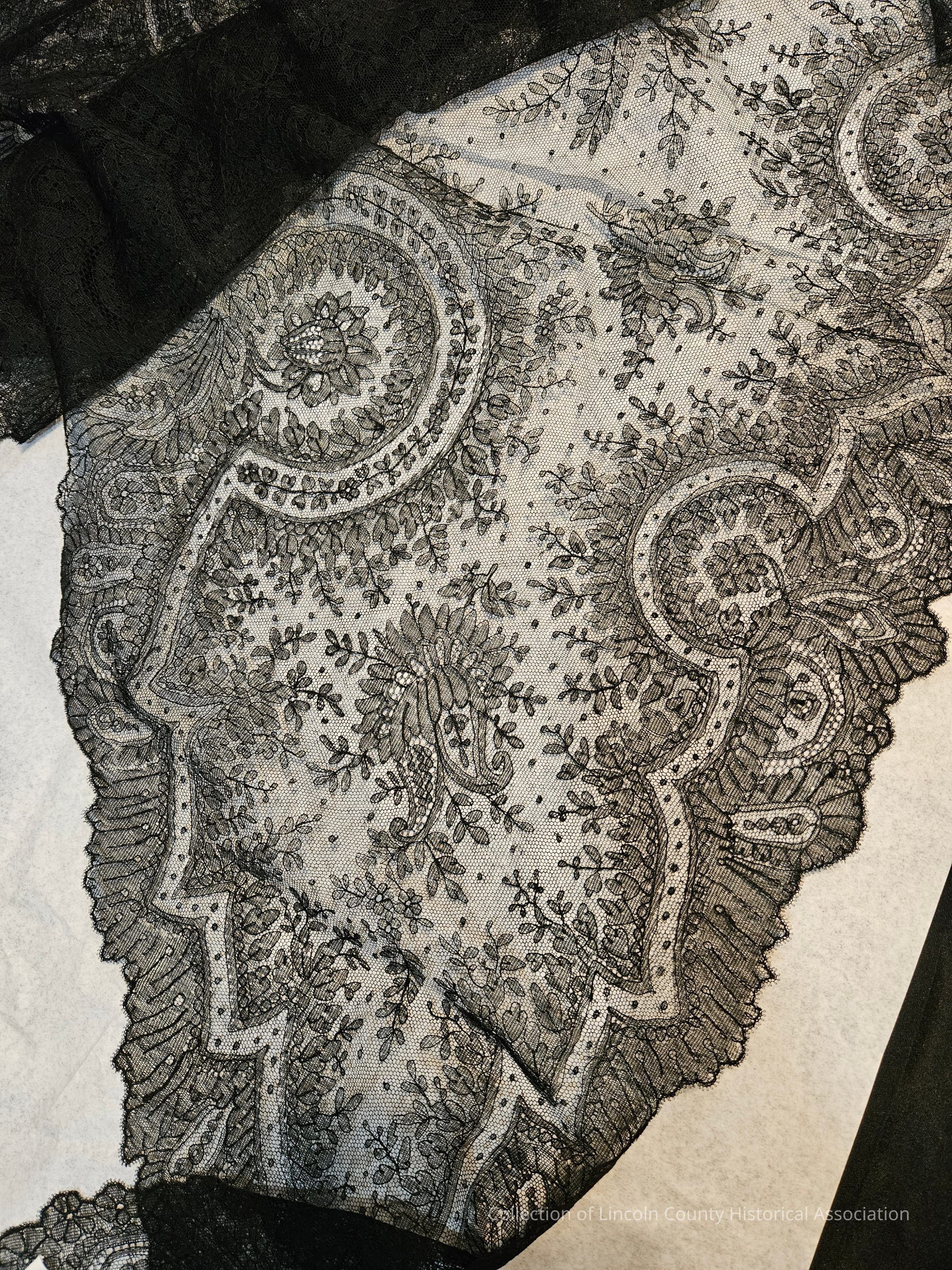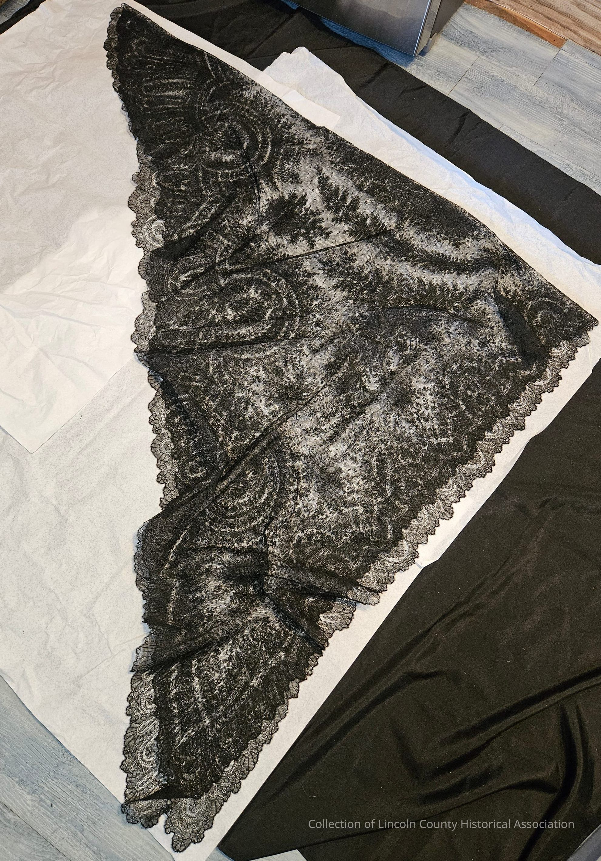 Large black lace triangular shawl. Scalloped edges. Floral and circle designs around edges, larger flowers in the center. Machine made.Clothing/Dress/Costume Details