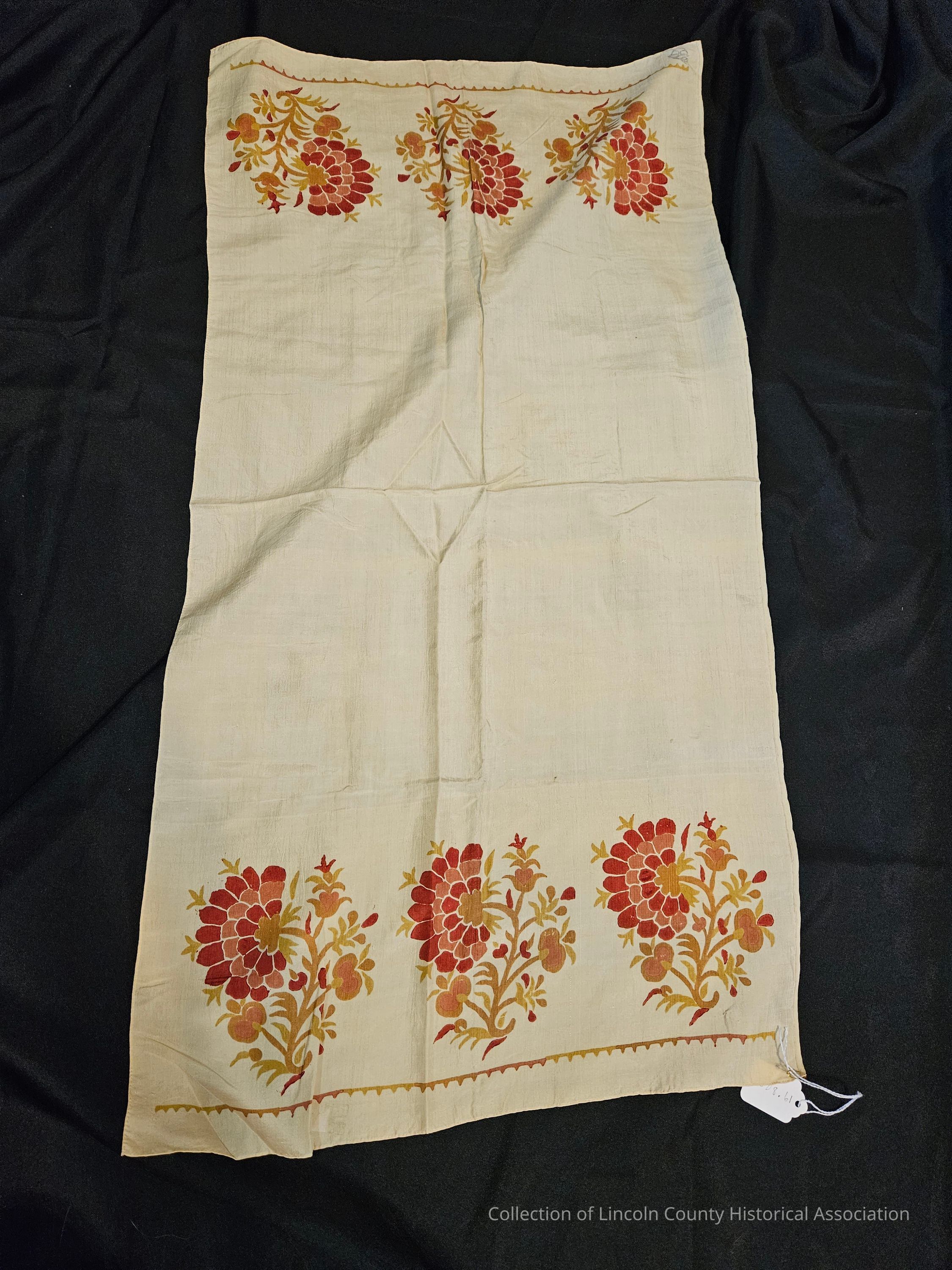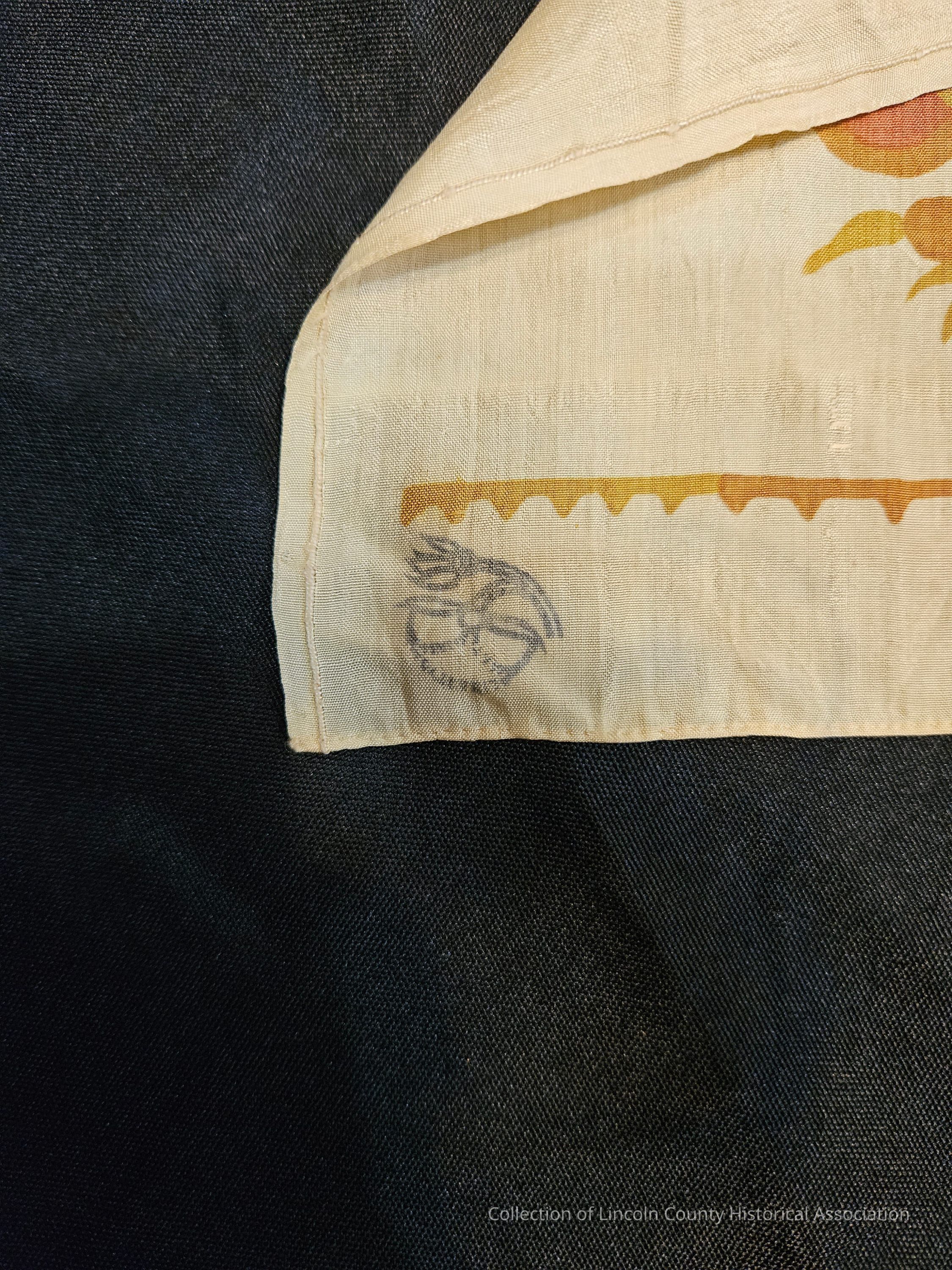 Cream colored silk scarf. Three red flowers on each end of scarf. Line and triangle designs also on each end. Faint blue maker's mark in the corner.