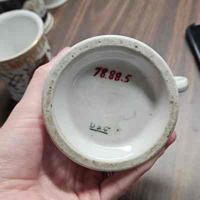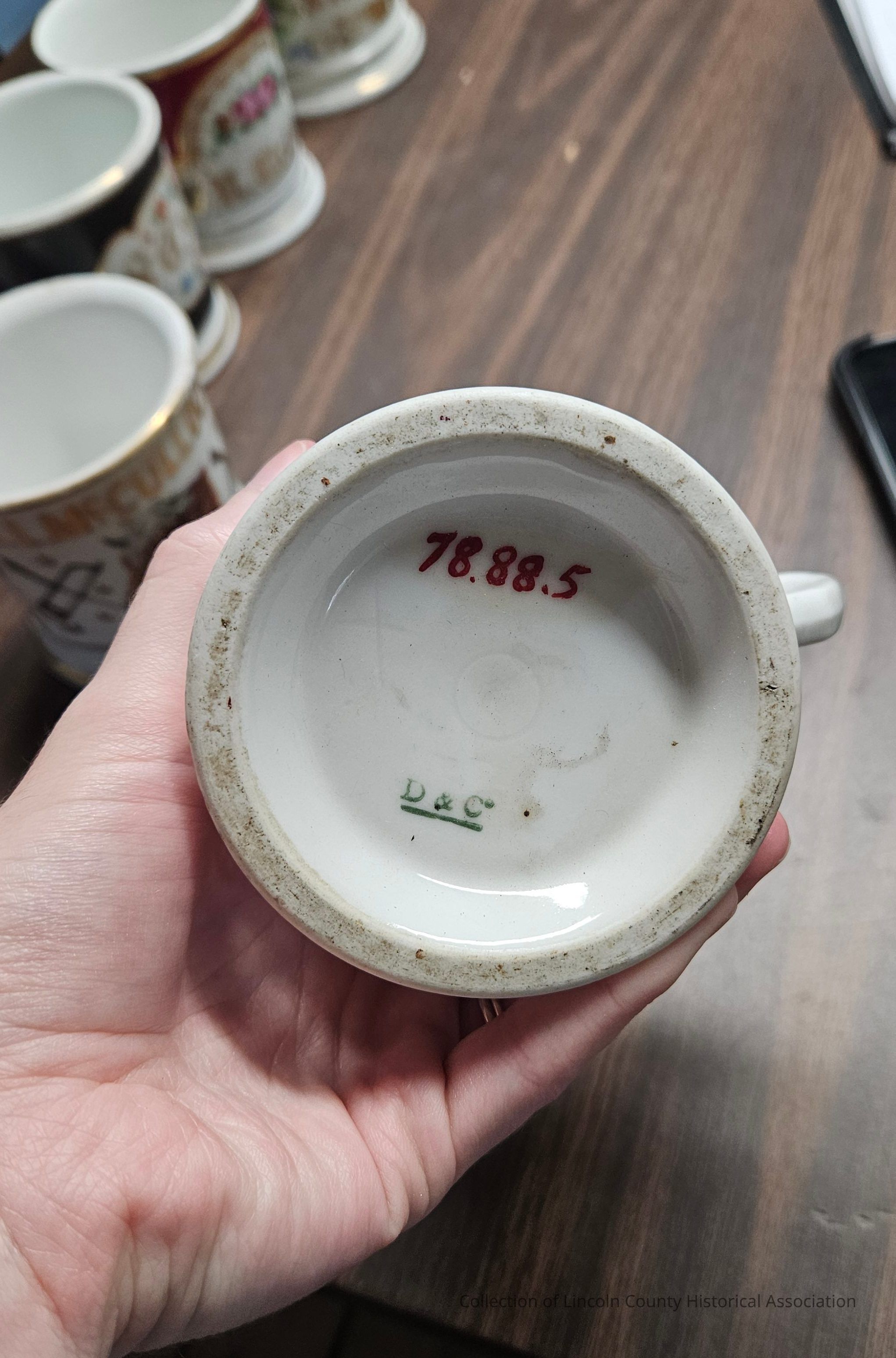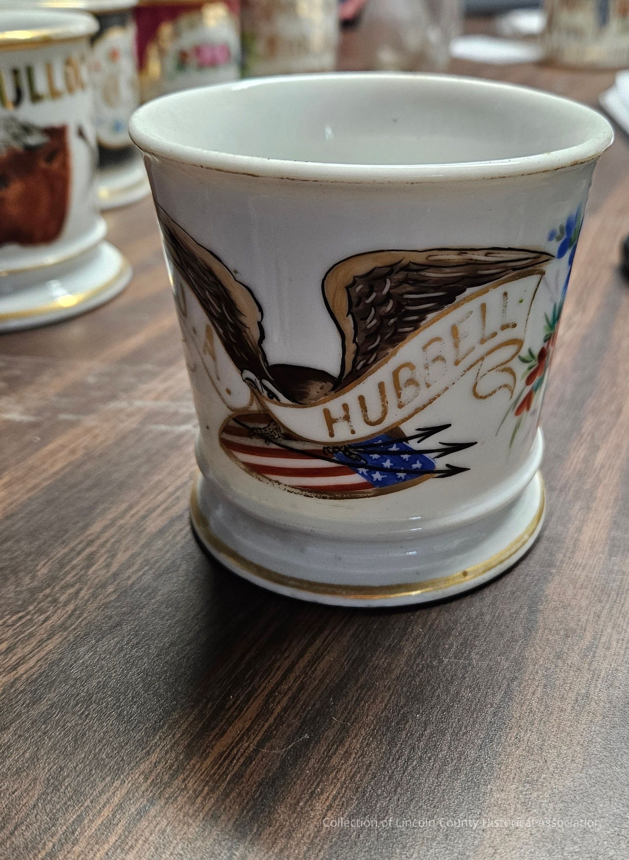White shaving mug with elaborate floral pattern. Eagle in the center holding arrows and standing above flag. Eagle also holds banner with name "J.A. Hubbell." White handle.