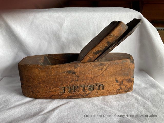 Smoothing plane. Its iron blade ends with a steel cutting edge. Wooden block tapers from the middle to either end.Made/Created