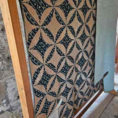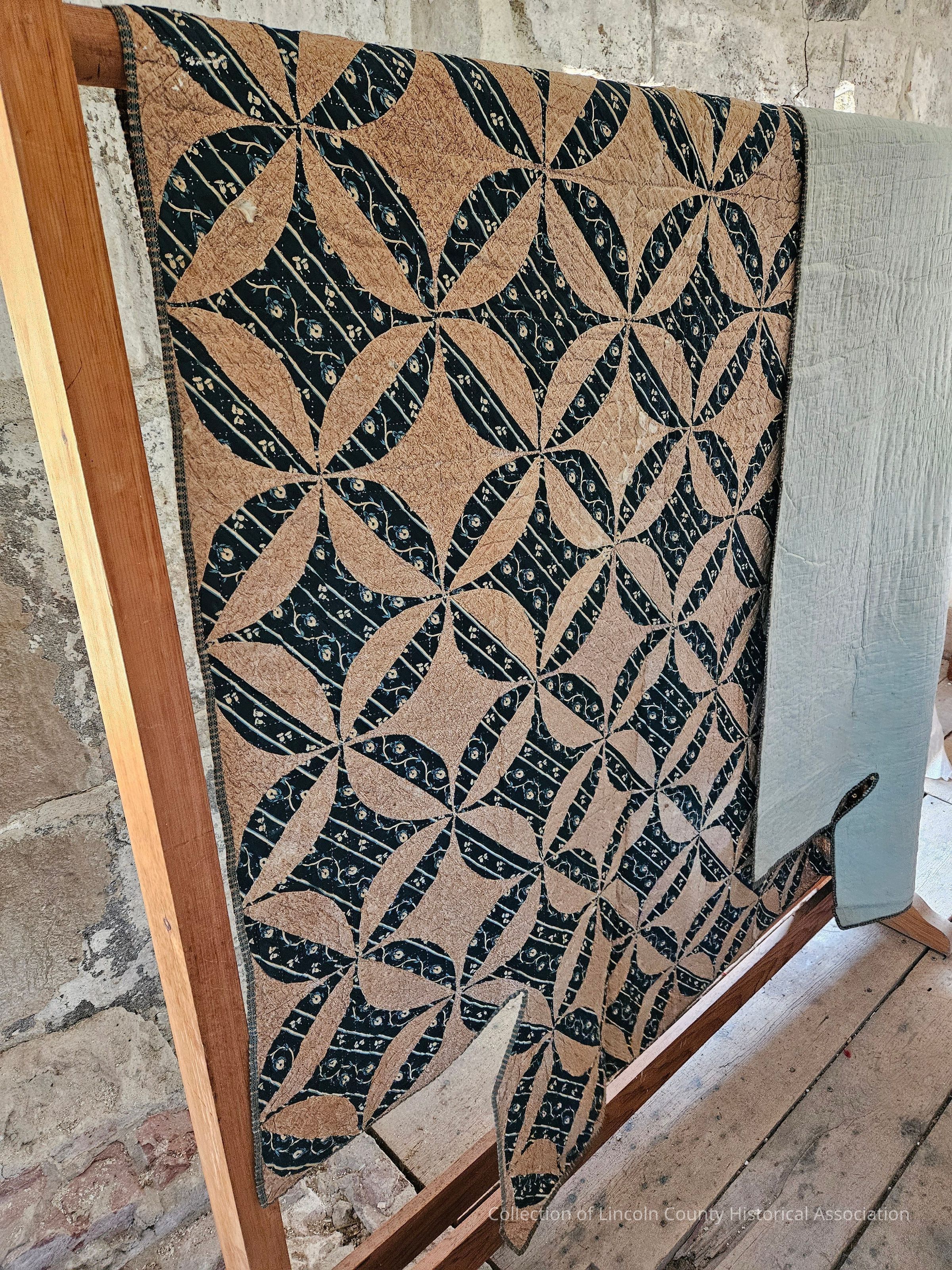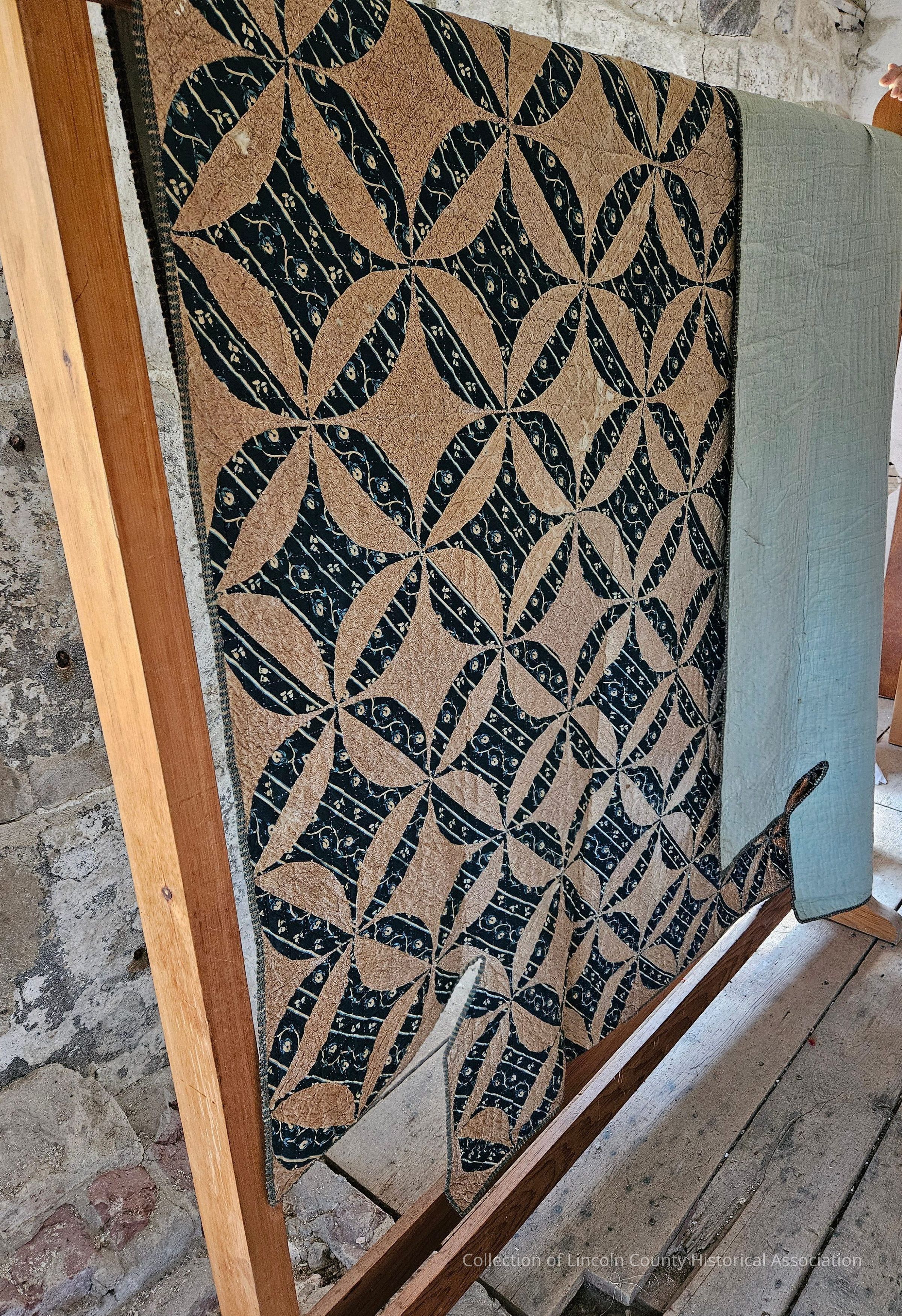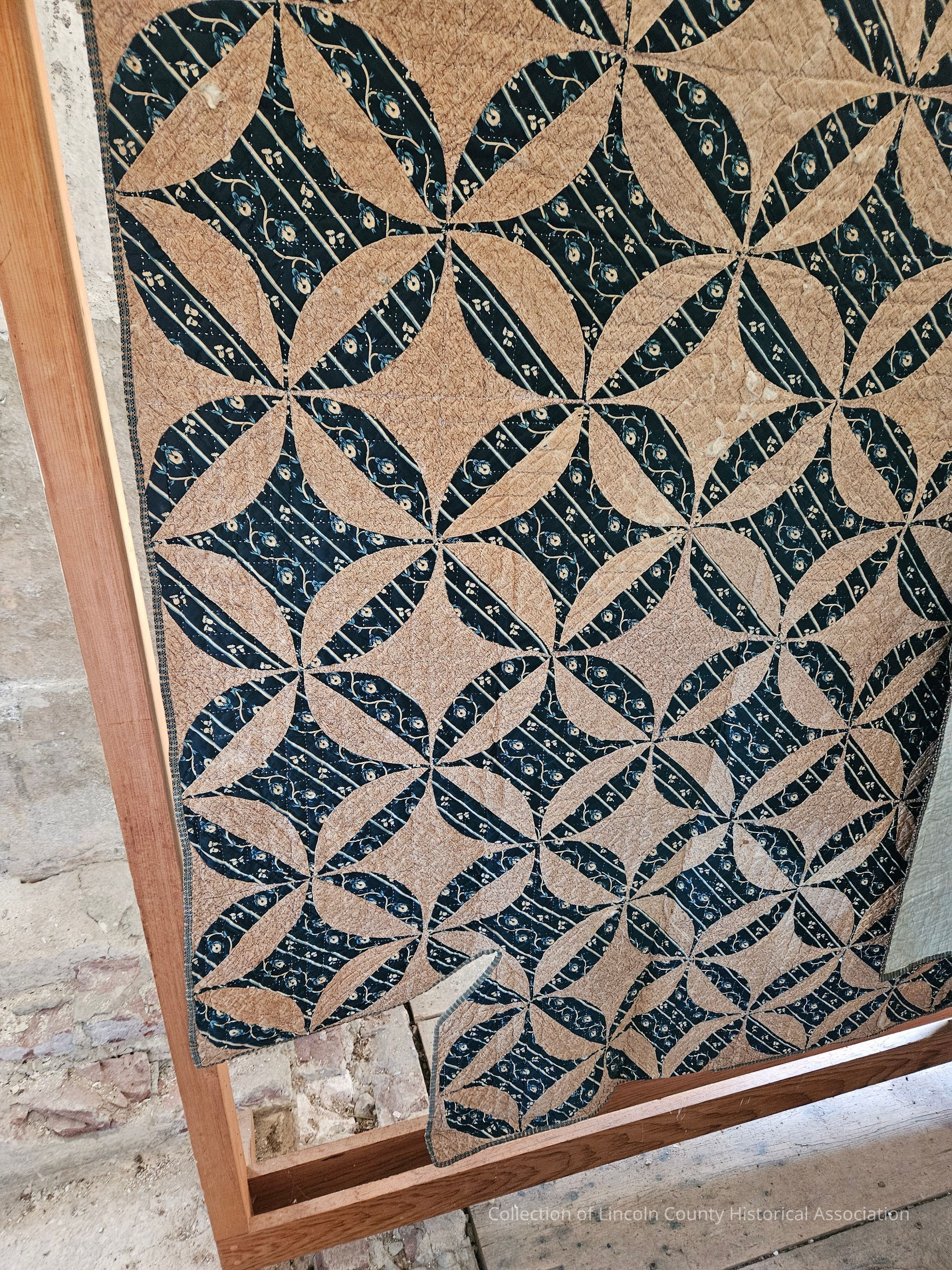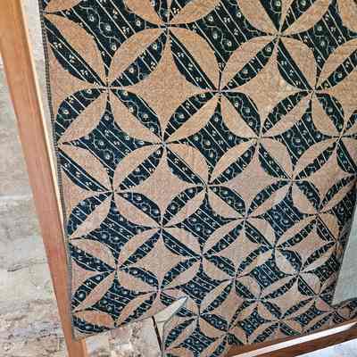 Pieced and quilted blue and tan orange peel pattern quilt. Two fabrics used, one blue with tan stripes and sprigs, the other marbleized tan. Overall pattern blue and tan interlocking circles with blue diamonds. Border is of a different, third fabric. Plain blue cotton backing. Triangular cut outs for bed posts.Made/Created