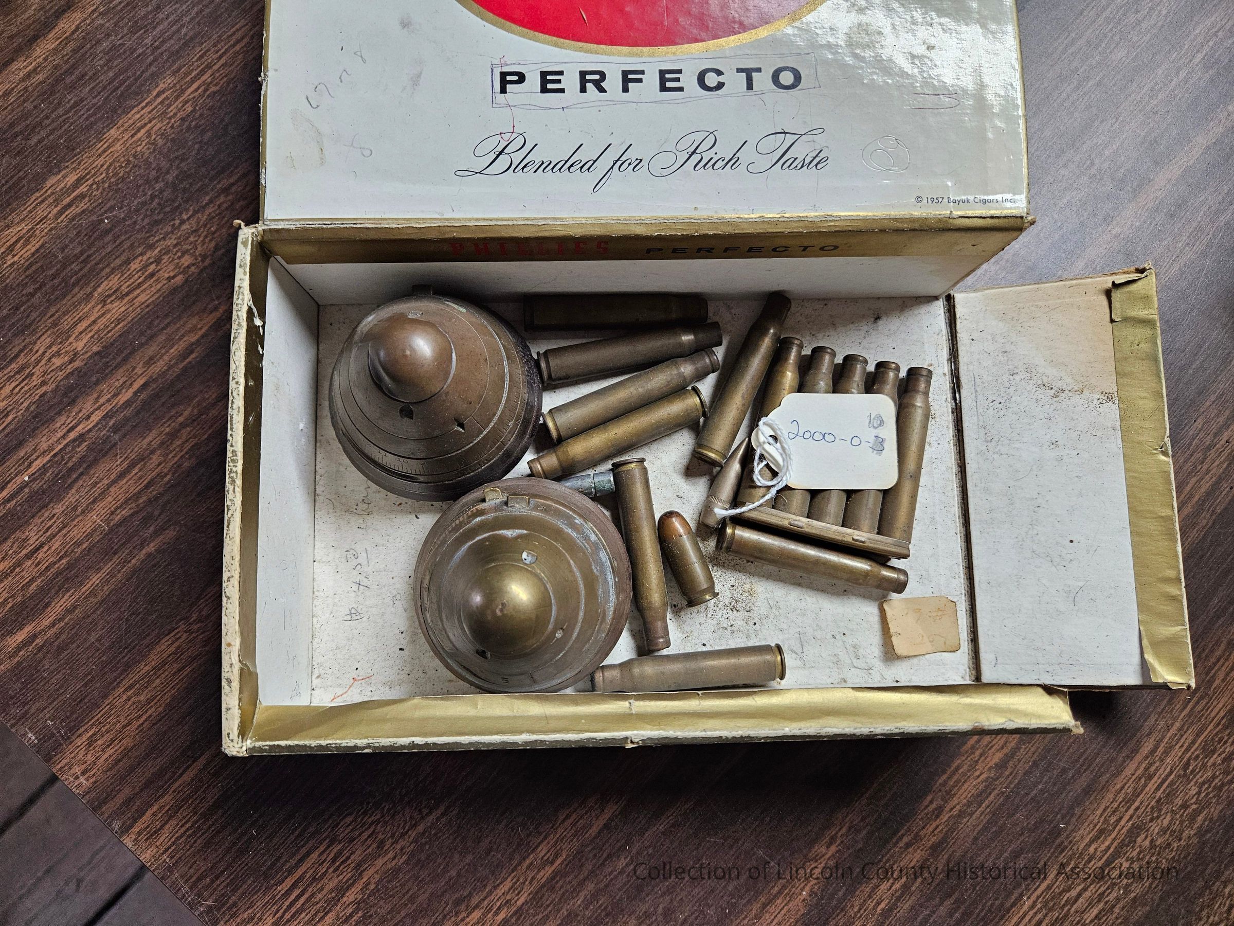 Box of World War I era bullets, casings, and two artillery warheads. Also included is a stripper clip. Bullets are .30-06 caliber and likely are for 1903 or 1917 model Springfield.Made/Created