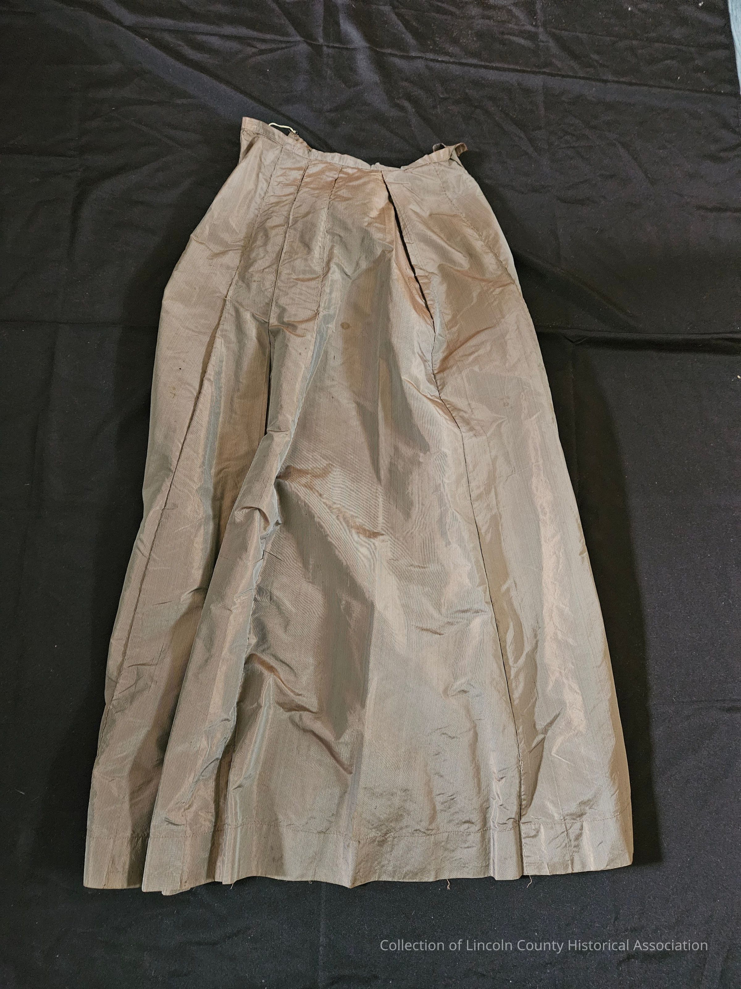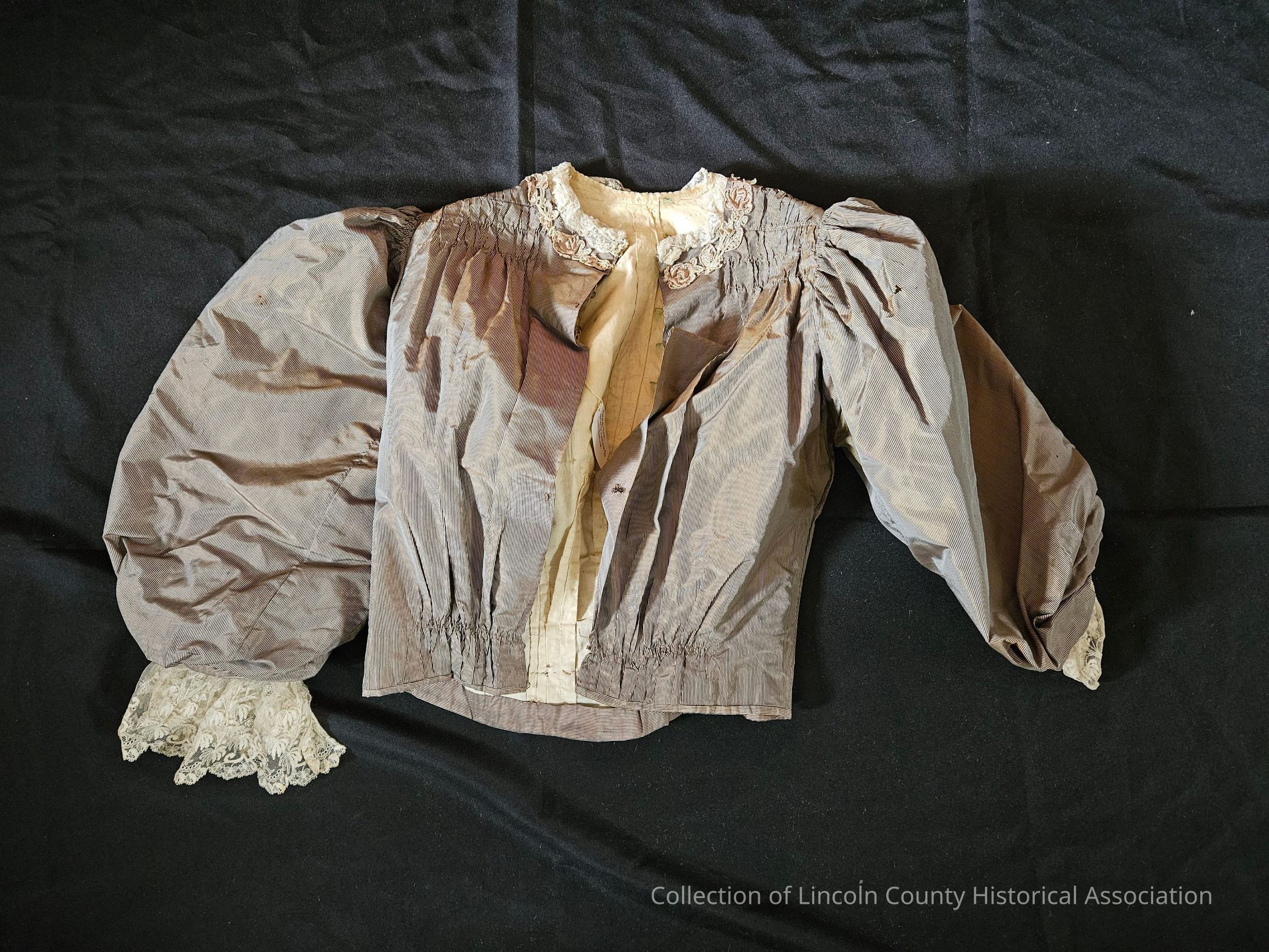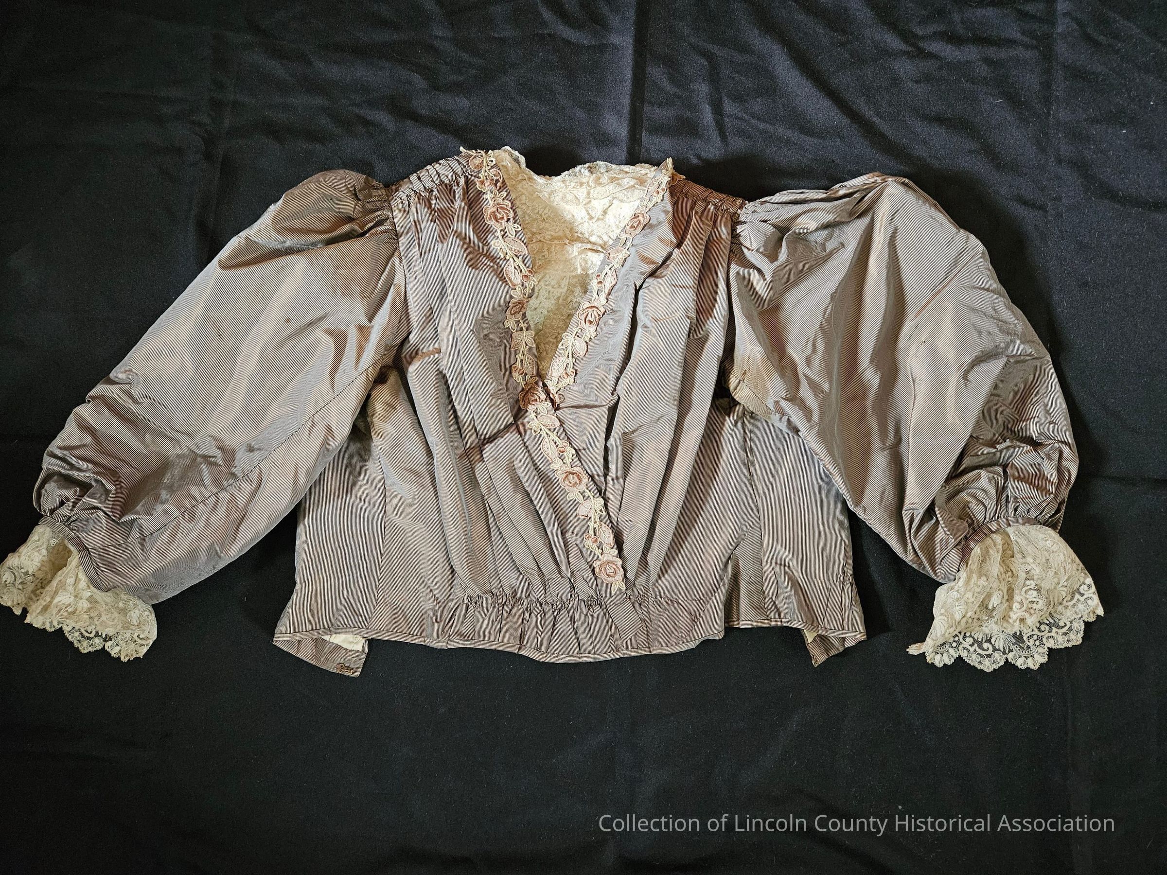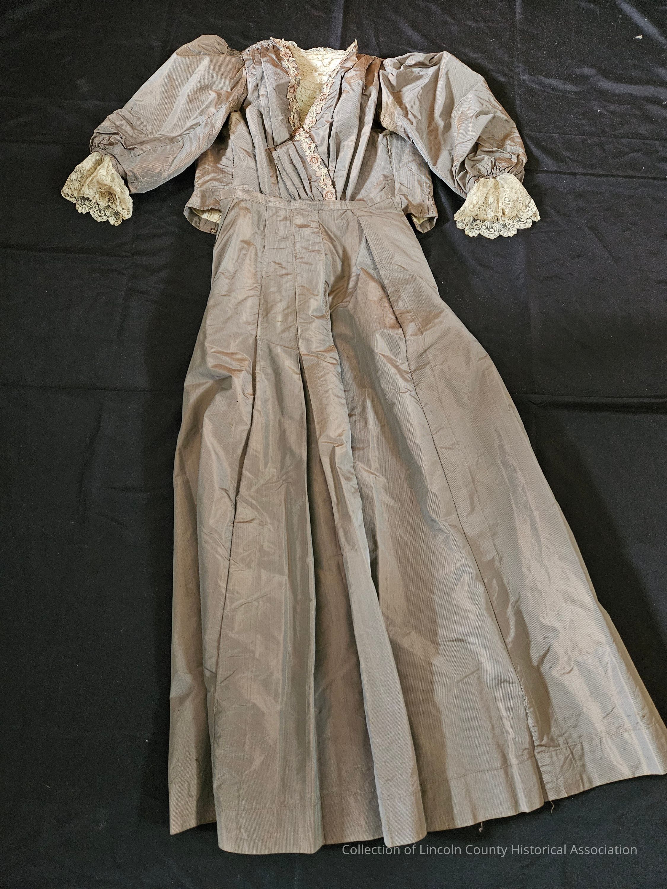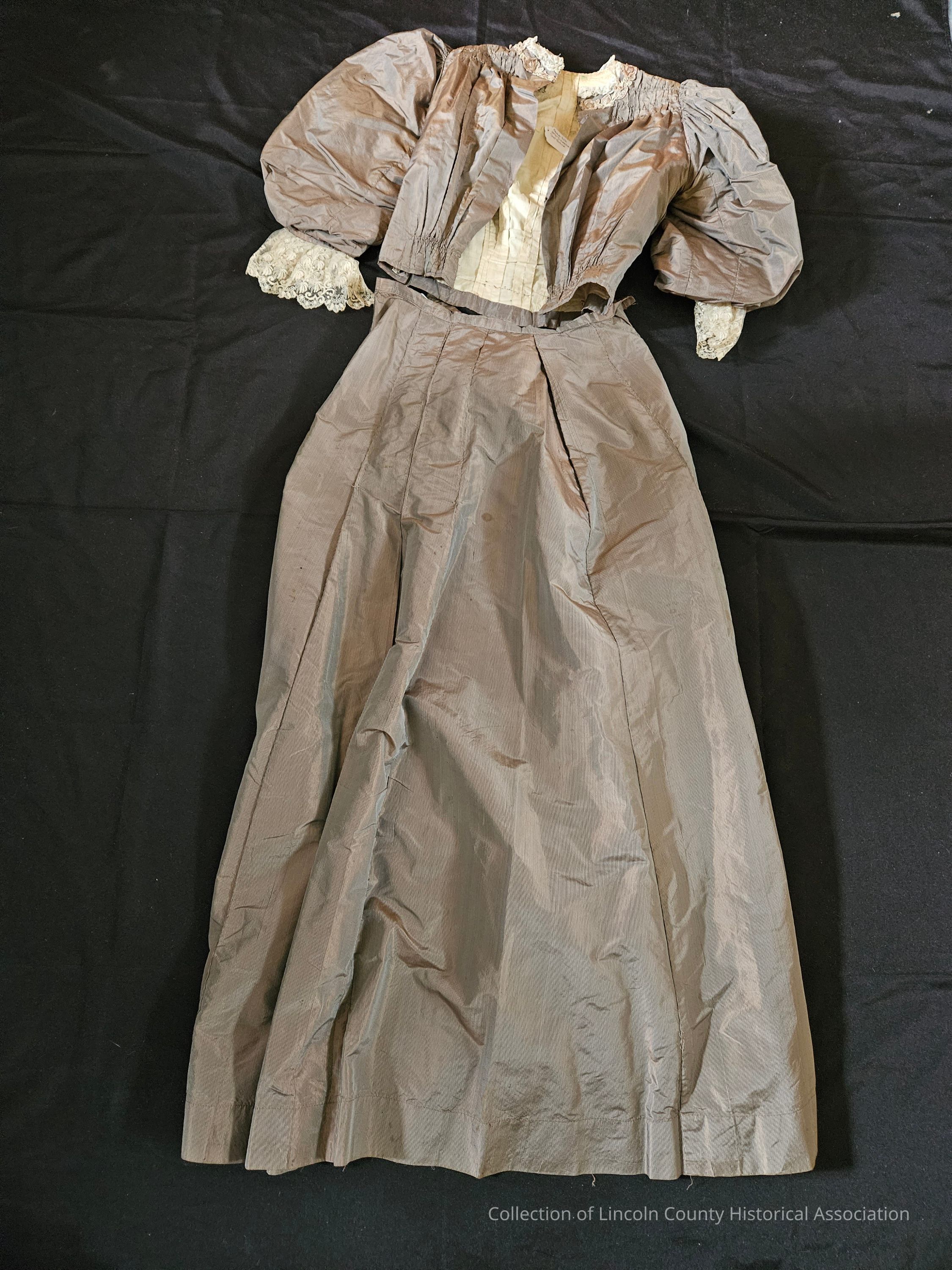 Brown striped silk matching bodice and skirt. Bodice has lace at cuffs and collar. "V" shaped design in the front with ruffled lace at the center and floral embroidery surrounding the lace portion and moving down in a line to the waist. Bodice is gathered at waist and boned. Metal clasp closures at the back. Skirt is lightweight with metal clasp closures at one side.Clothing/Dress/Costume Details