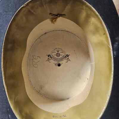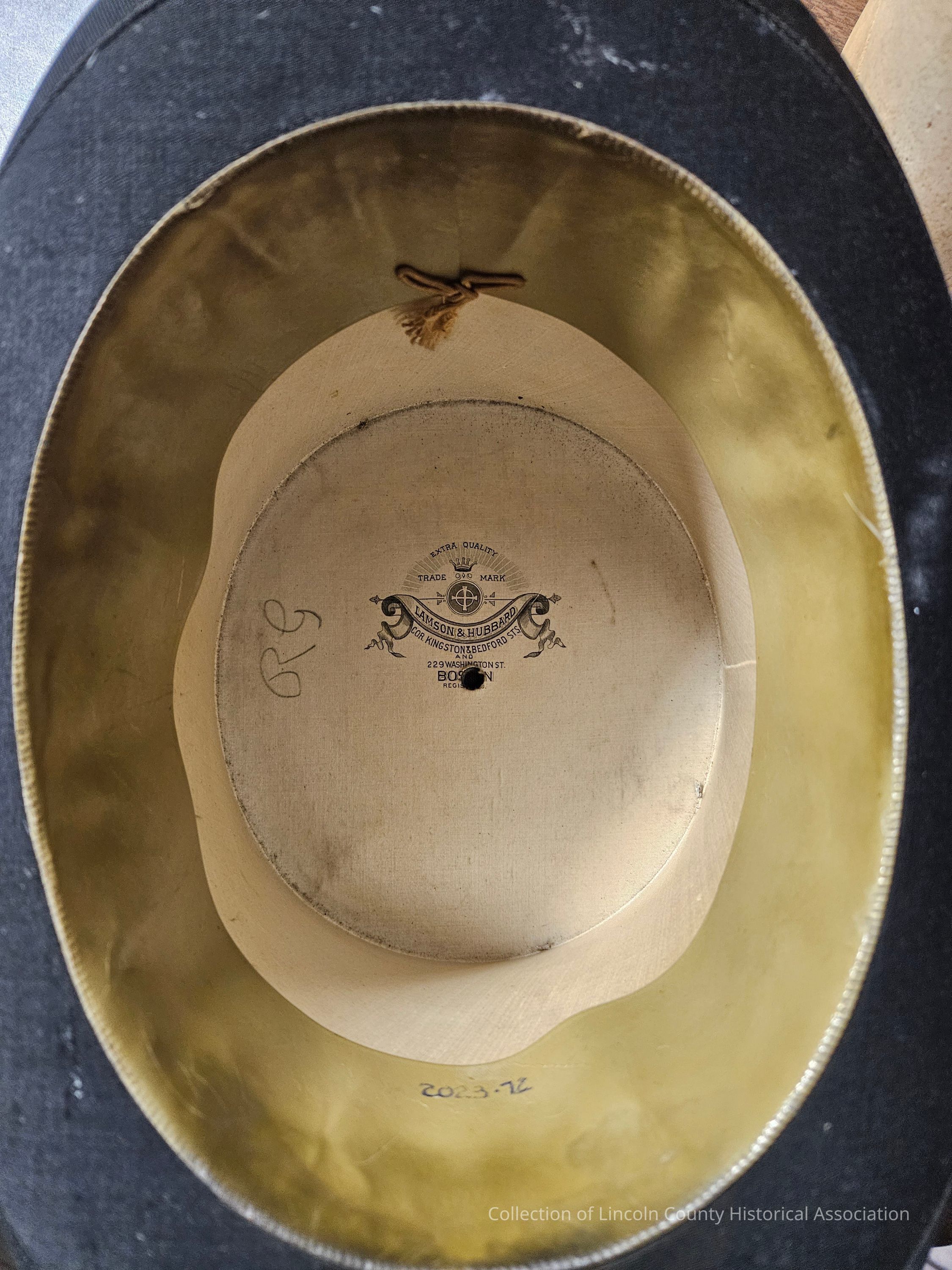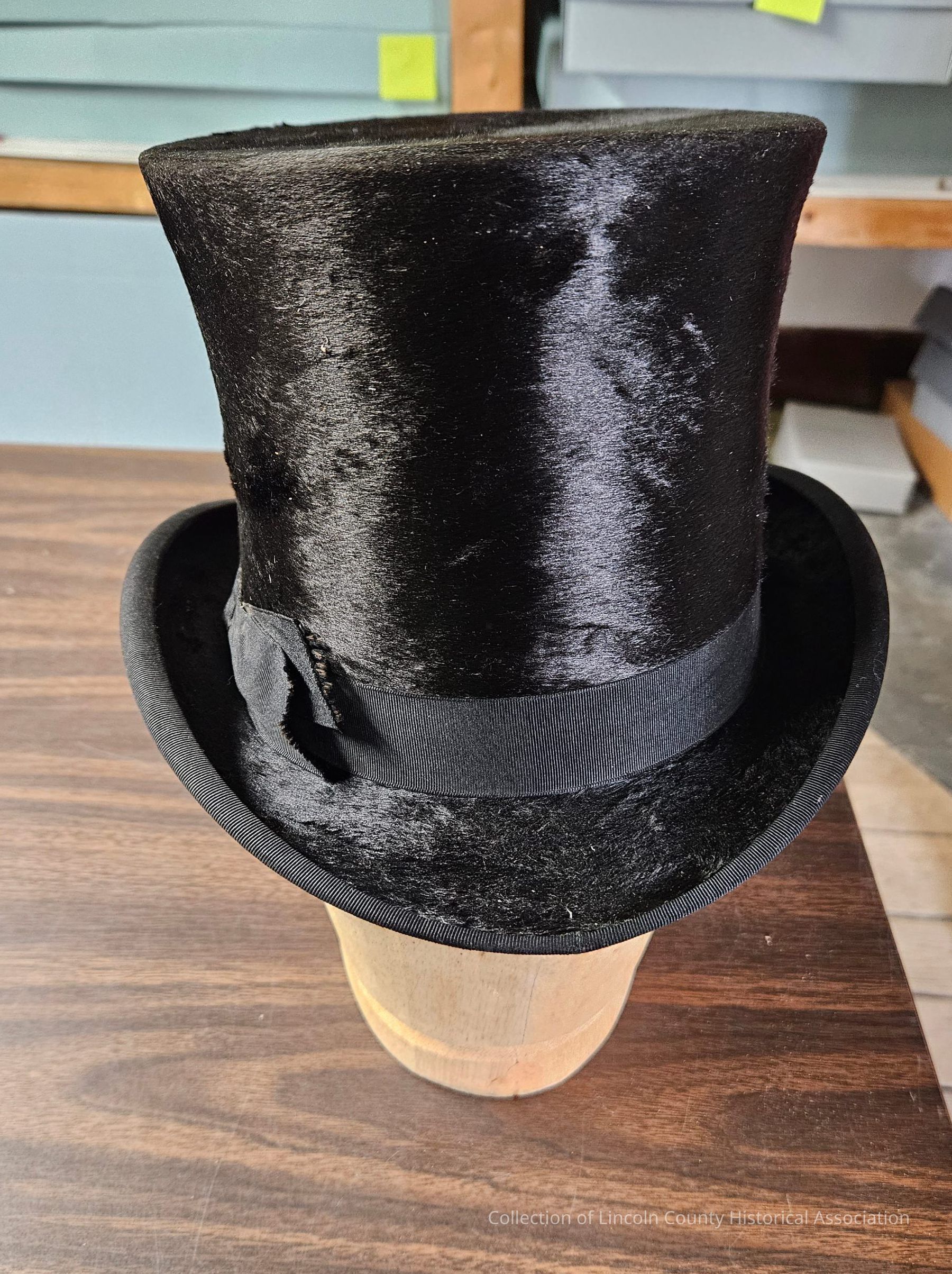 Black beaver fur top hat. Silk ribbon around the bottom. Tan interior.