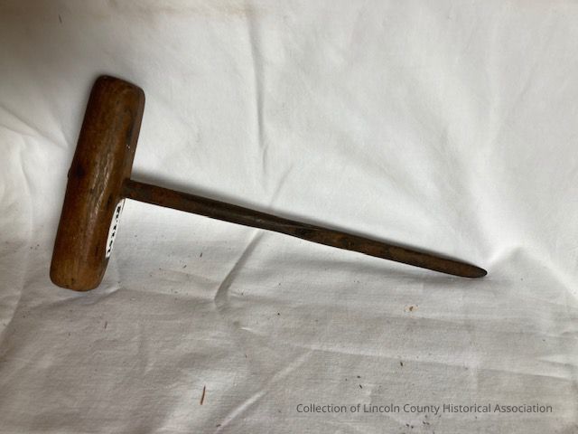 Gimlet with a quill bit. Metal spike and wooden handle. Spike grooved on one side. Hand forged