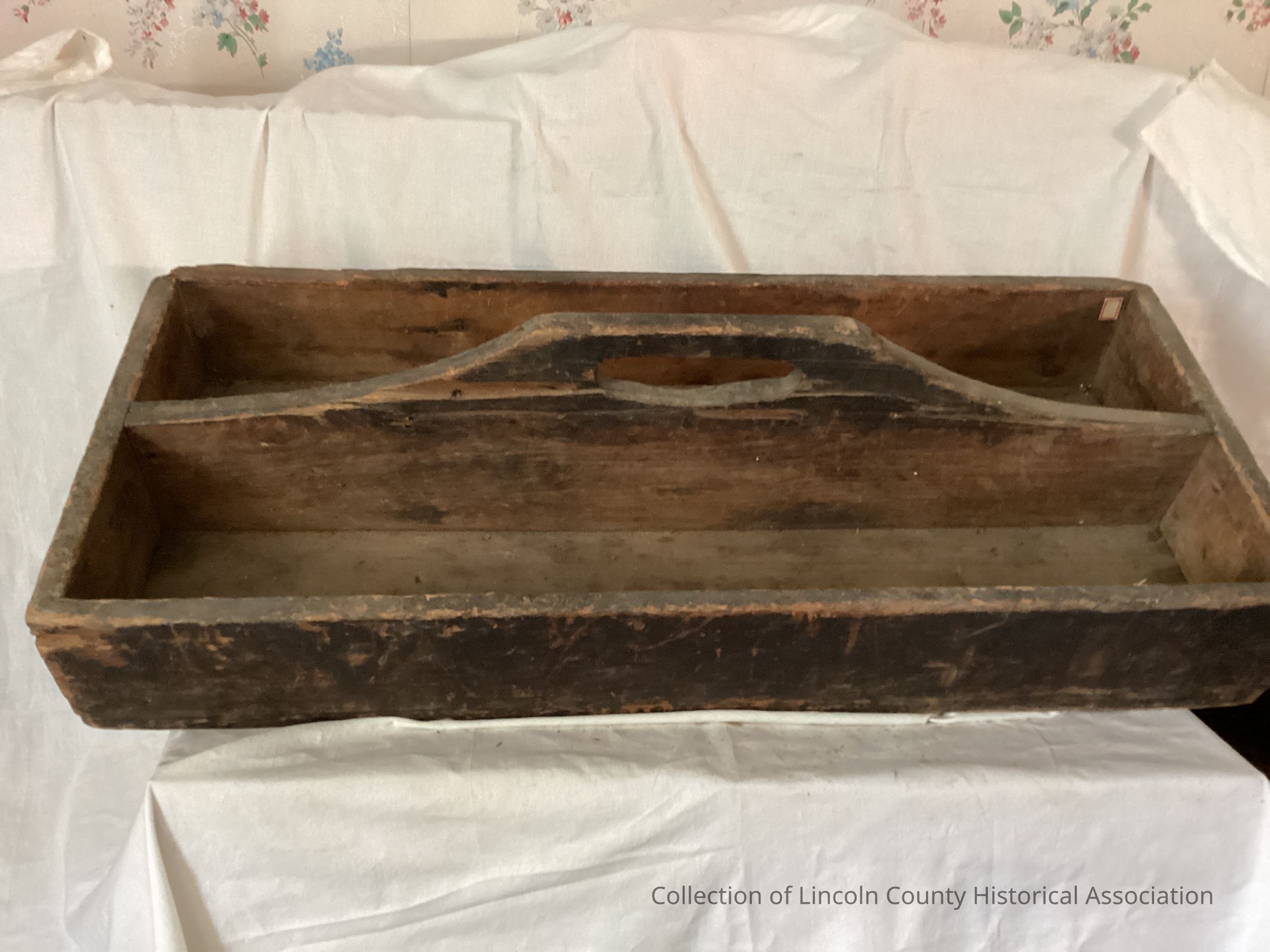 Rectangular wooden tool box partitioned down the middle length-wise. Open grip handle surmounts the partition. Can also be referred to as a tool caddy.Made/Created