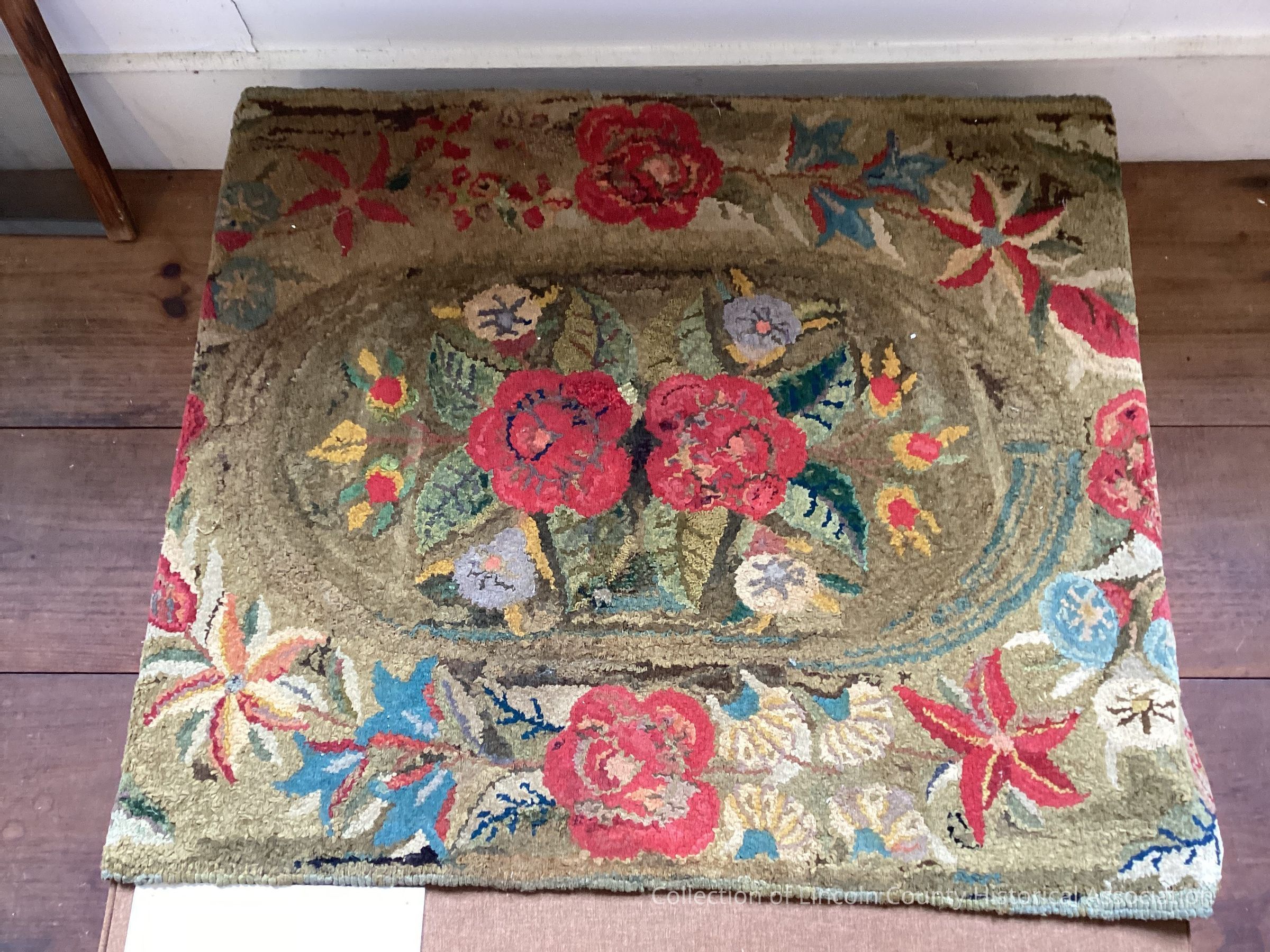 Rectangular hooked rug. Center red roses and blue and yellow flowers set in oval. Surrounded by red, blue and white flowers. On a green background. Burlap back. Wool yarn.