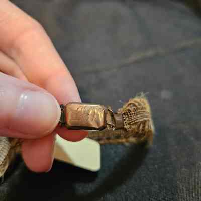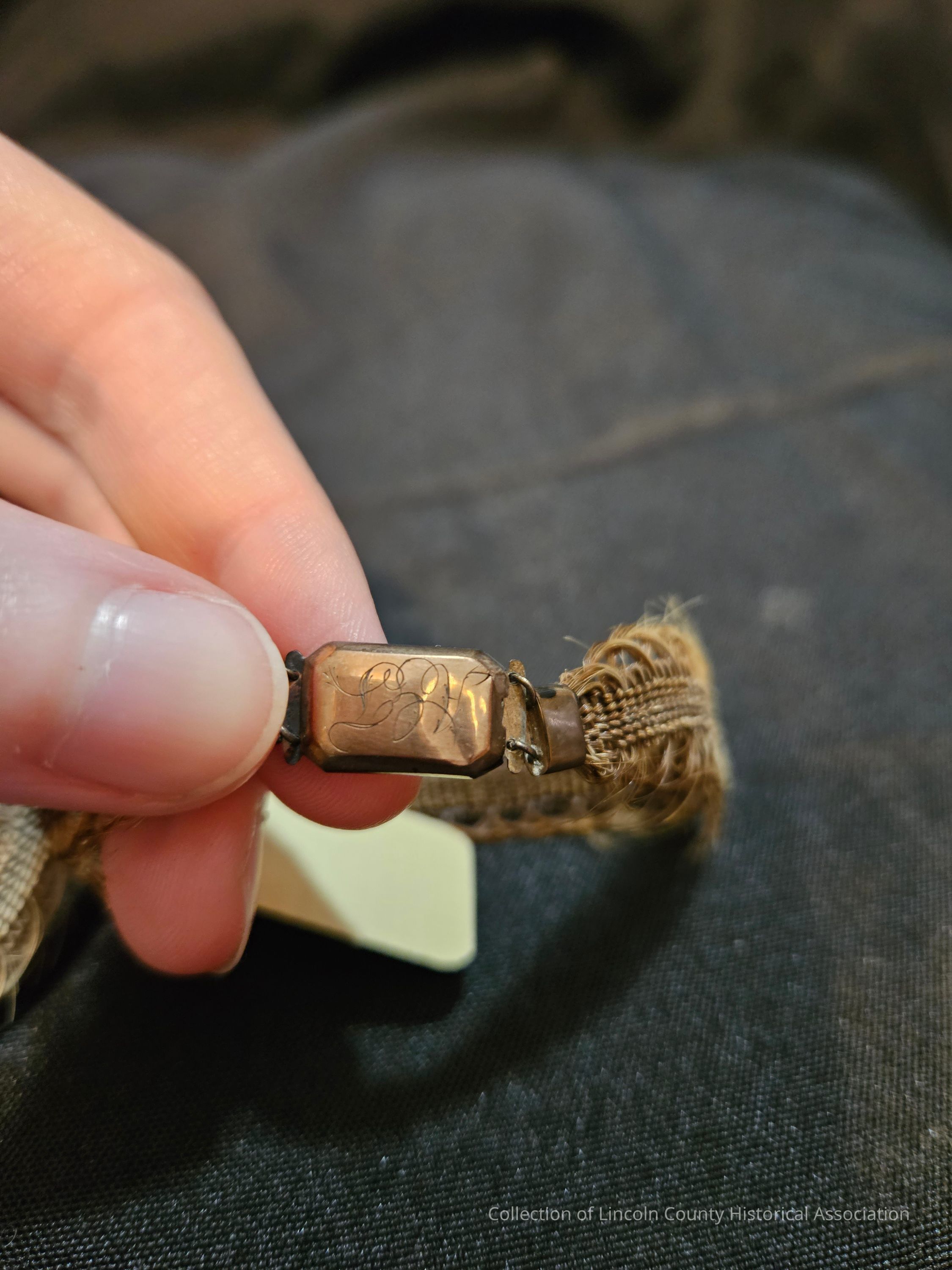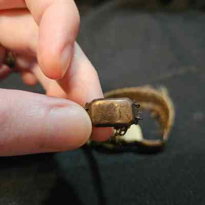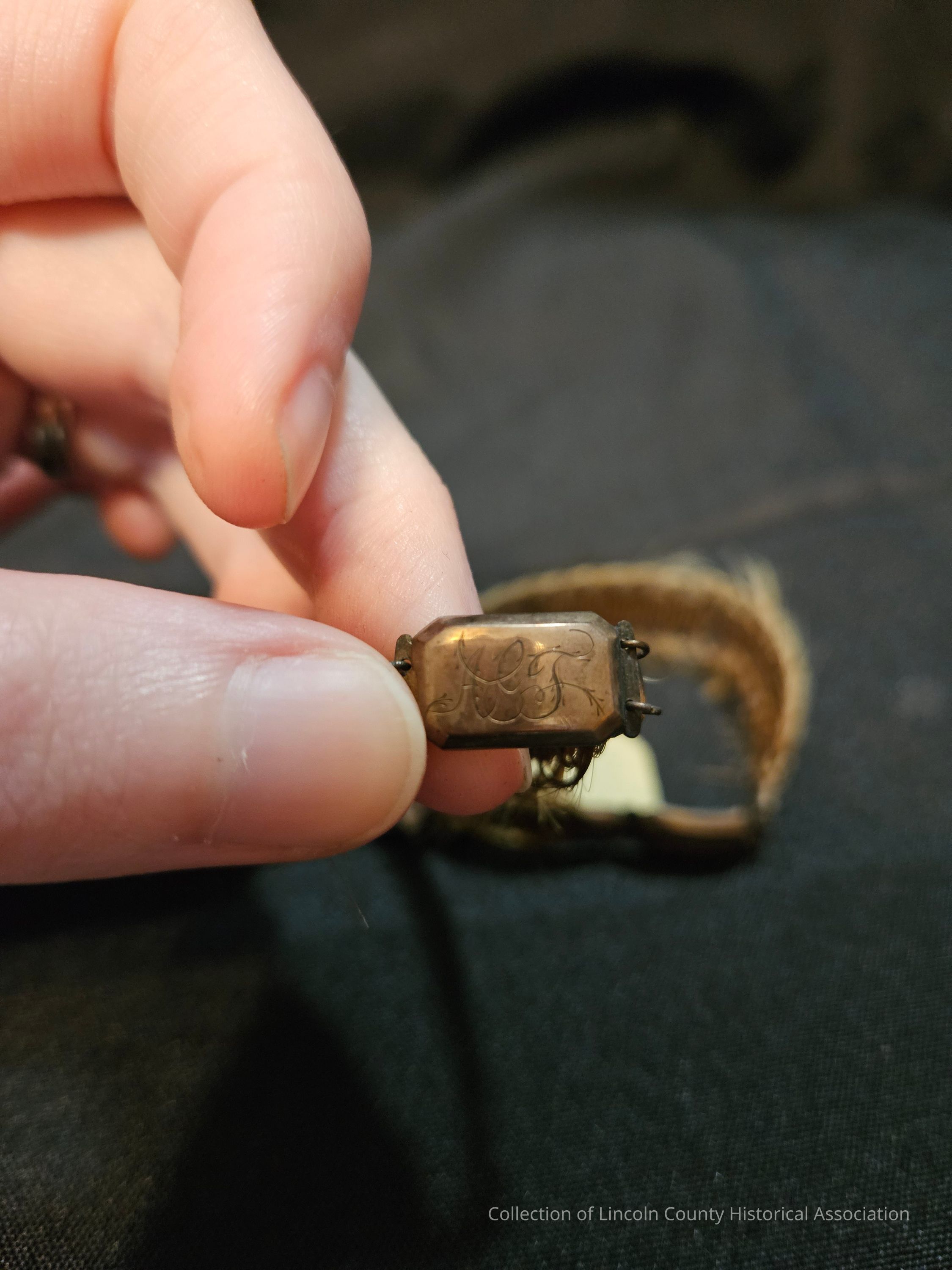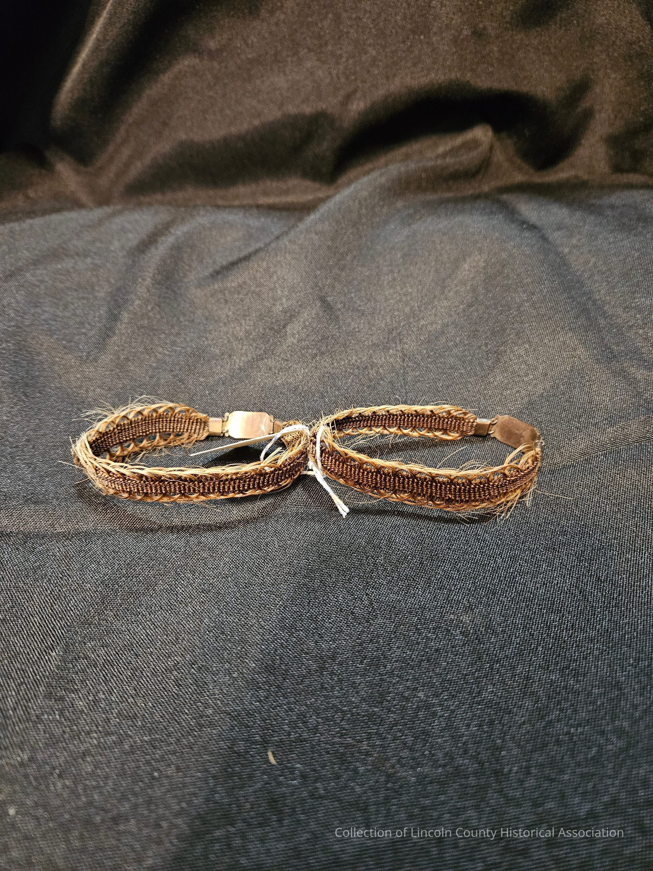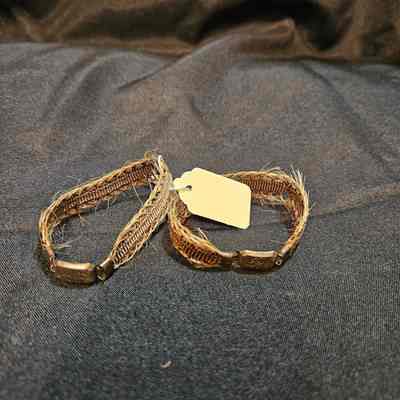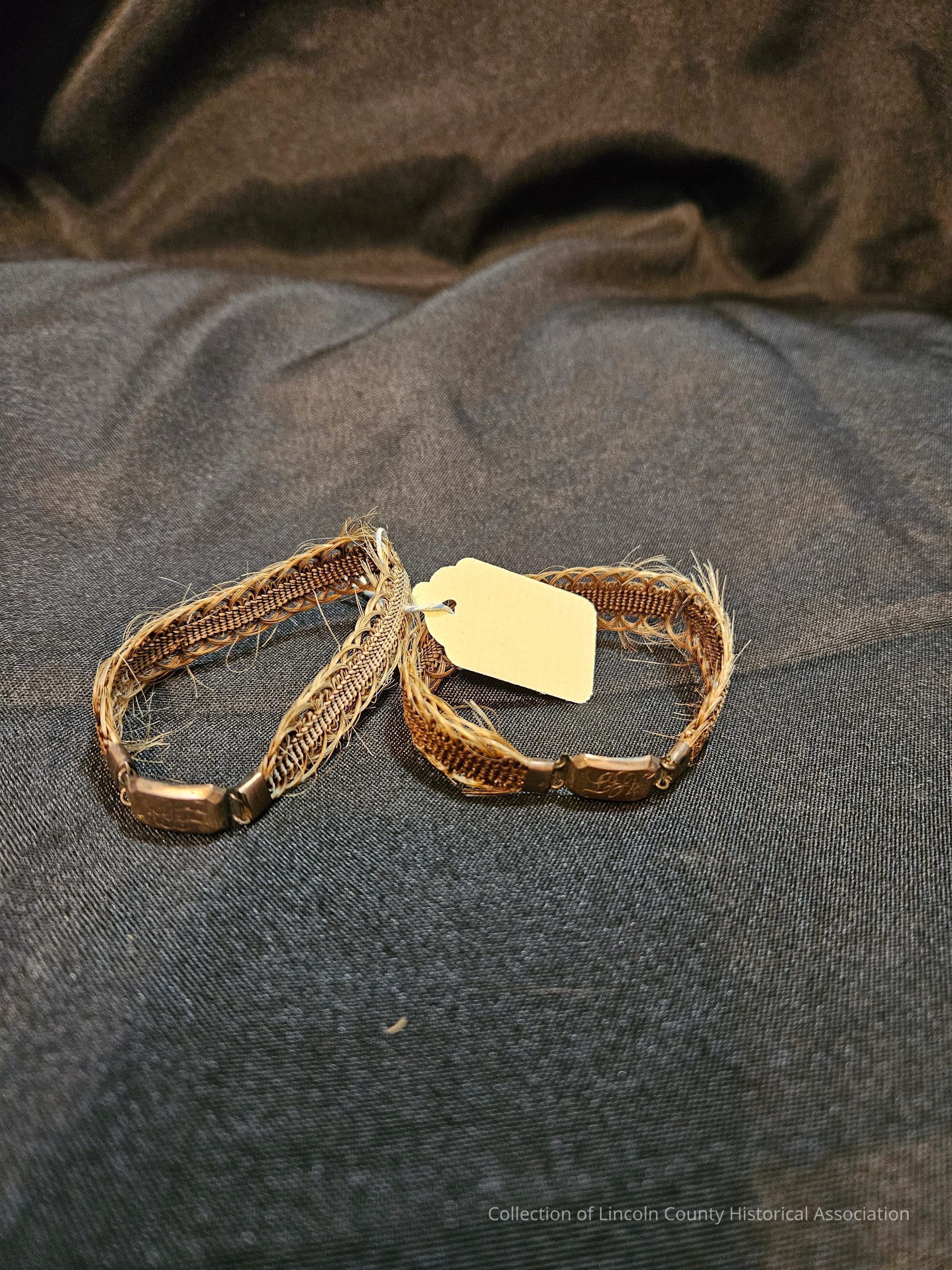 Pair of hair bracelets. Loose circles of hair surrounding the more tightly woven center threads. A metal clasp on each with initials.Made/Created