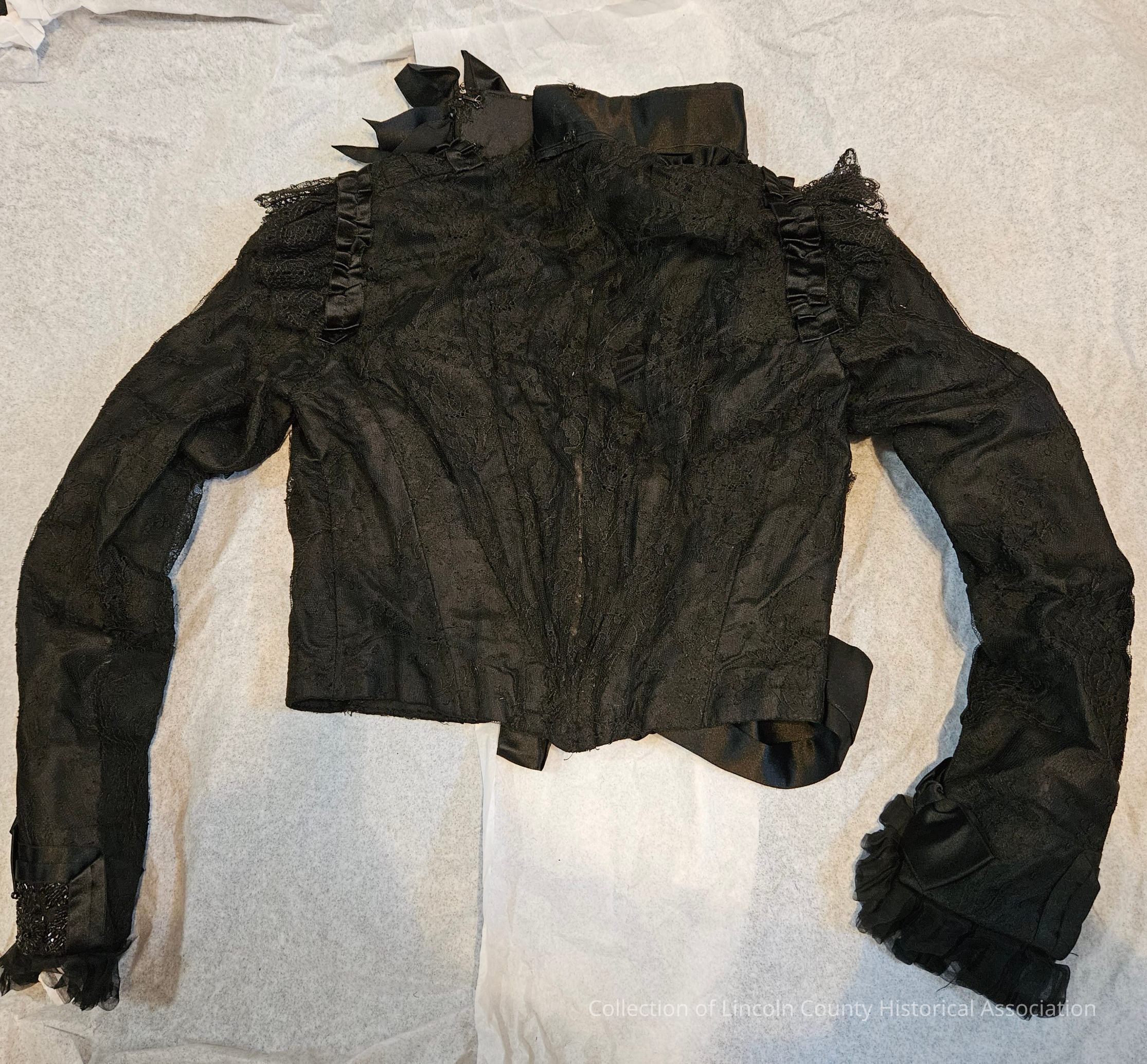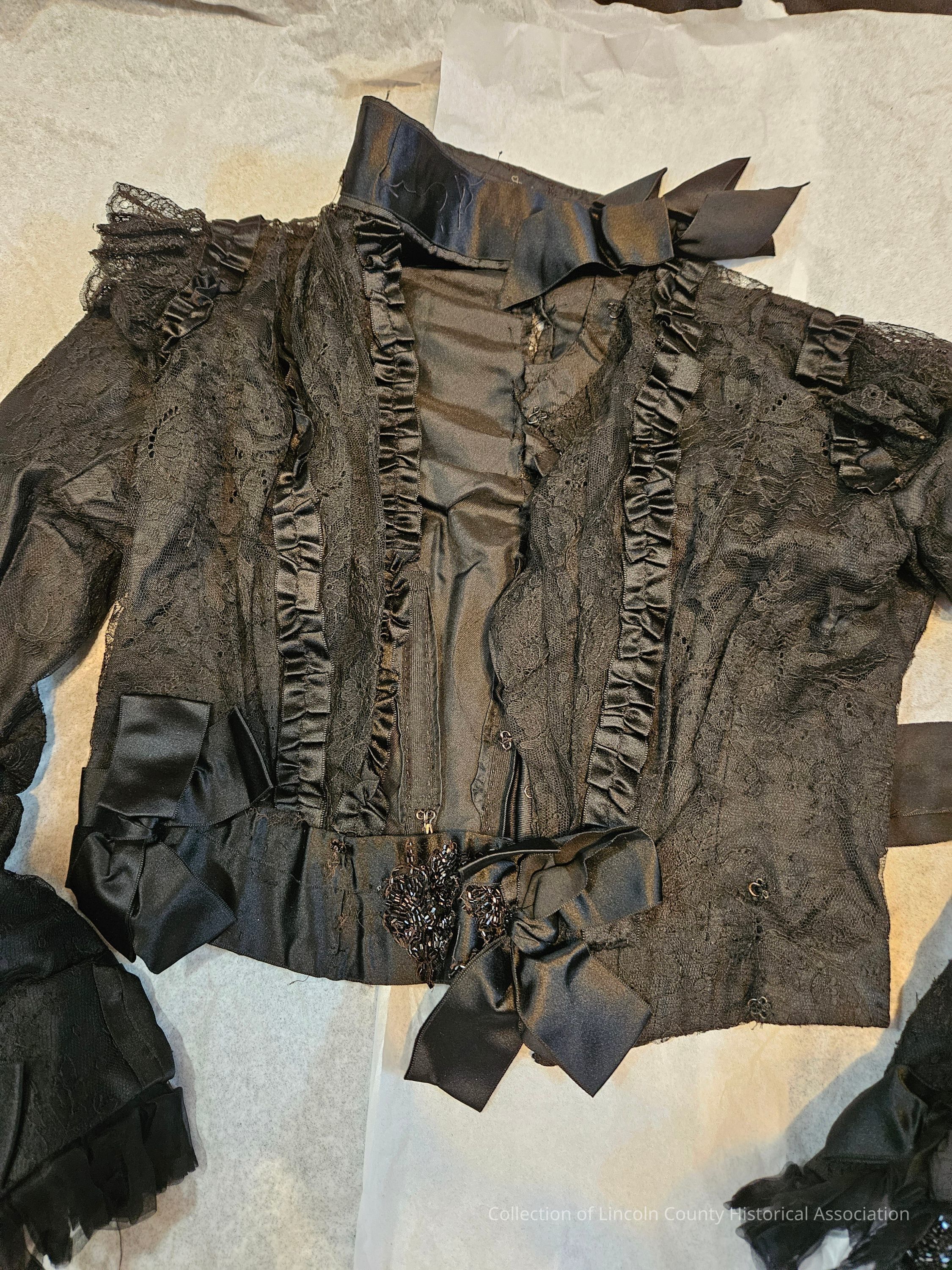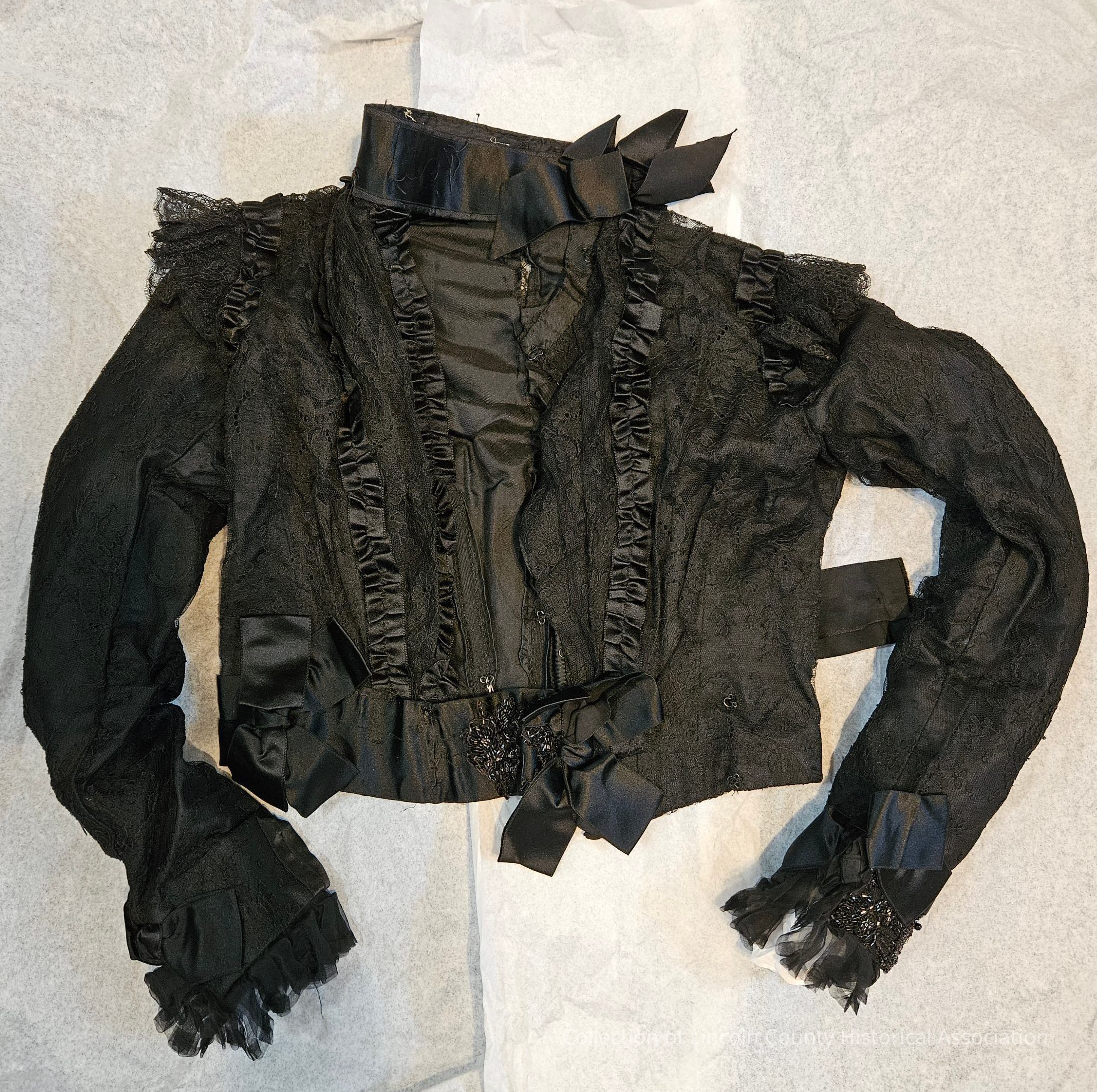 Black lace and satin bodice. Three black ruffle stripes down the front. One ruffle stripe around each shoulder. Black floral lace covering almost the entirety of the bodice. Satin ribbons ending in a bow at the collar, sleeves, and waist. Black beadwork at the waist and sleeves. Metal clasp closures. Boning around waist.Clothing/Dress/Costume Details