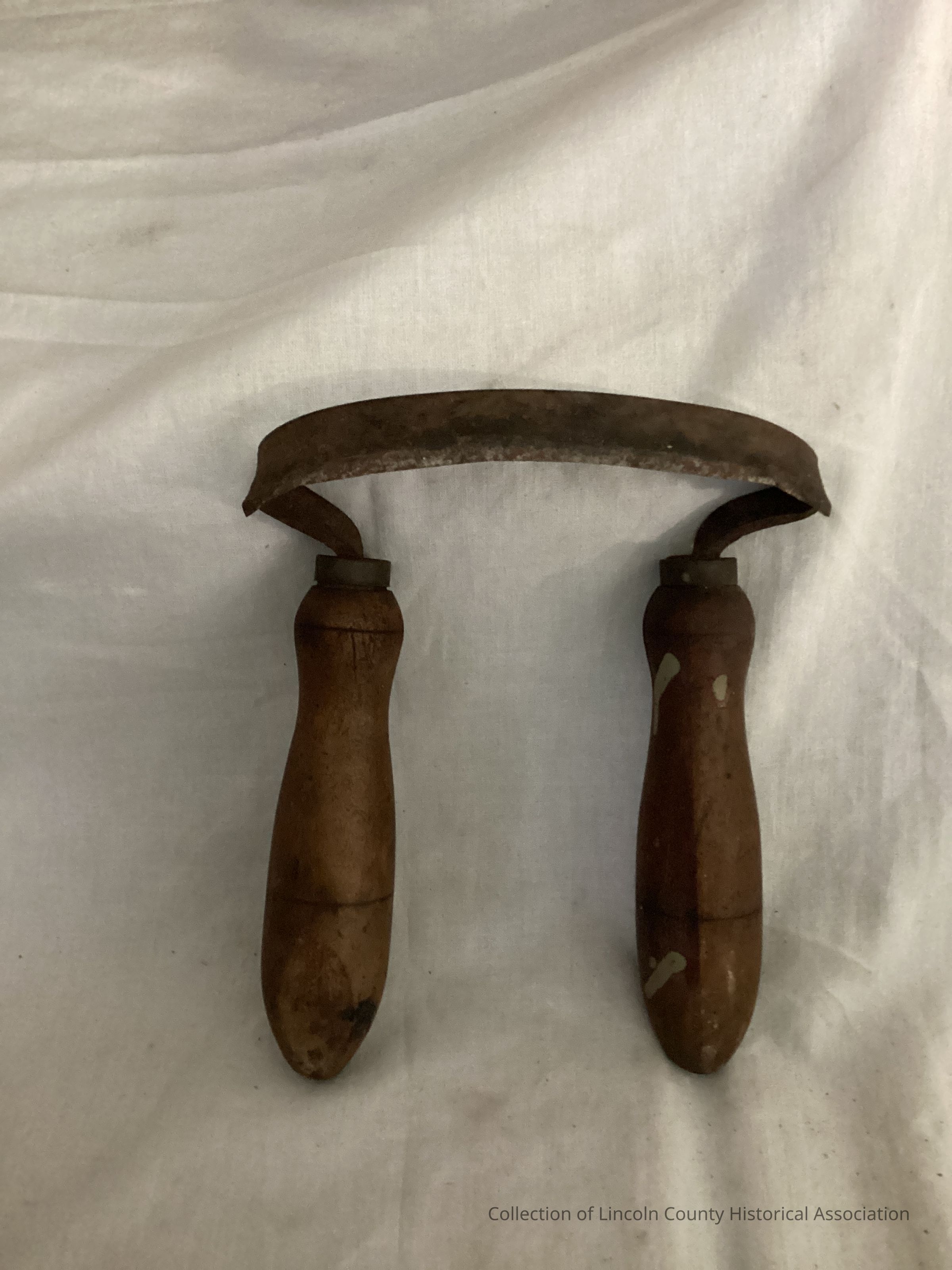 Cooper's in-shave or scarp made of wood and iron. Curved blade beveled along outside edge.