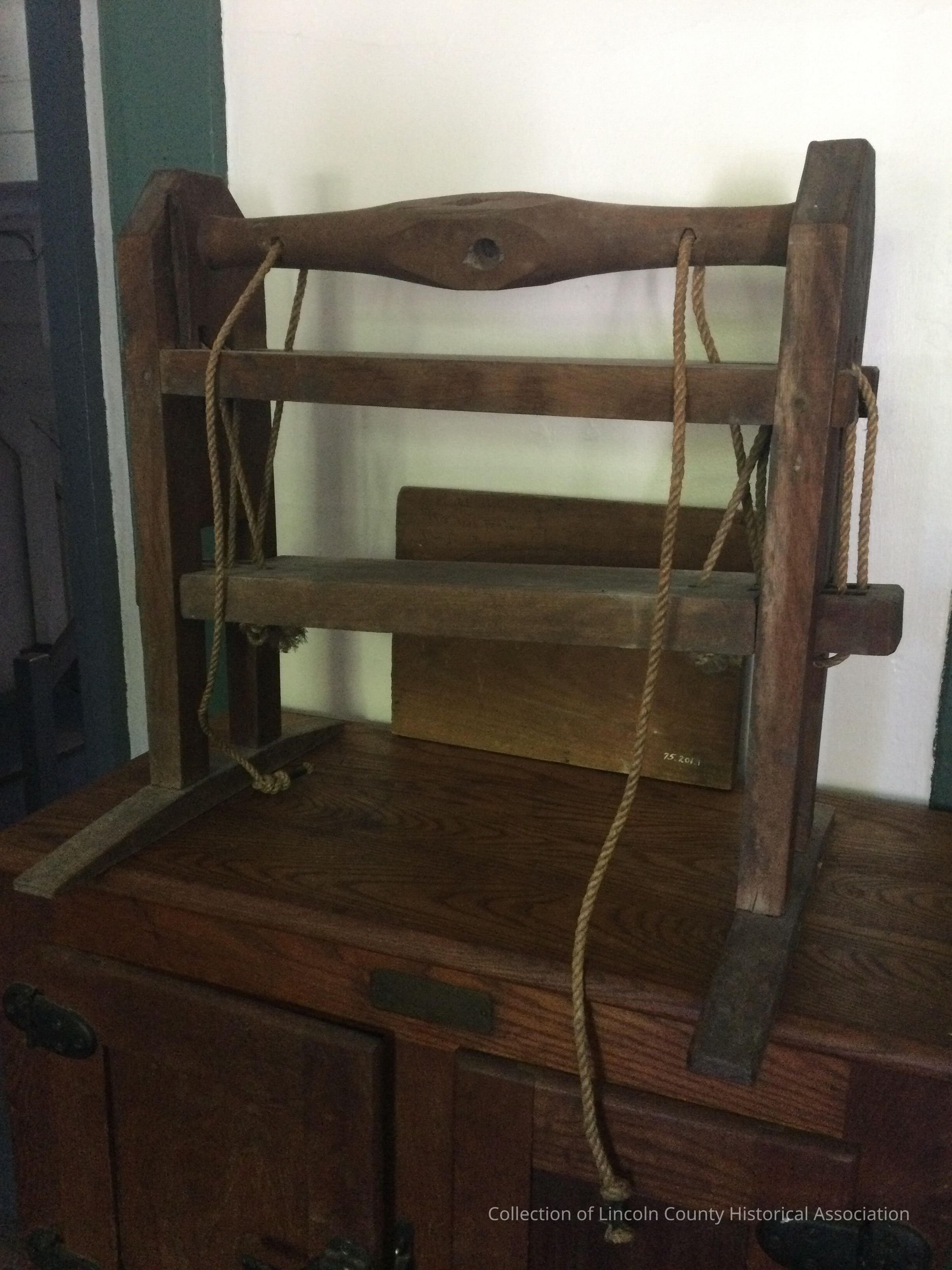 Wheel of cheese put into a basket on a movable platform. The handles are turned to raise and press the cheese so that its whey and water run off into a container below.