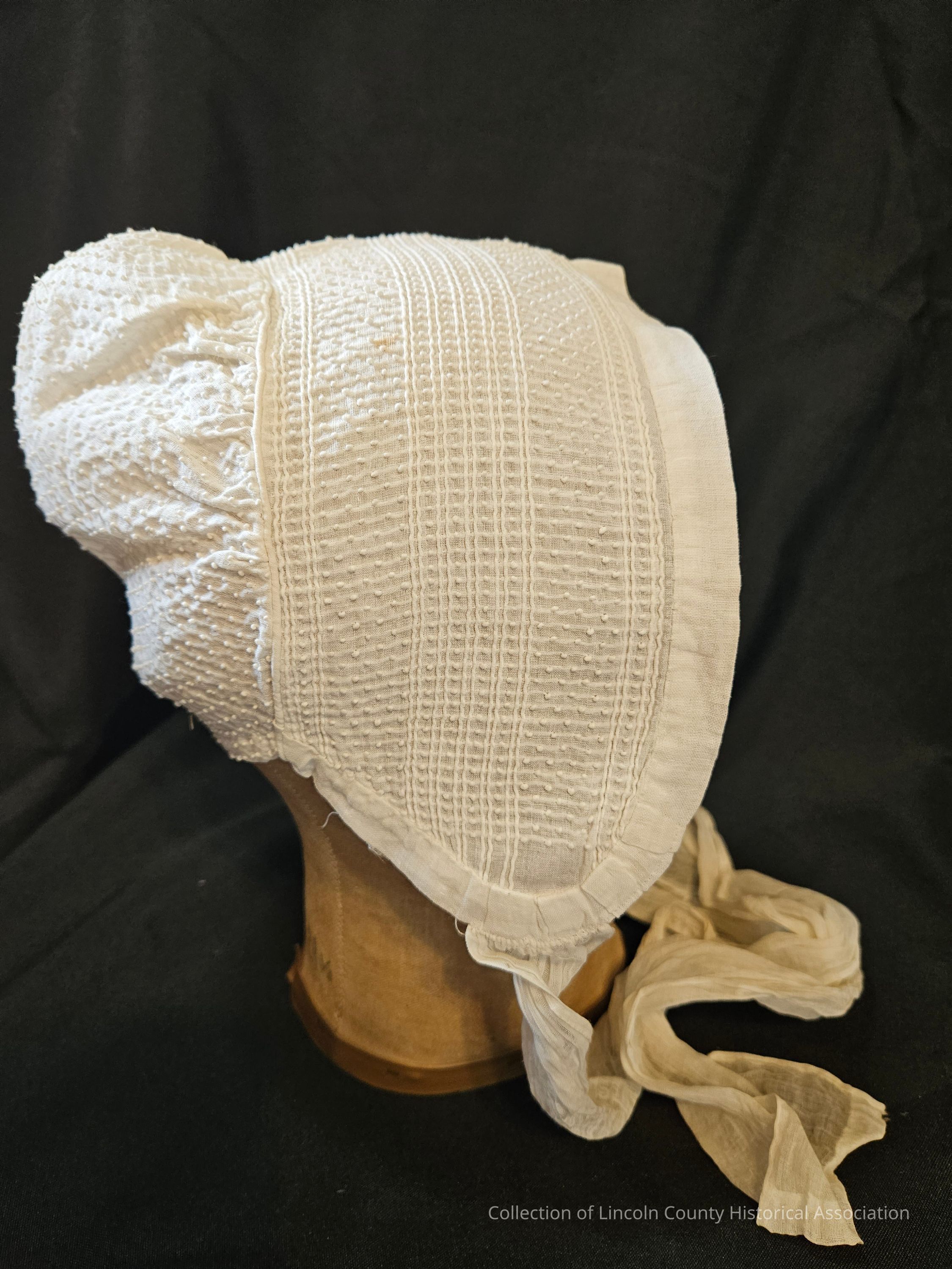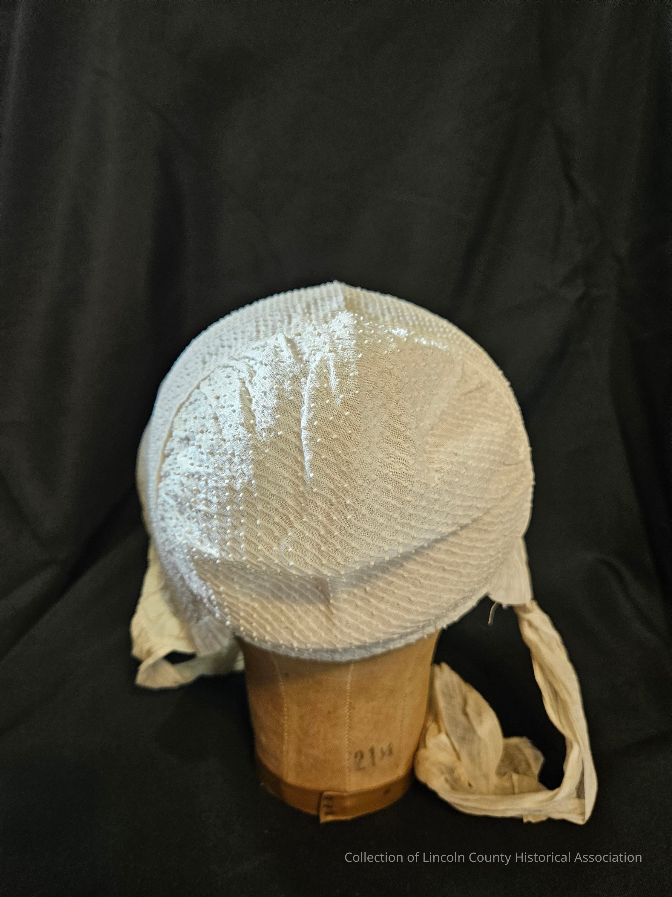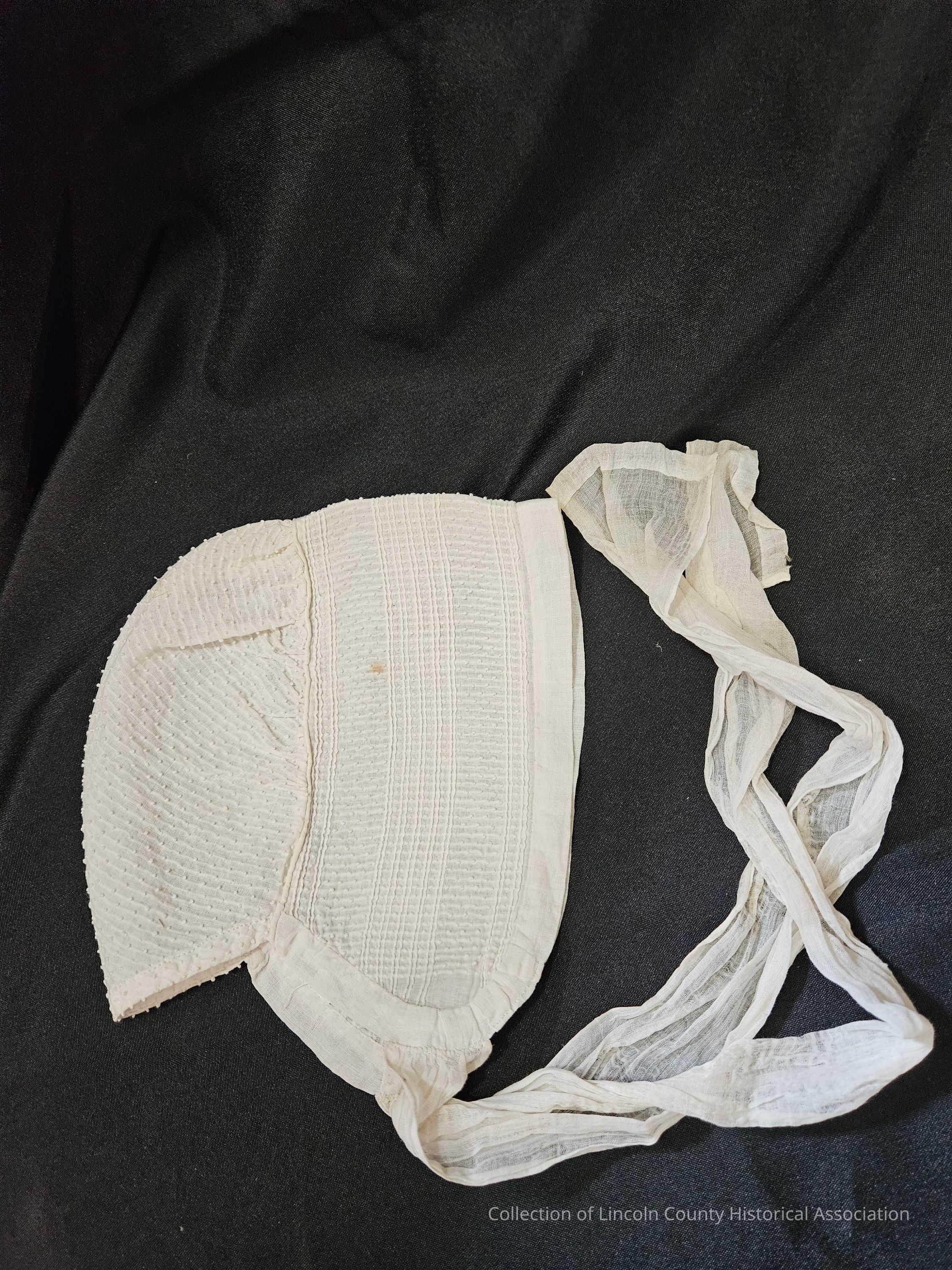 White cotton day cap with raised dot and line design. Hand stitched with a double layer edge. Two long cotton ties.Clothing/Dress/Costume Details