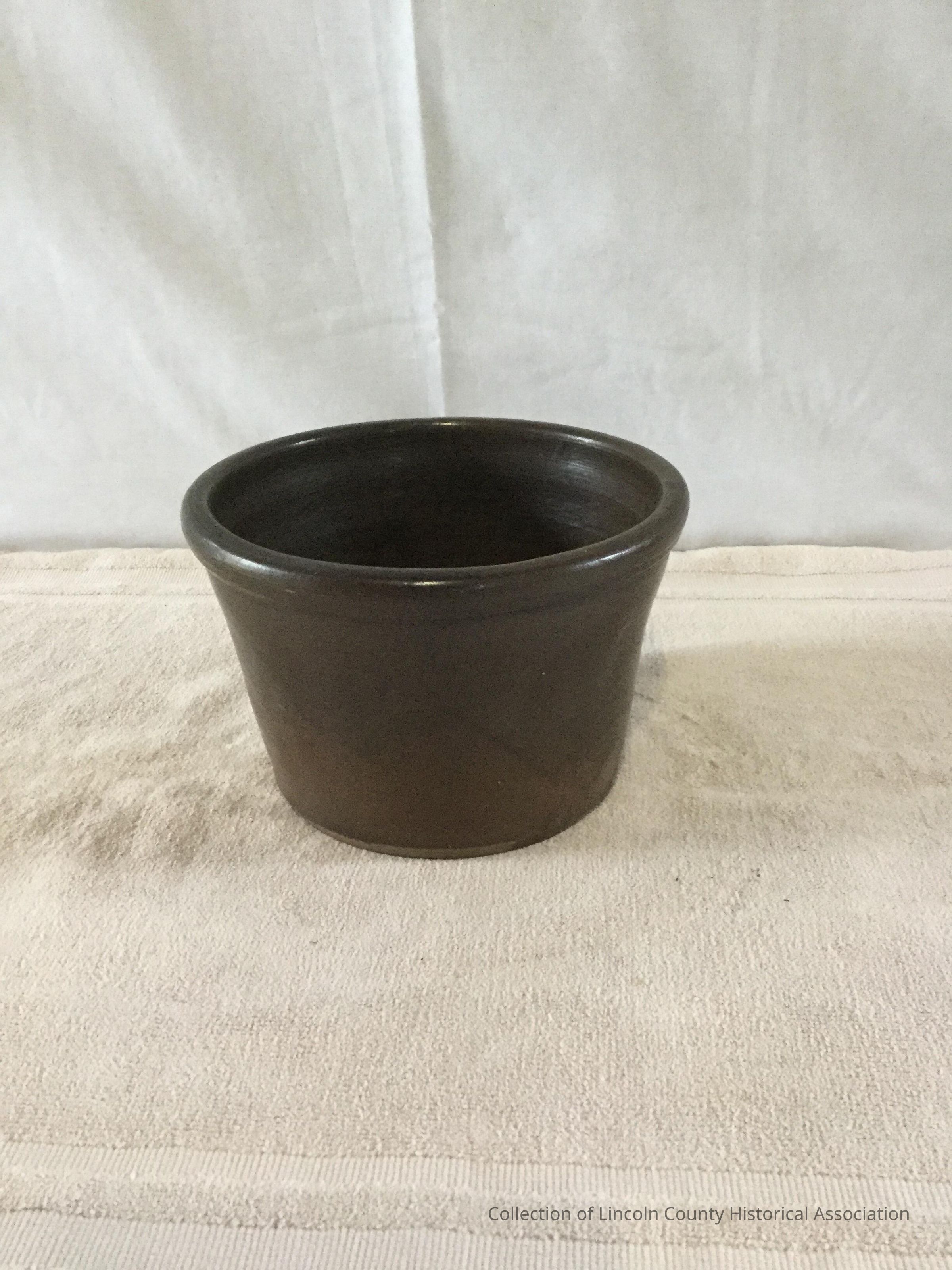 Small, dark brown earthenware pot with sloping sides and rounded lipMade/Created