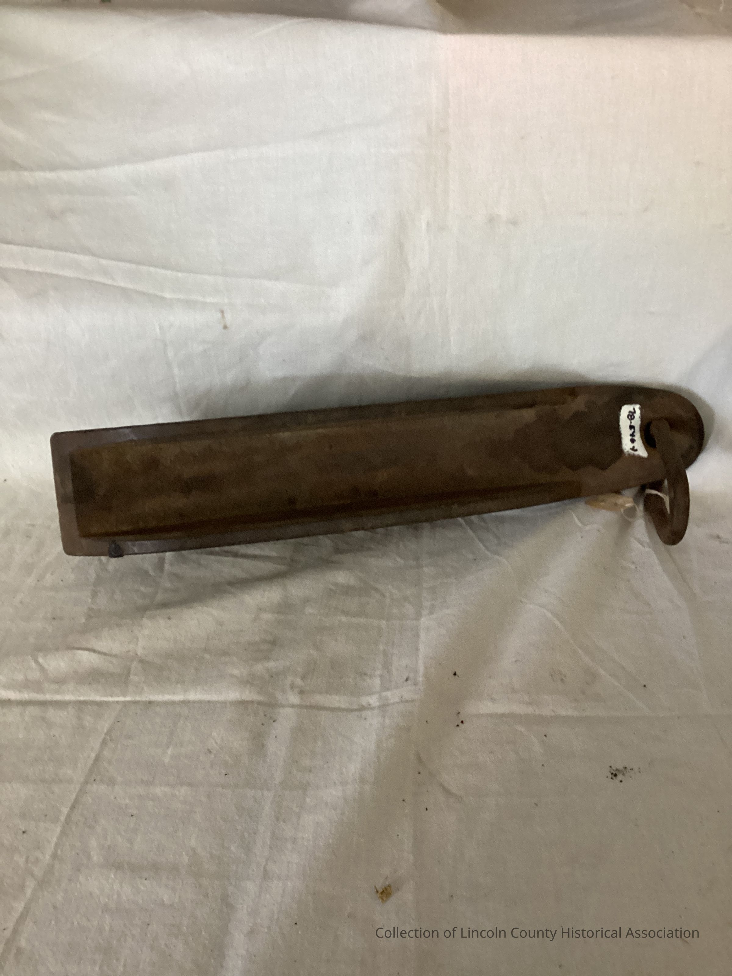 Cast iron shoe for a wagon wheel (wagon break). Is concave trough-like shape to fit over rim of a wheel. With a hole and chain at one end.Made/Created