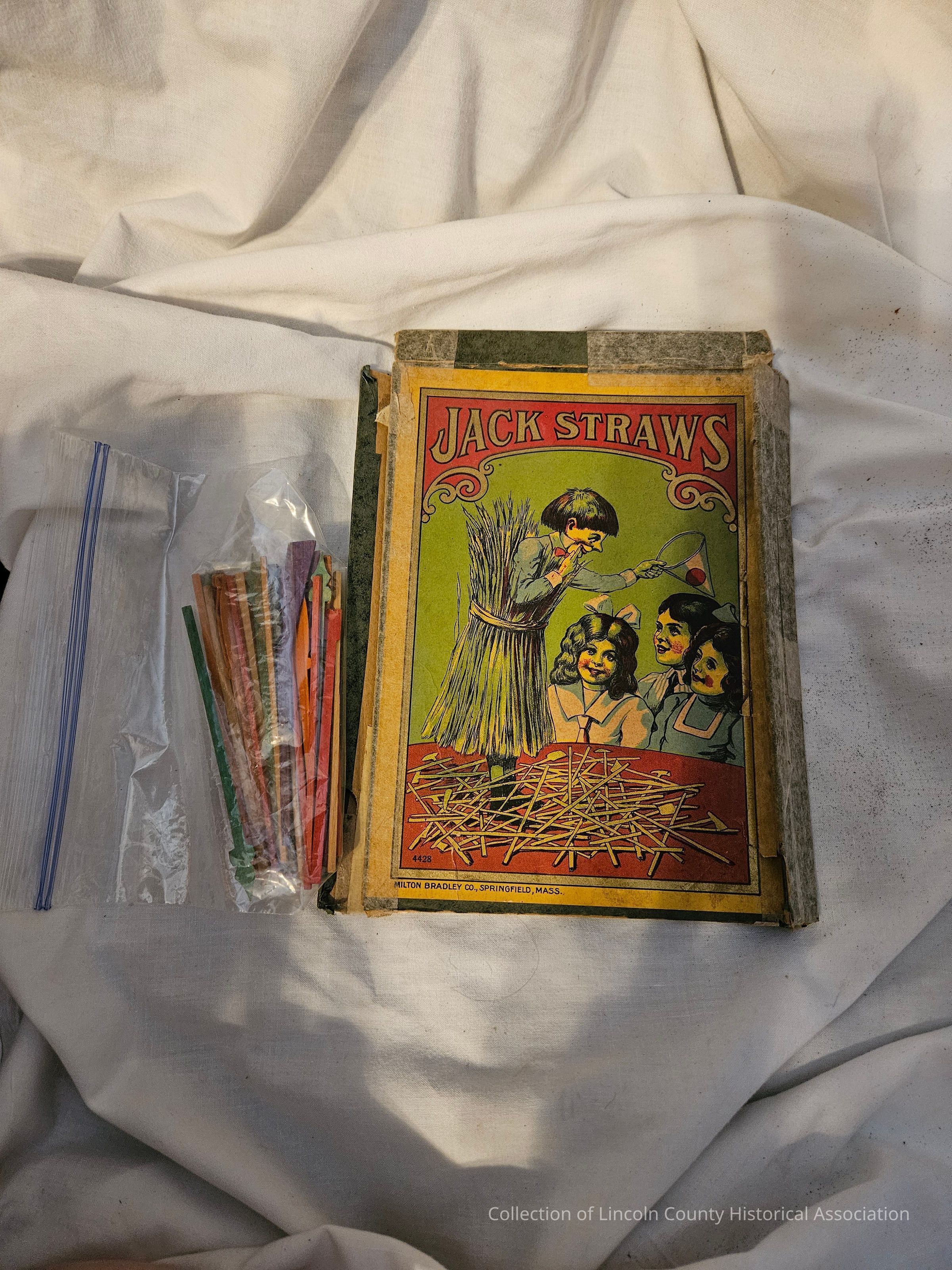 Jack straws game. Carboard box with image of four children playing game on front. Inside is a collection of wooden multi-colored straws.Made/Created