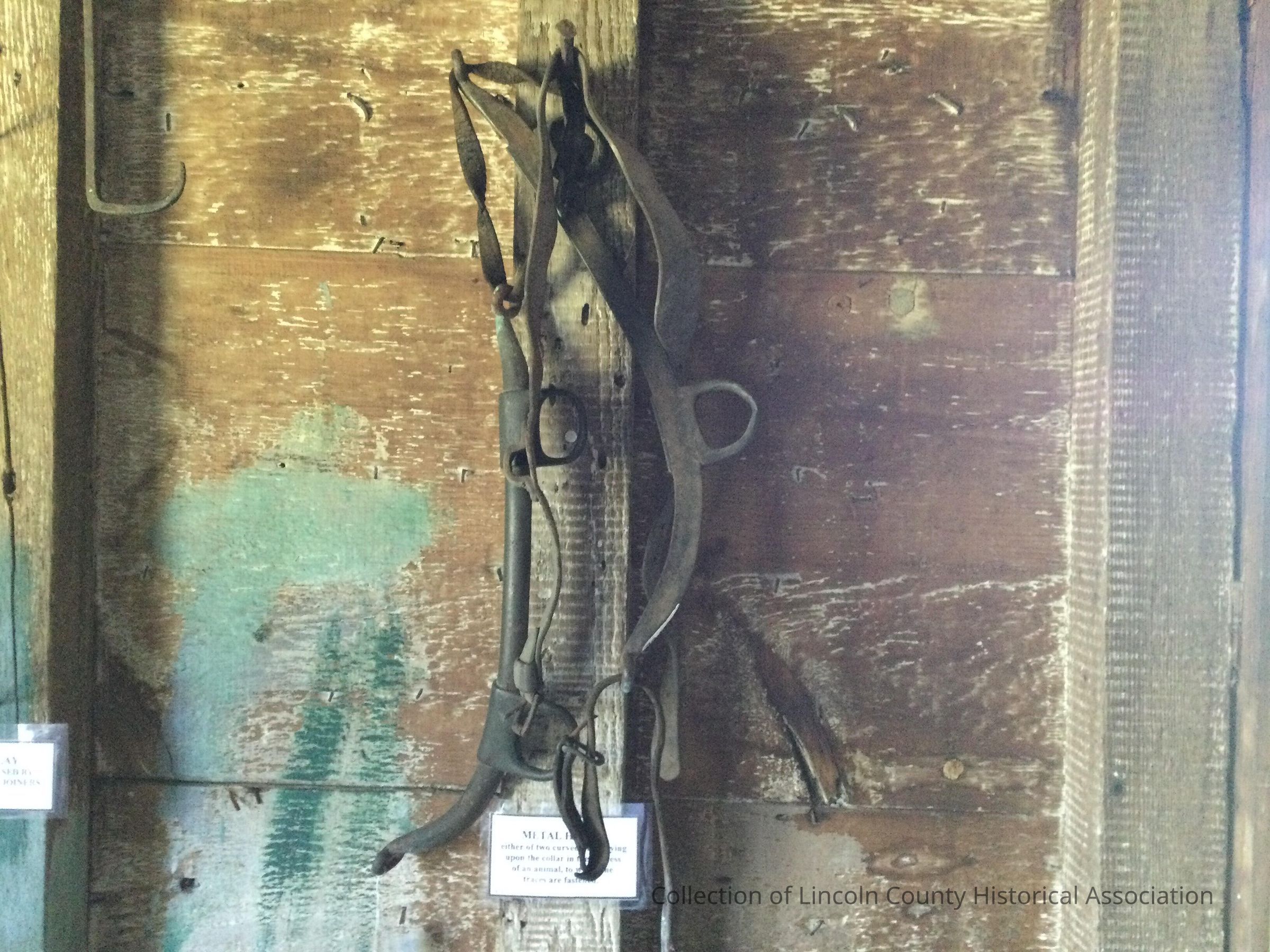 Pair of hames to form a collar for a draft horse. Two curved cast iron pieces each with rings secured by leather thongs or straps.