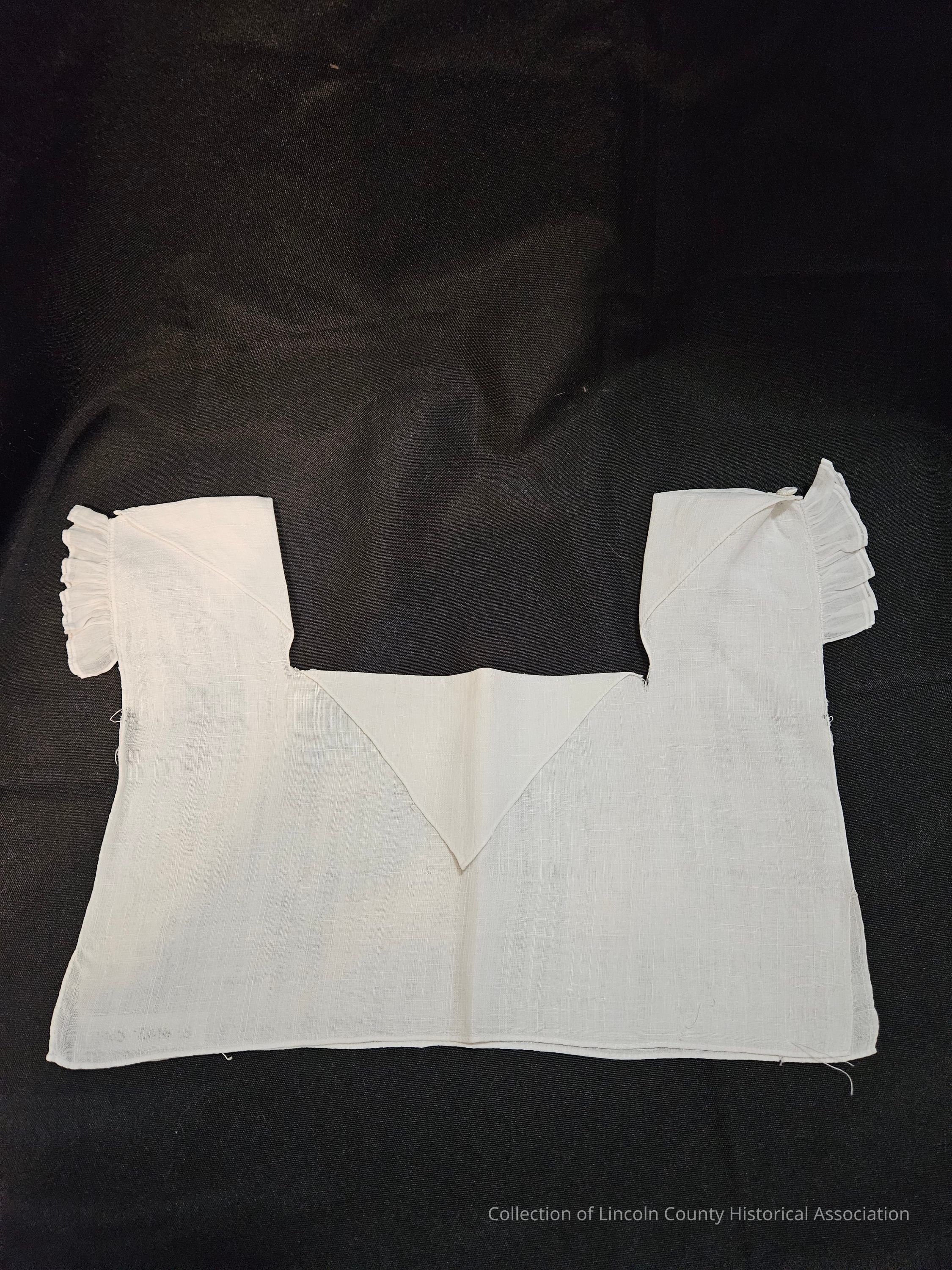 White cotton infant shirt. Triangular folds on front center and back center. Triangular folds also on top of arms, secured with button. One button is missing. Ruffled edges at arms.Clothing/Dress/Costume Details