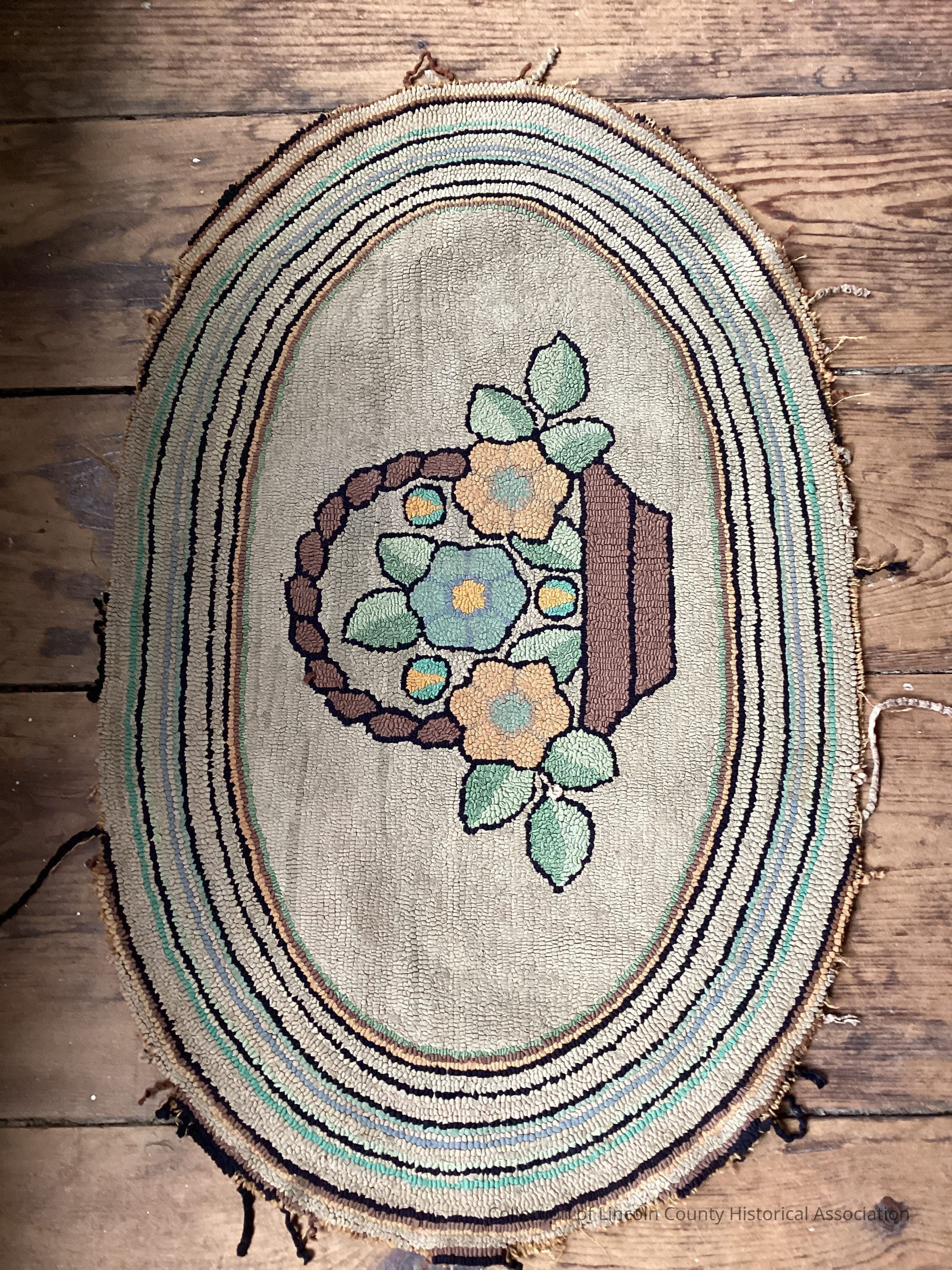 Oval shaped hooked rug. Green and black border. Center image of basket of blue and yellow flowers.
