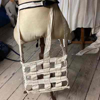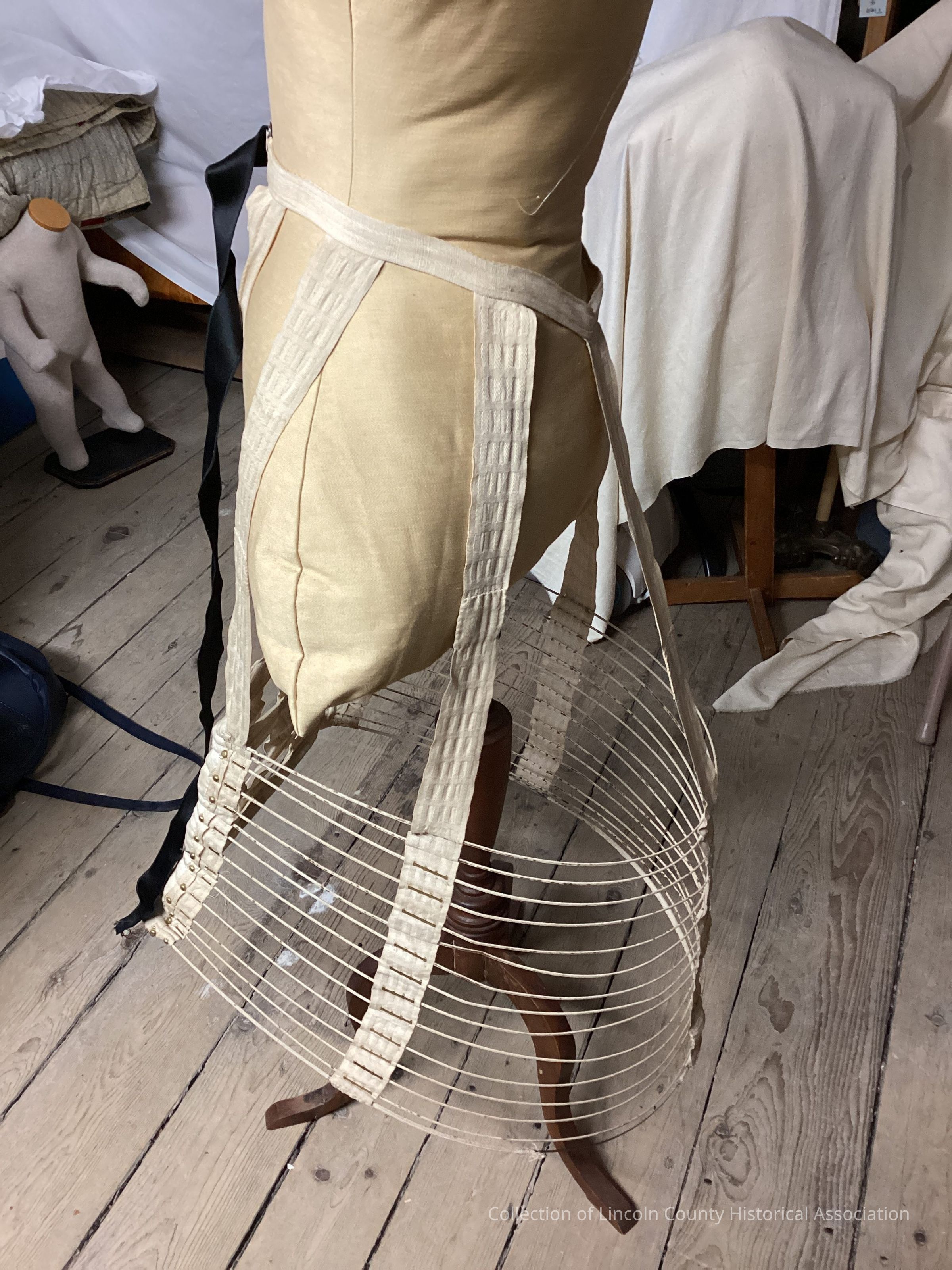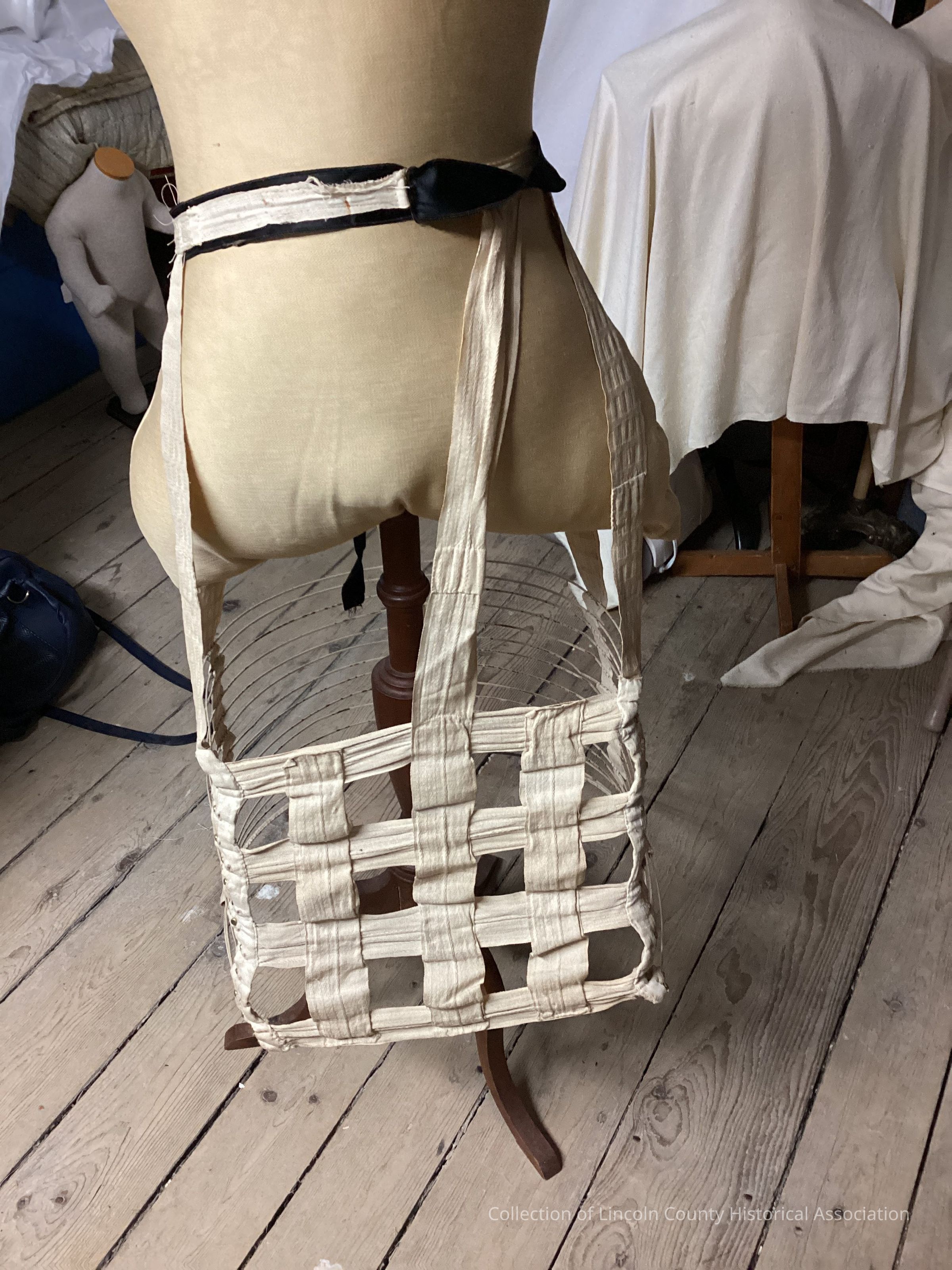 Cage crinoline/hoop. White cotton strip at waist with six cotton strips attached to waist and metal cage at bottom. Metal oblong strips at bottom joined by woven tape. Buckle on one side of waist tape.