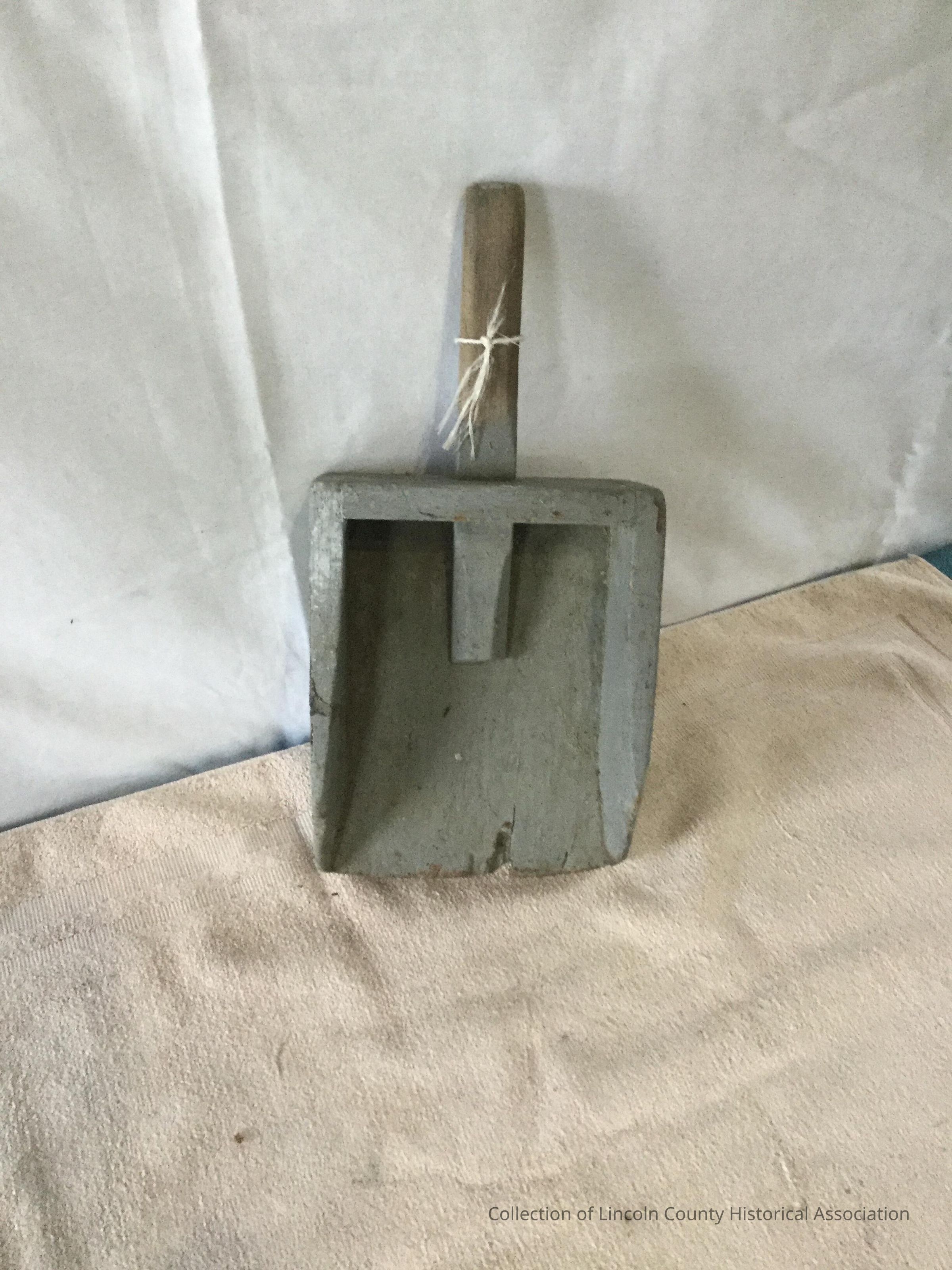 Hand made wooden meal scoop. The scoop is three sided and with an open end. The handle goes through the back and is attached along the bottom. Painted gray.Made/Created