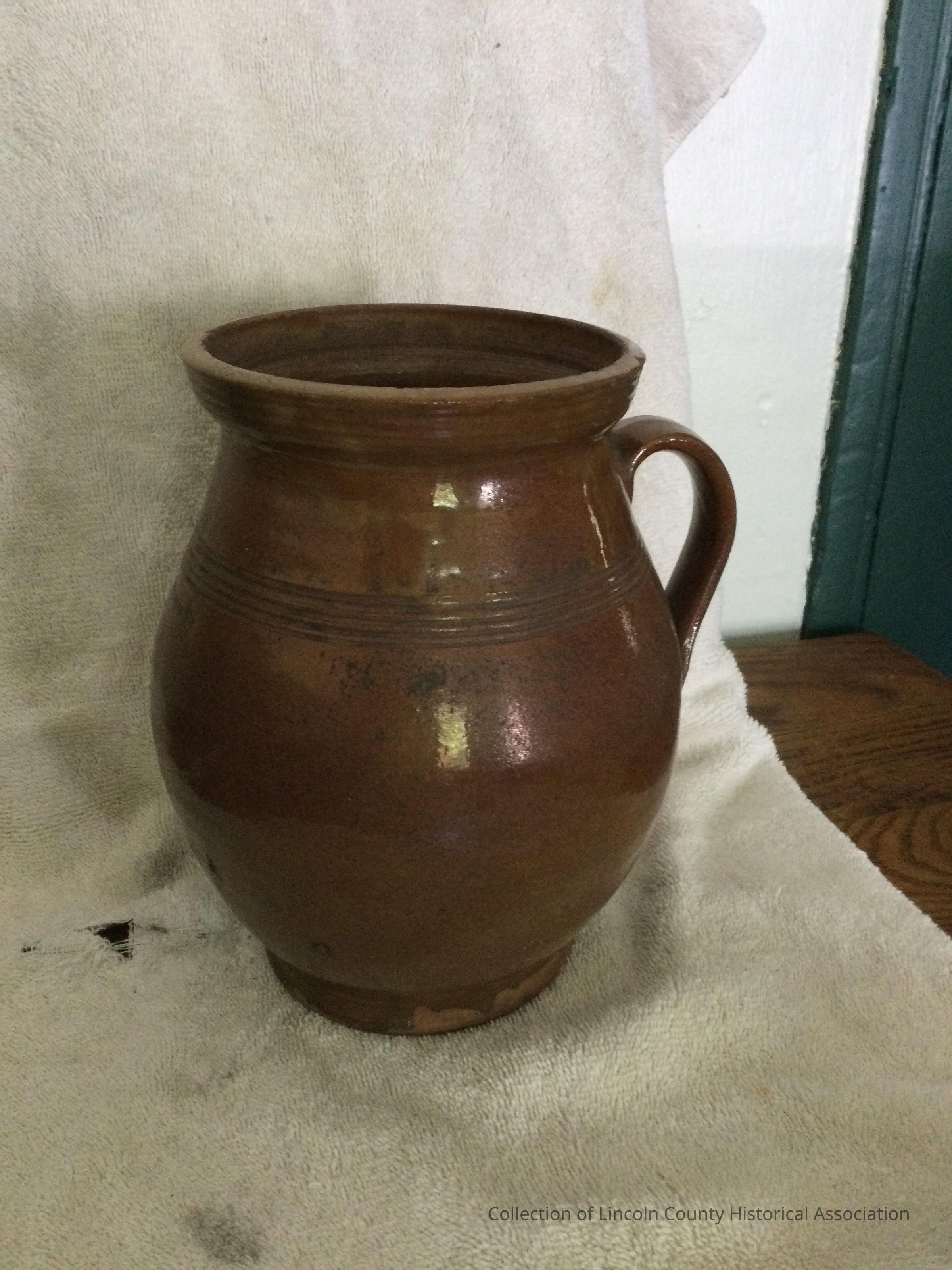 Brown glazed earthenware jug with a single loop handle attached to shoulder. Wide, flaring lip designed to hold a now missing lid. Five horizontal scored rings on shoulder with 4 parallel scored rings at lip.Made/Created