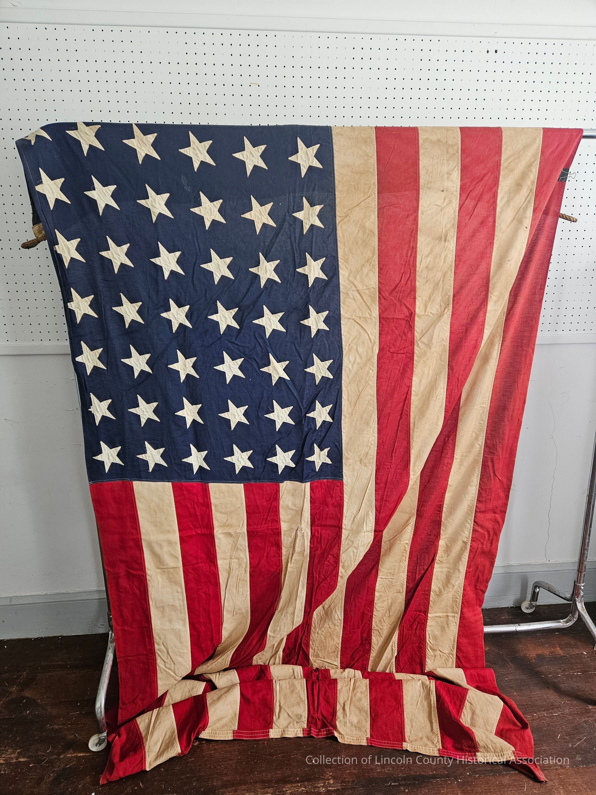 48 star flag. Machine stitched, made by Valley Forge Flag Co. of Spring City PA. Made of cotton bunting. Rope reinforced edge with metal thimbles.