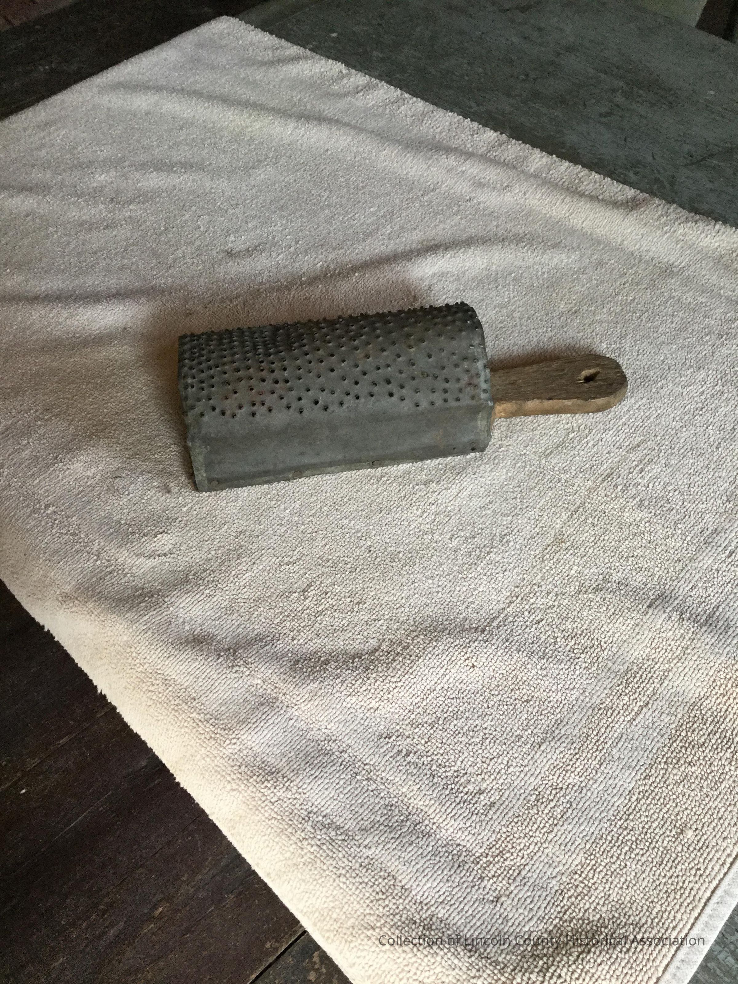 Curved piece of punched tin attached to a paddle like board. Hole in handle for hanging.