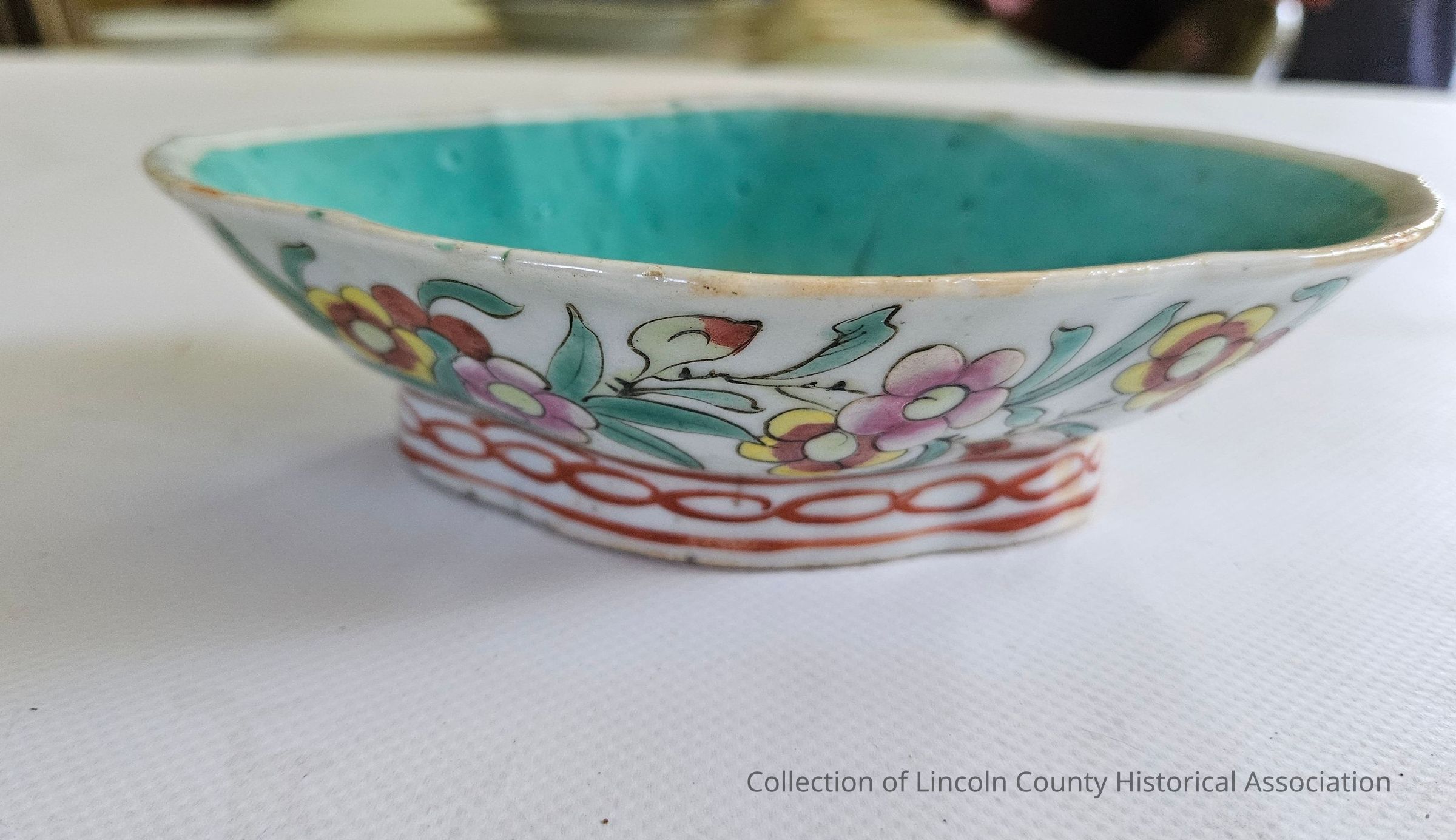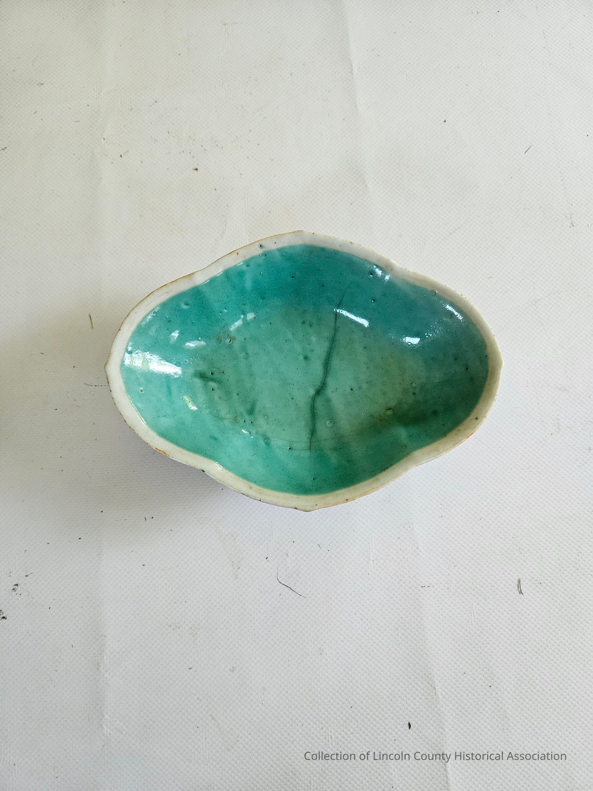 Celadon dish. Green glaze on the inside. Scalloped oval rim. Floral decoration on the outside. Red interlocking circle design on bottom.Made/Created