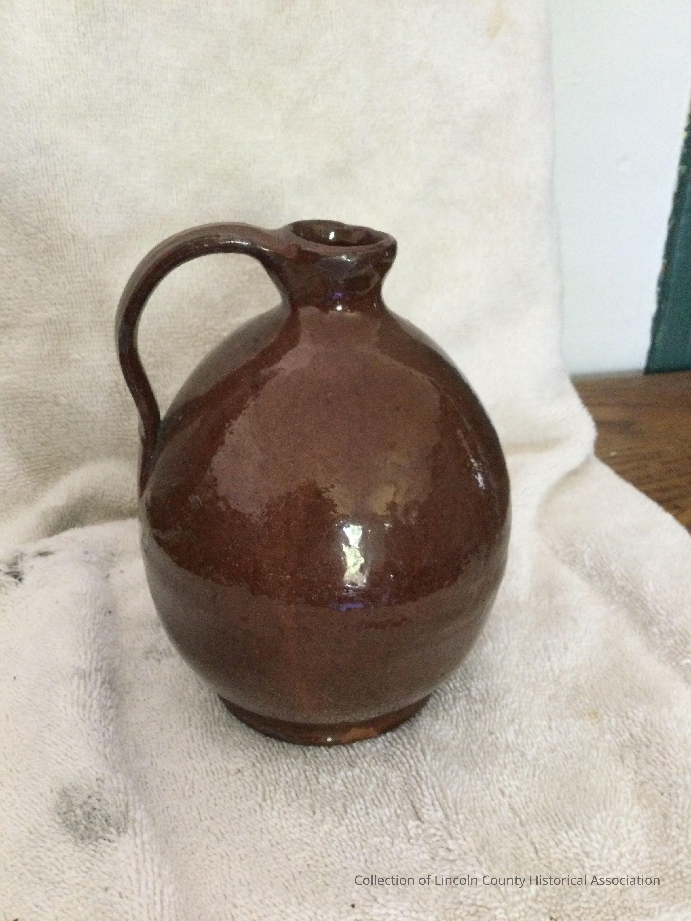 Circular, brown glazed jug with a single loop handle extending from top of lip to shoulder.