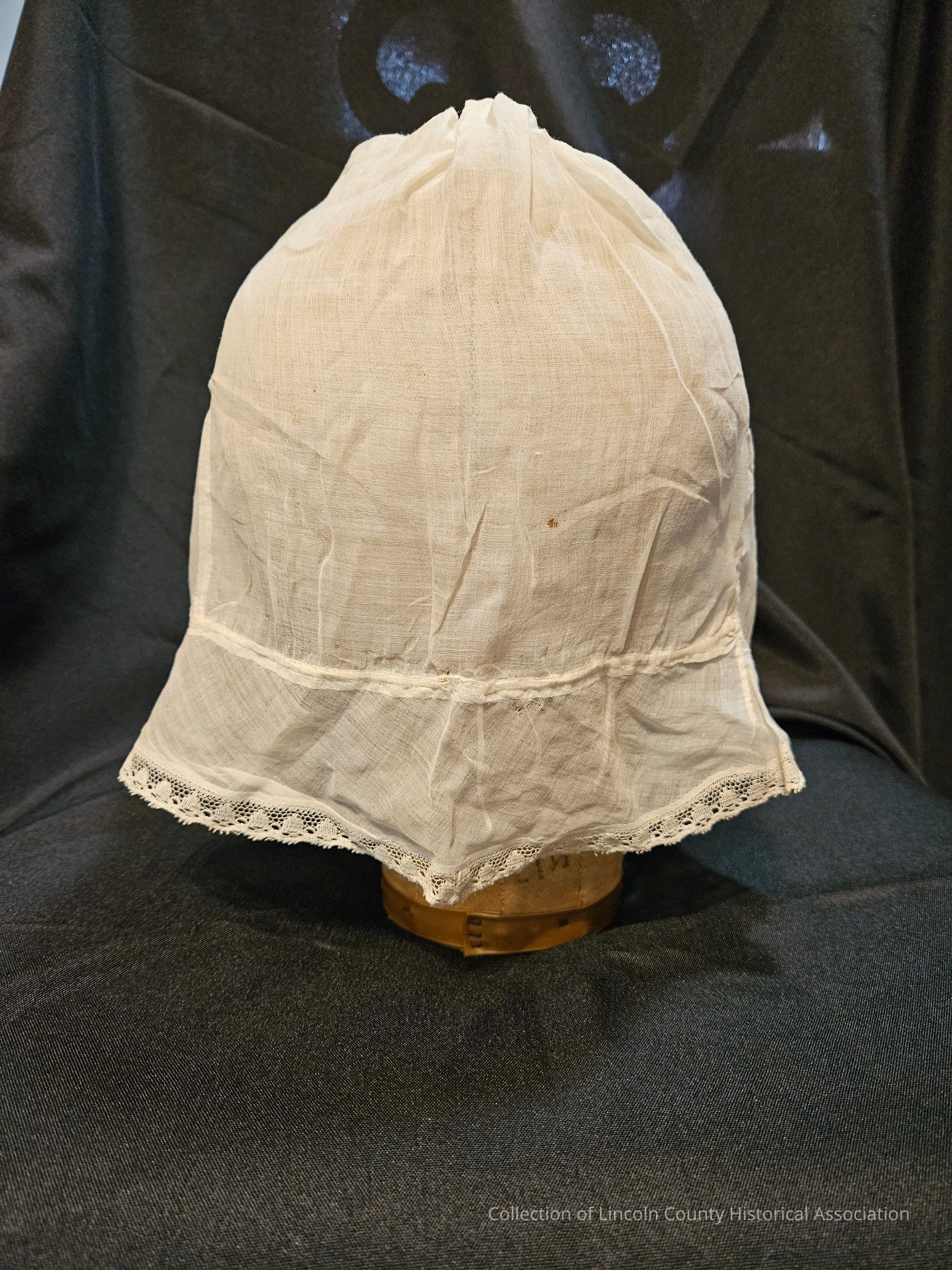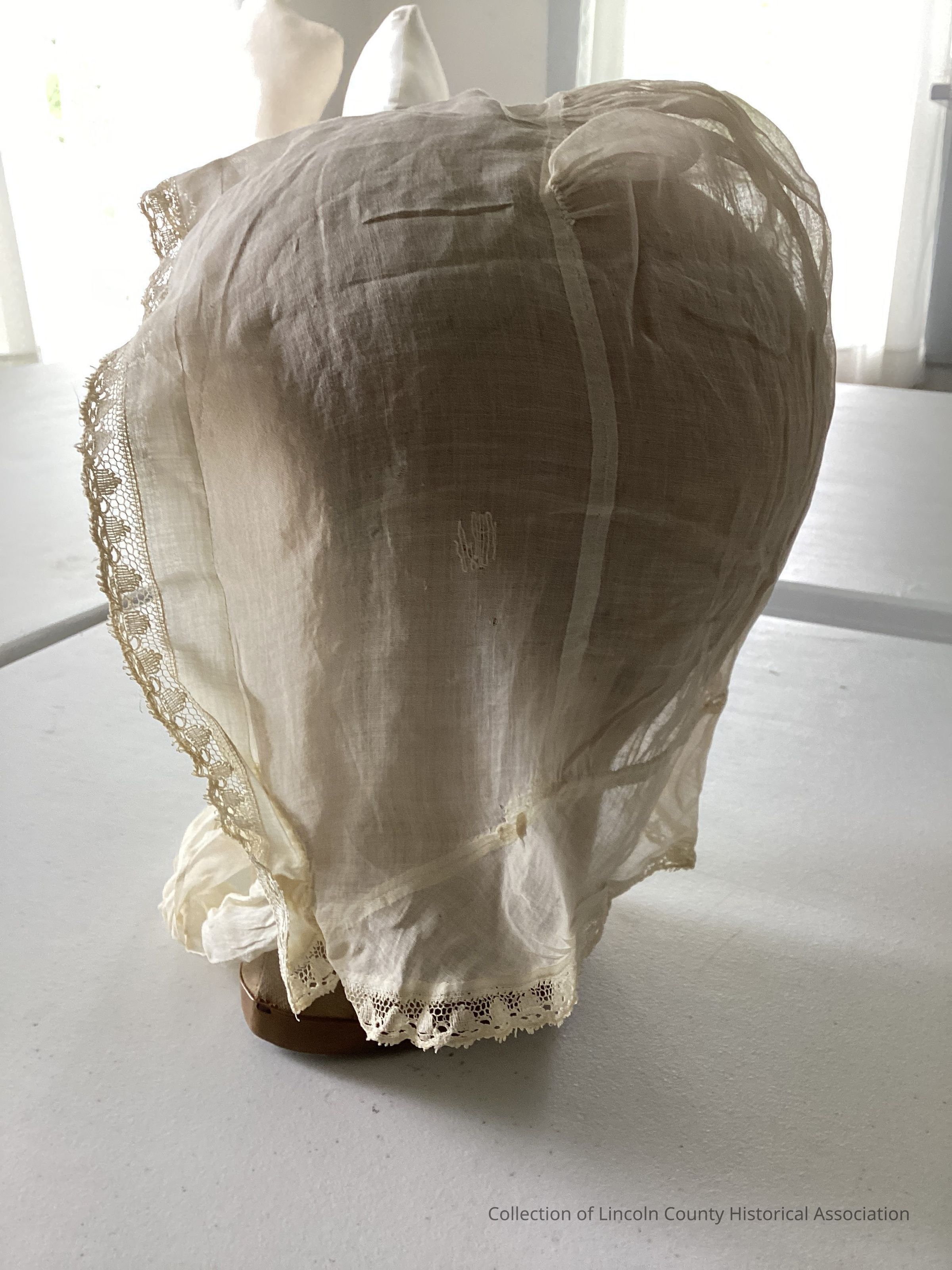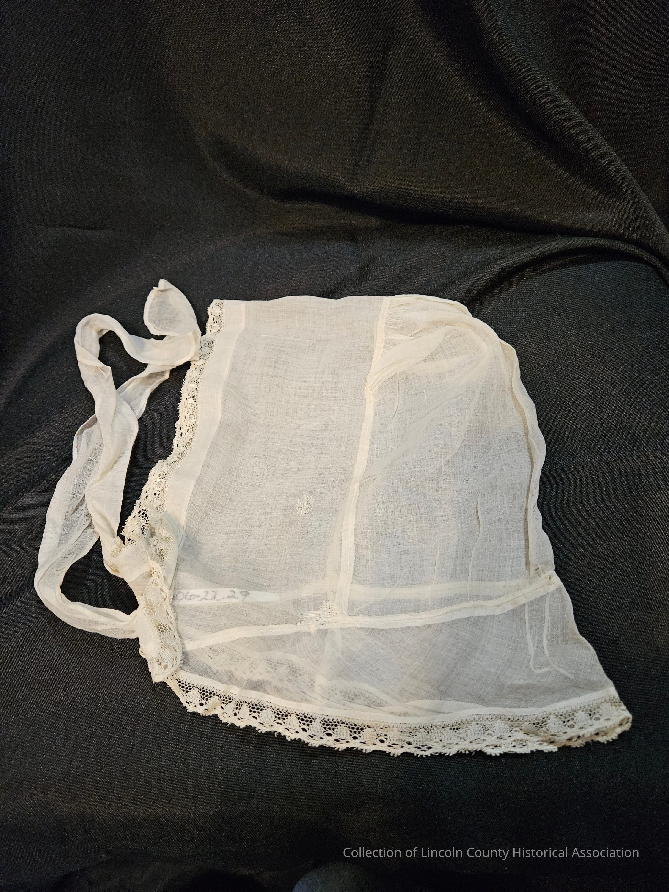 Cotton organdy cap with lace edging. Adjustable string at base of neck. Two cotton organdy ties.