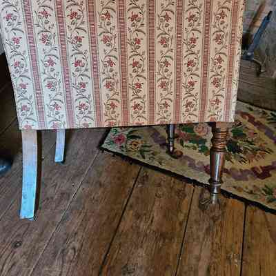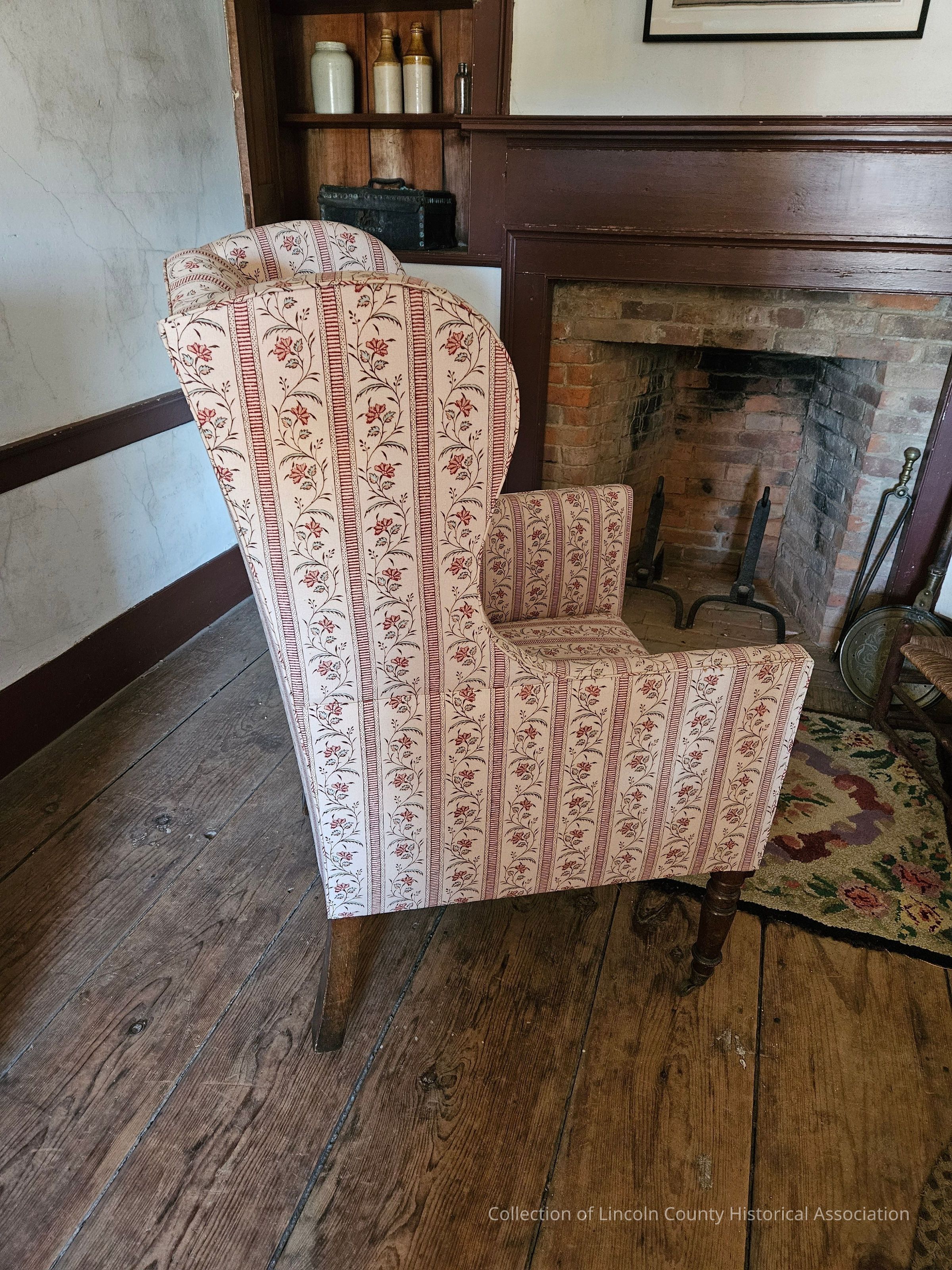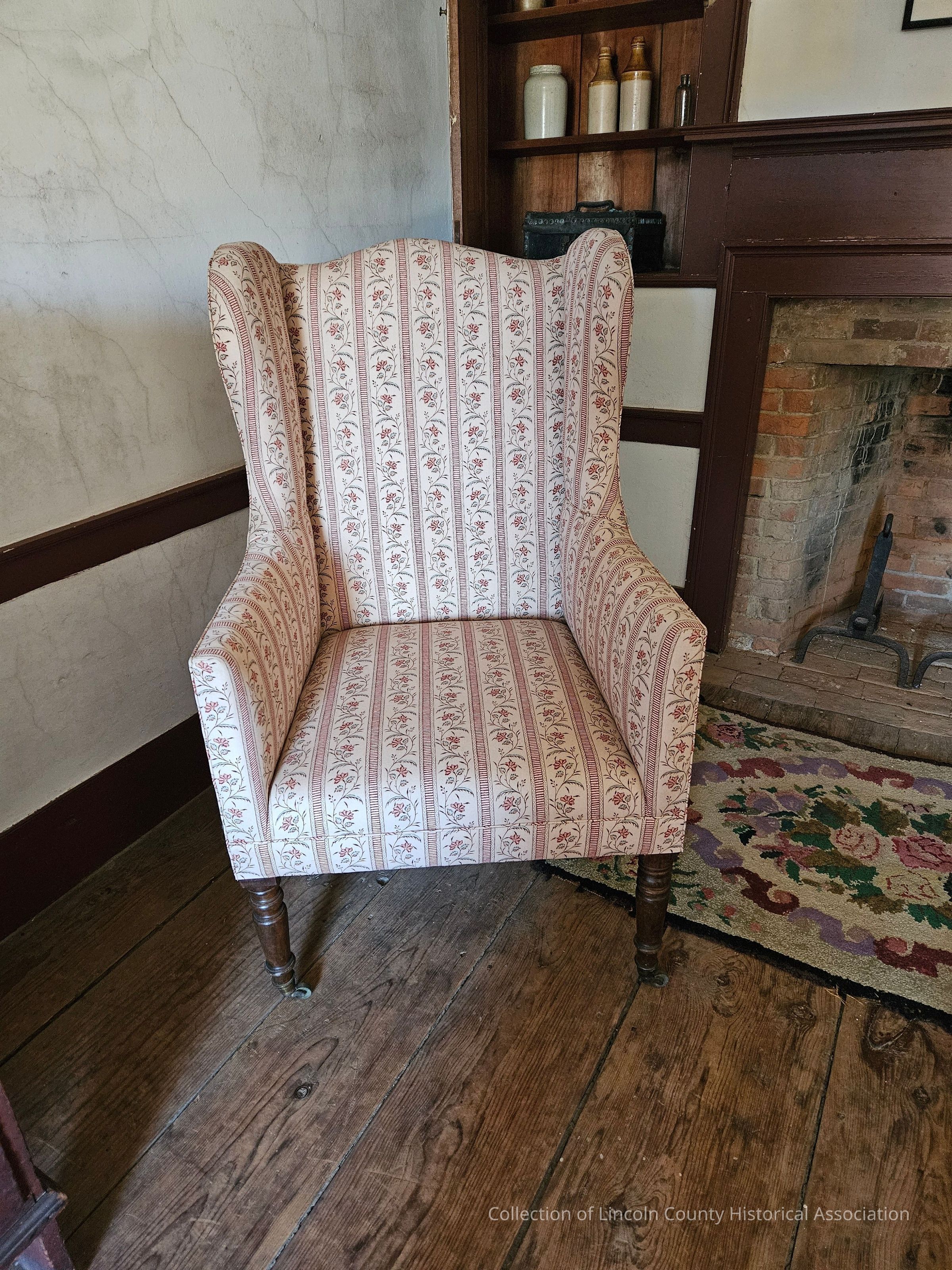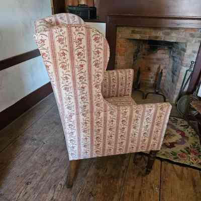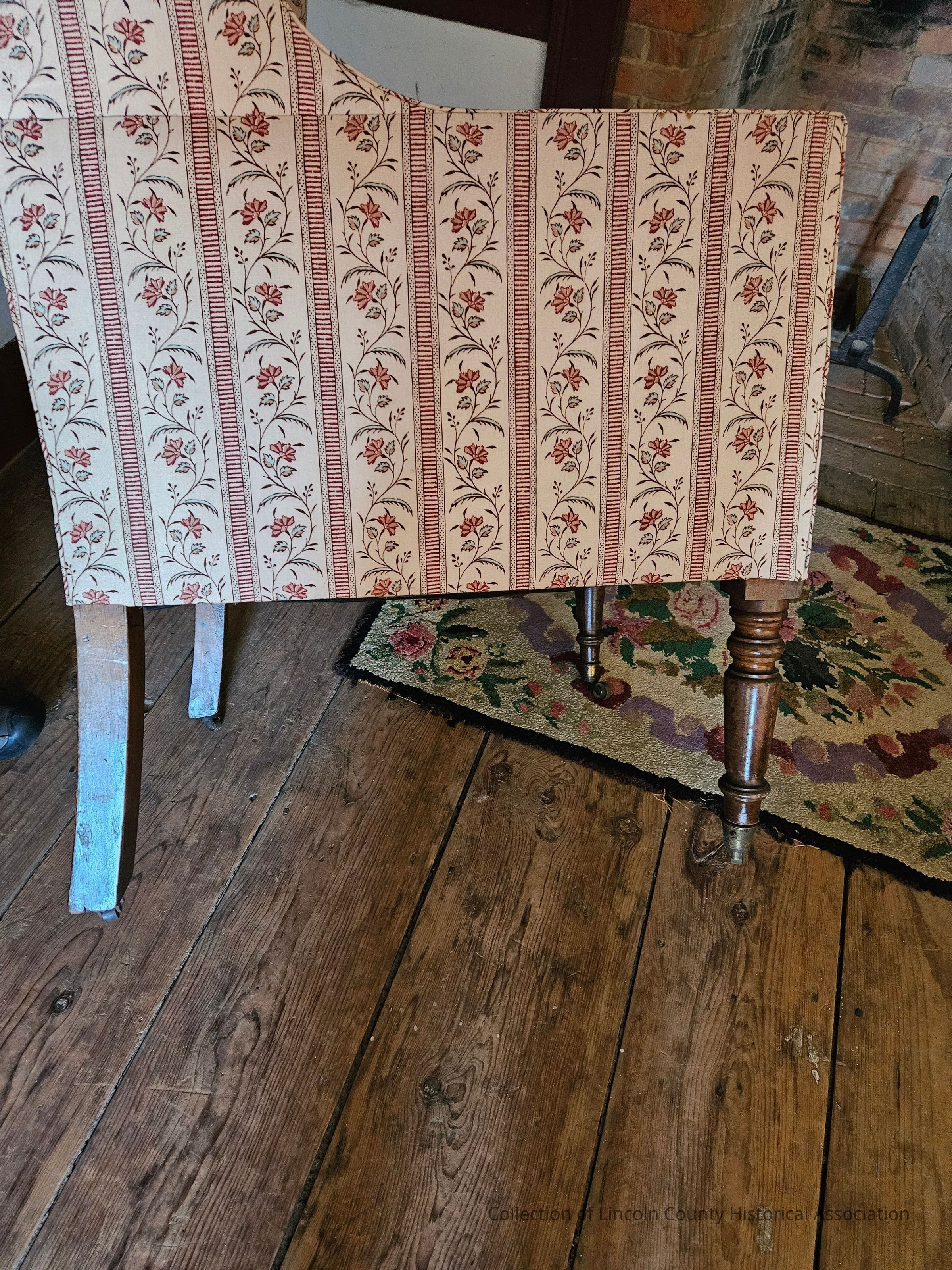 Chair upholstered in pink floral pattern fabric. On four walnut legs, all with casters. Front legs turnedMade/Created