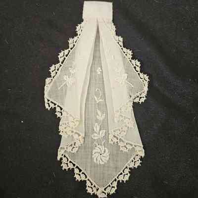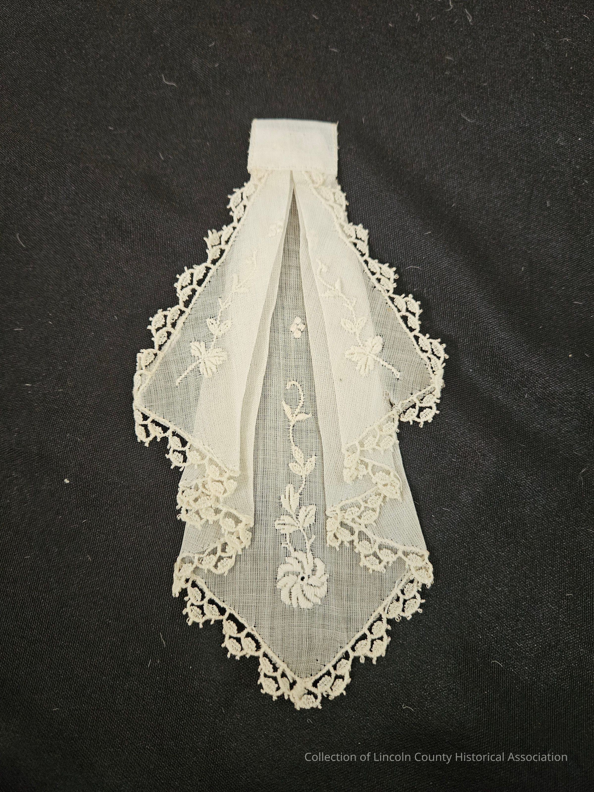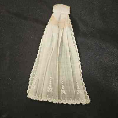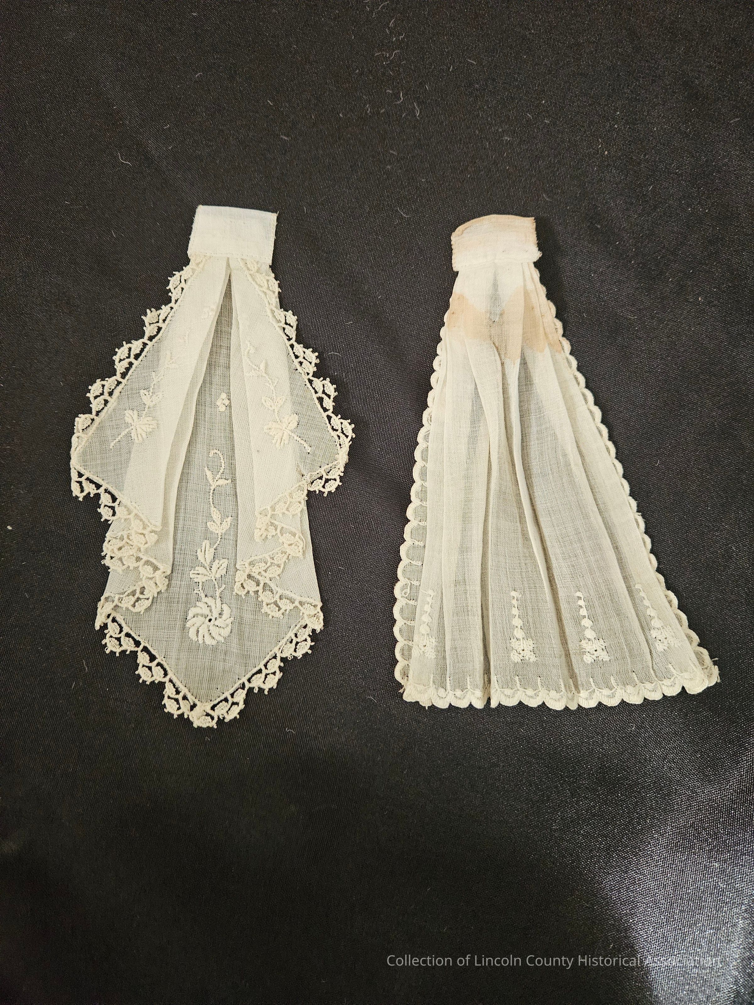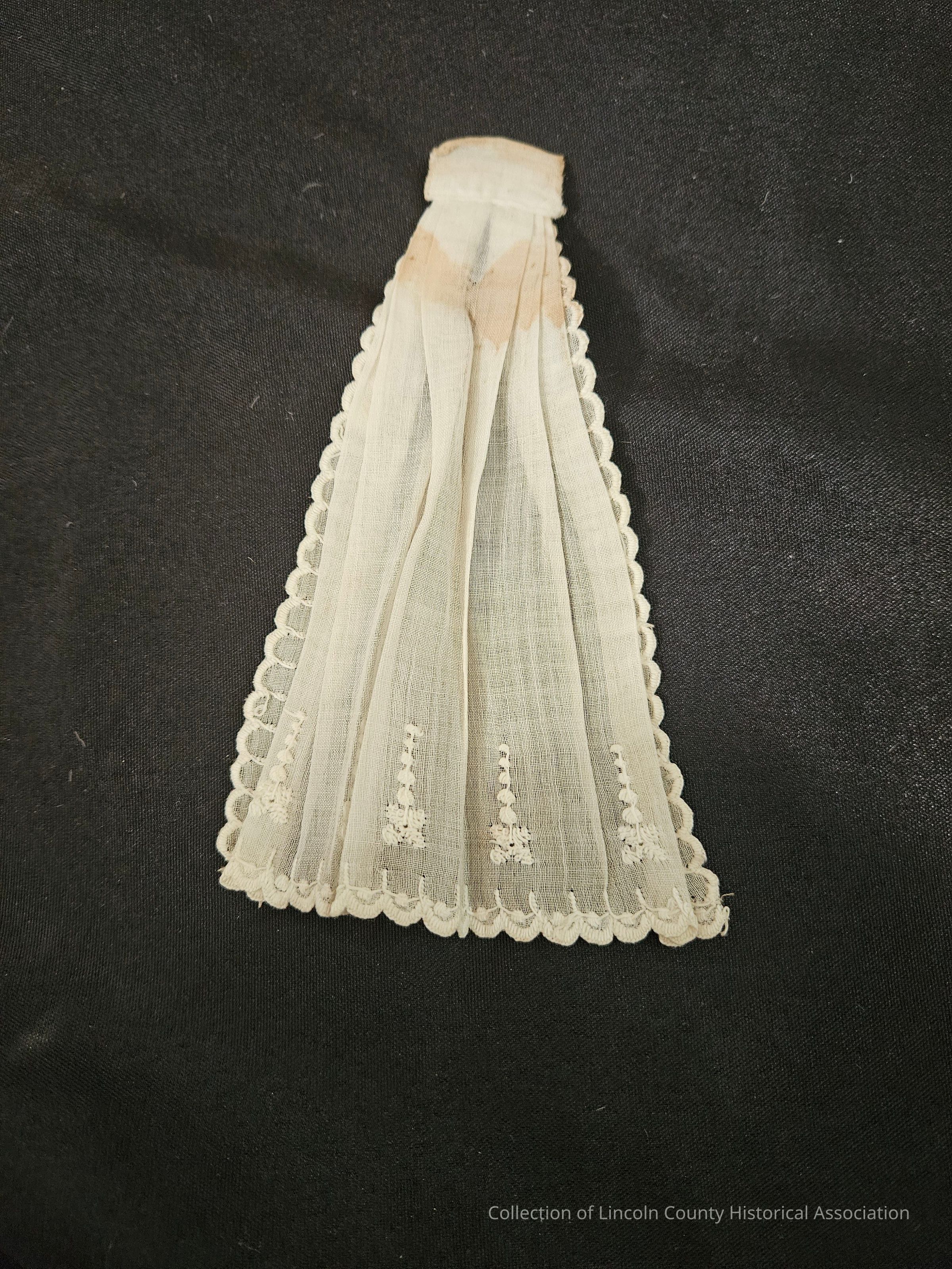Two white cotton neck pieces. One square in shape with scalloped edges and floral embroidery. The other triangular in shape with floral embroidery and scalloped edges. Both pleated.Clothing/Dress/Costume Details