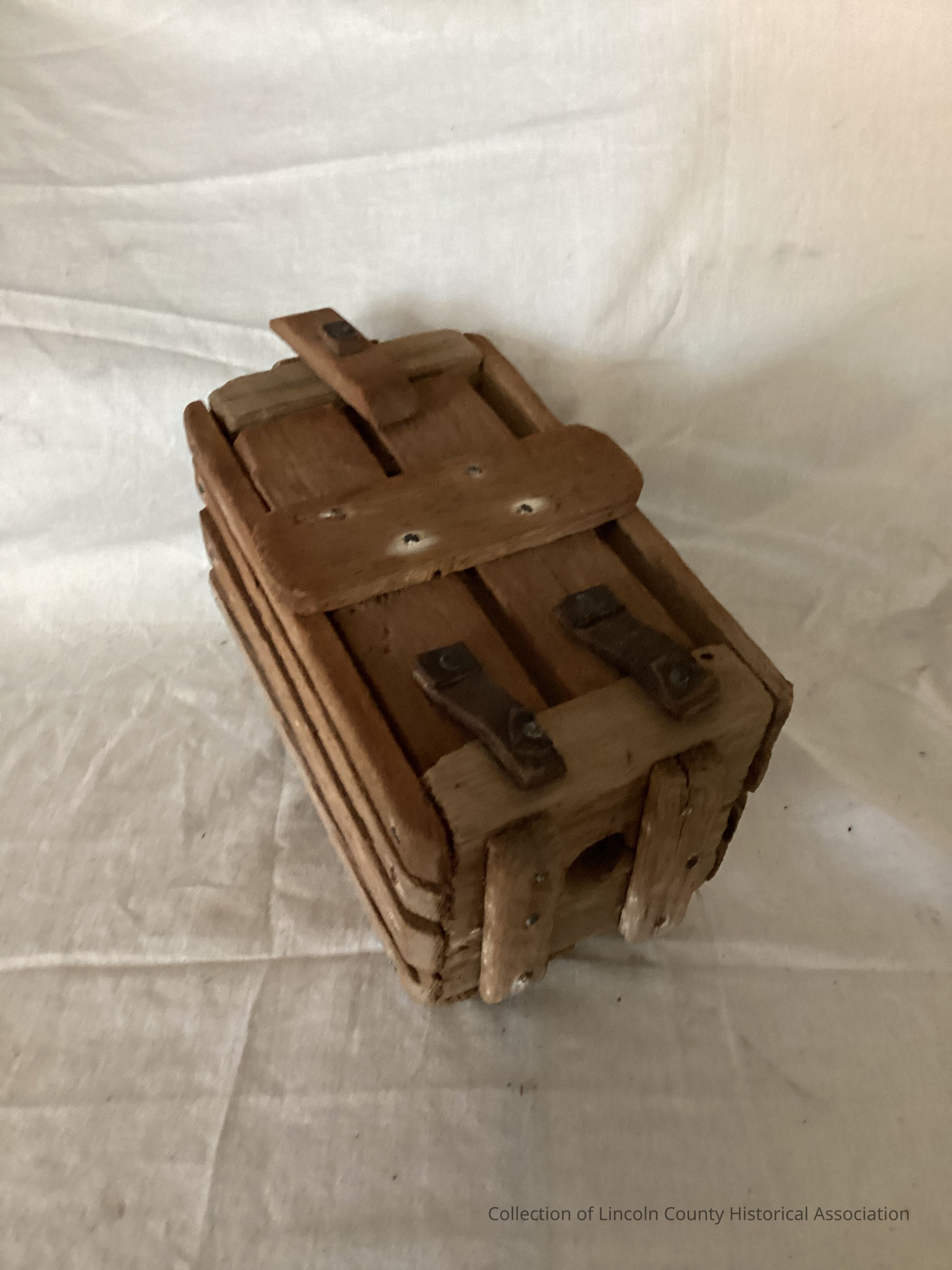 Rectangular wooden bait box. Is made up from strips of wood. Top hinged by two leather/wood straps.Made/Created