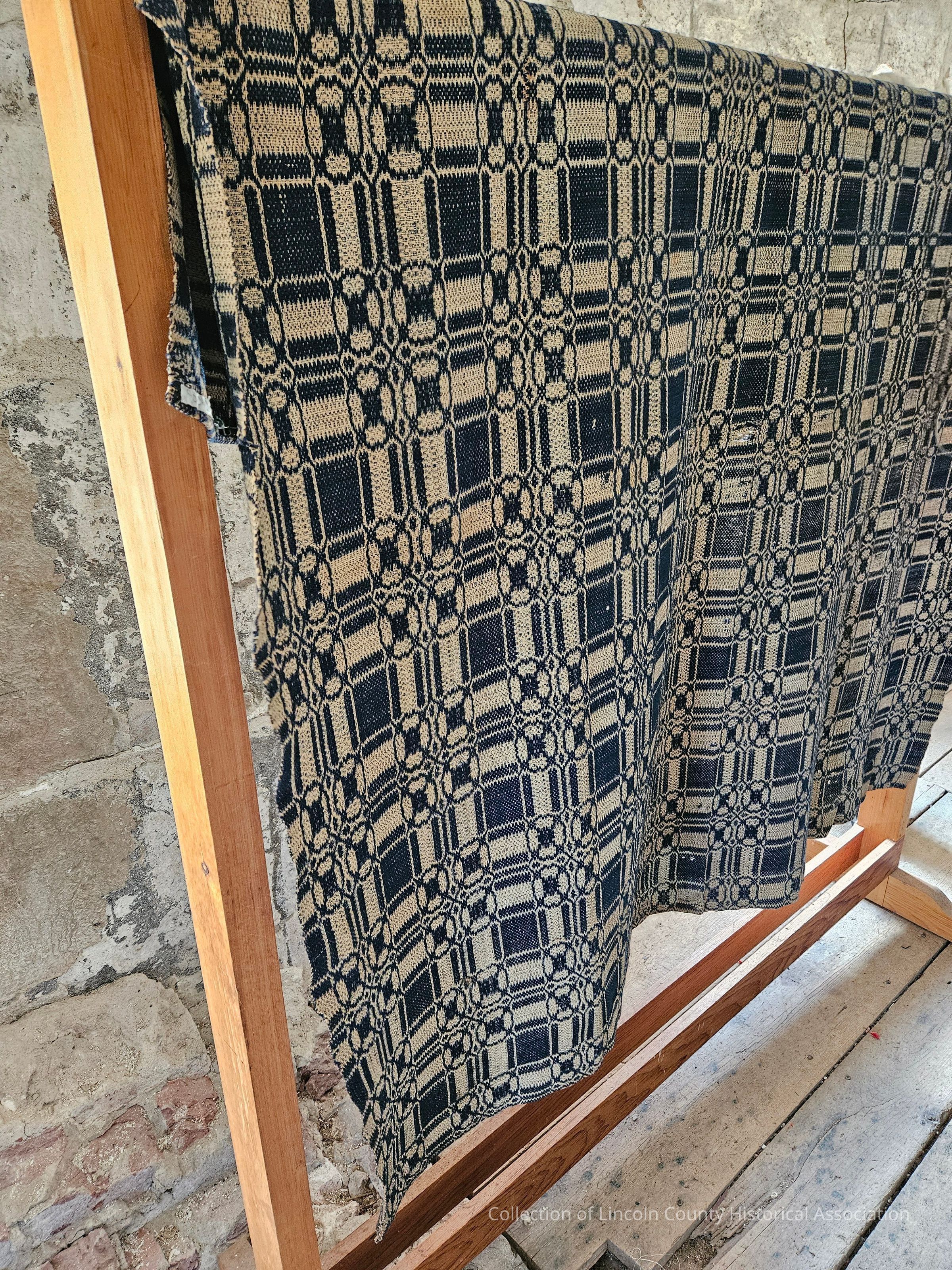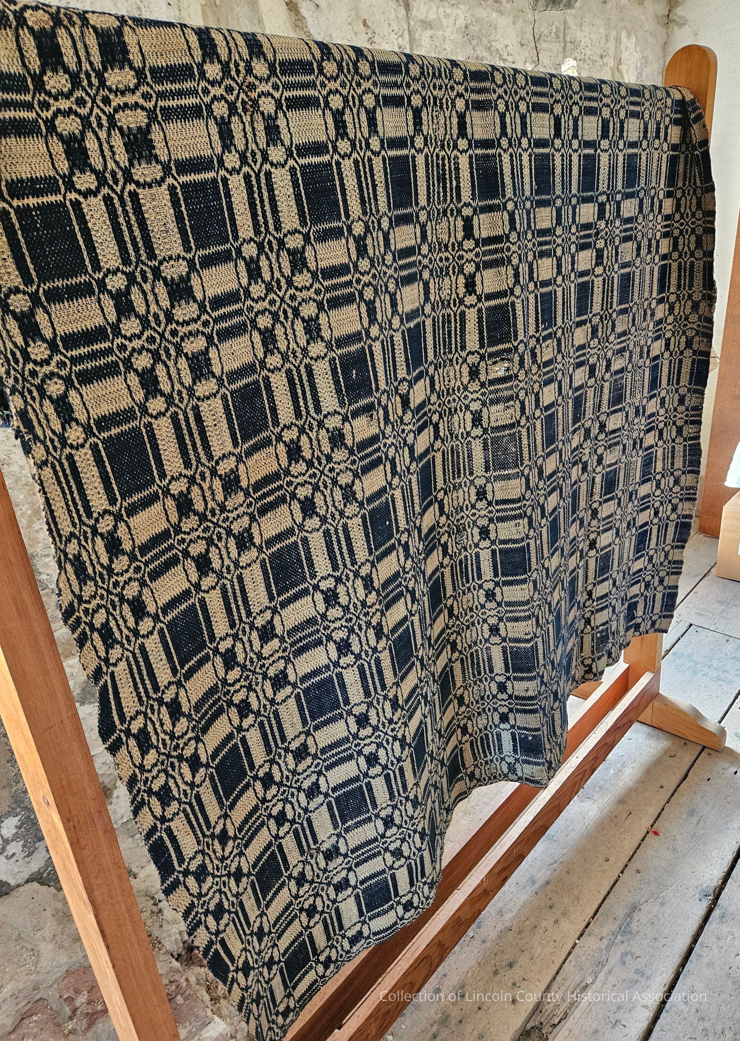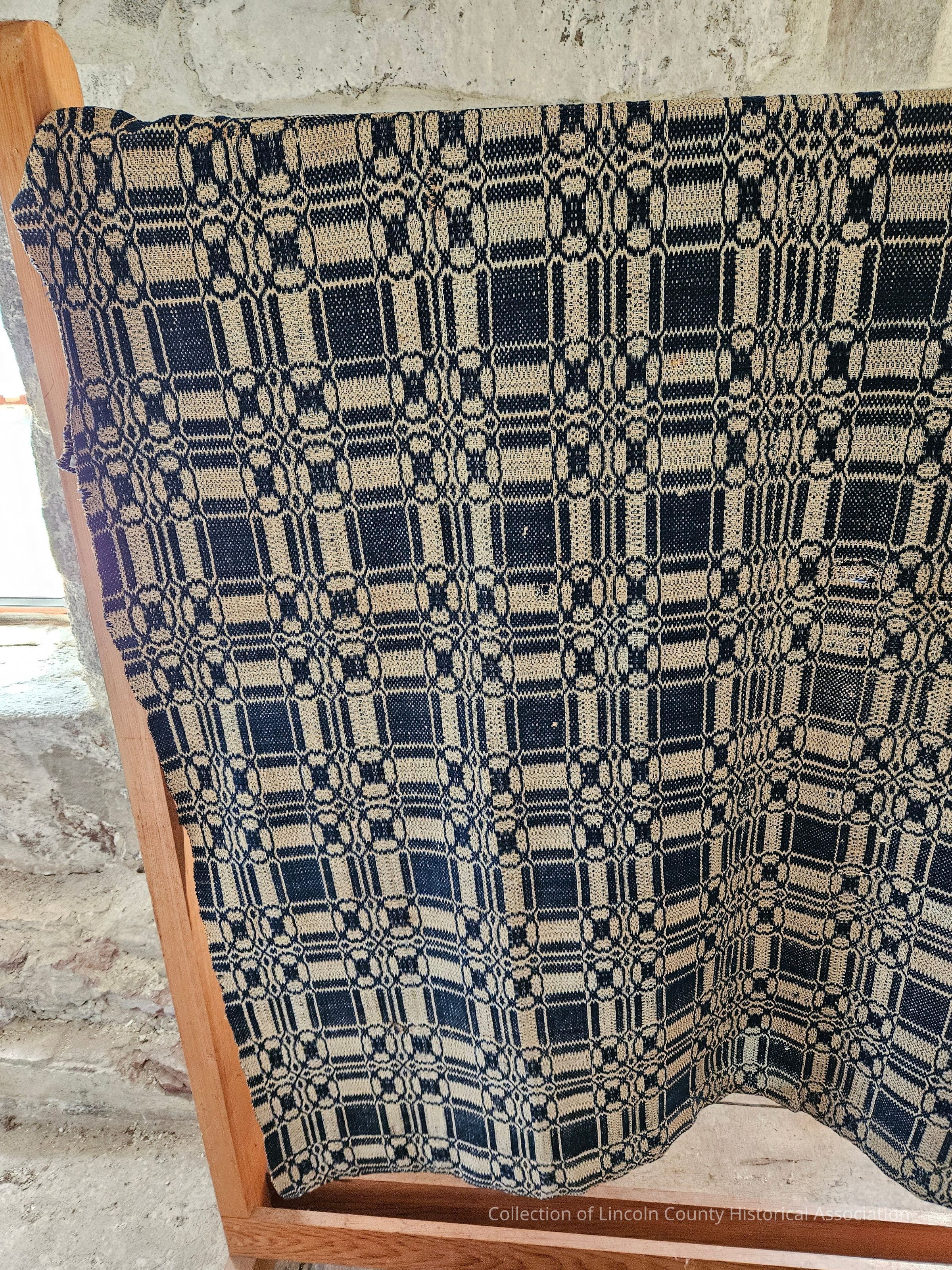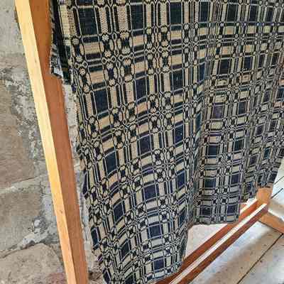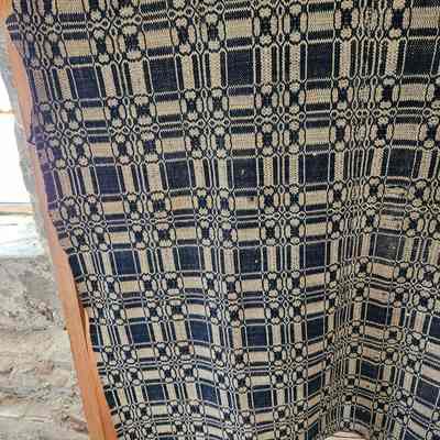 Blue and tan linen and wool overshot coverlet. Dark blue design over natural tan linen background. Hand-woven. Center seam, two panels of 88cm sewn together.Made/Created