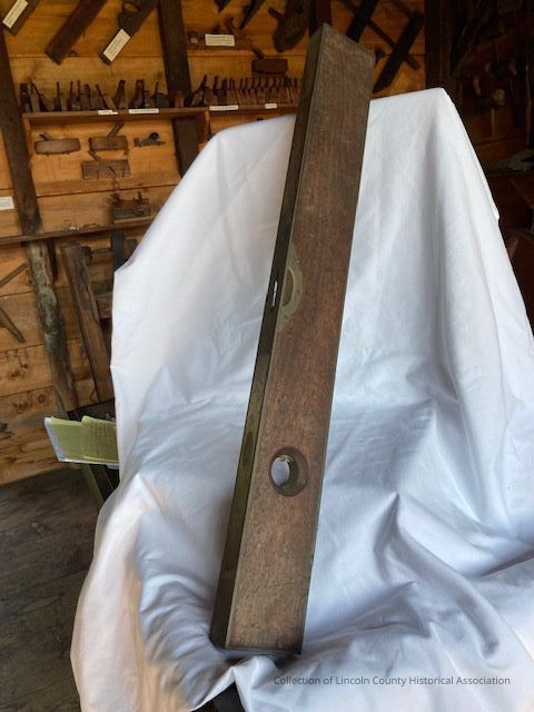 Wood and brass carpenter's level. Long hardwood plank with brass plate guard over glass level. The wood is likely walnut. Is brass bound along its edges.Made/Created