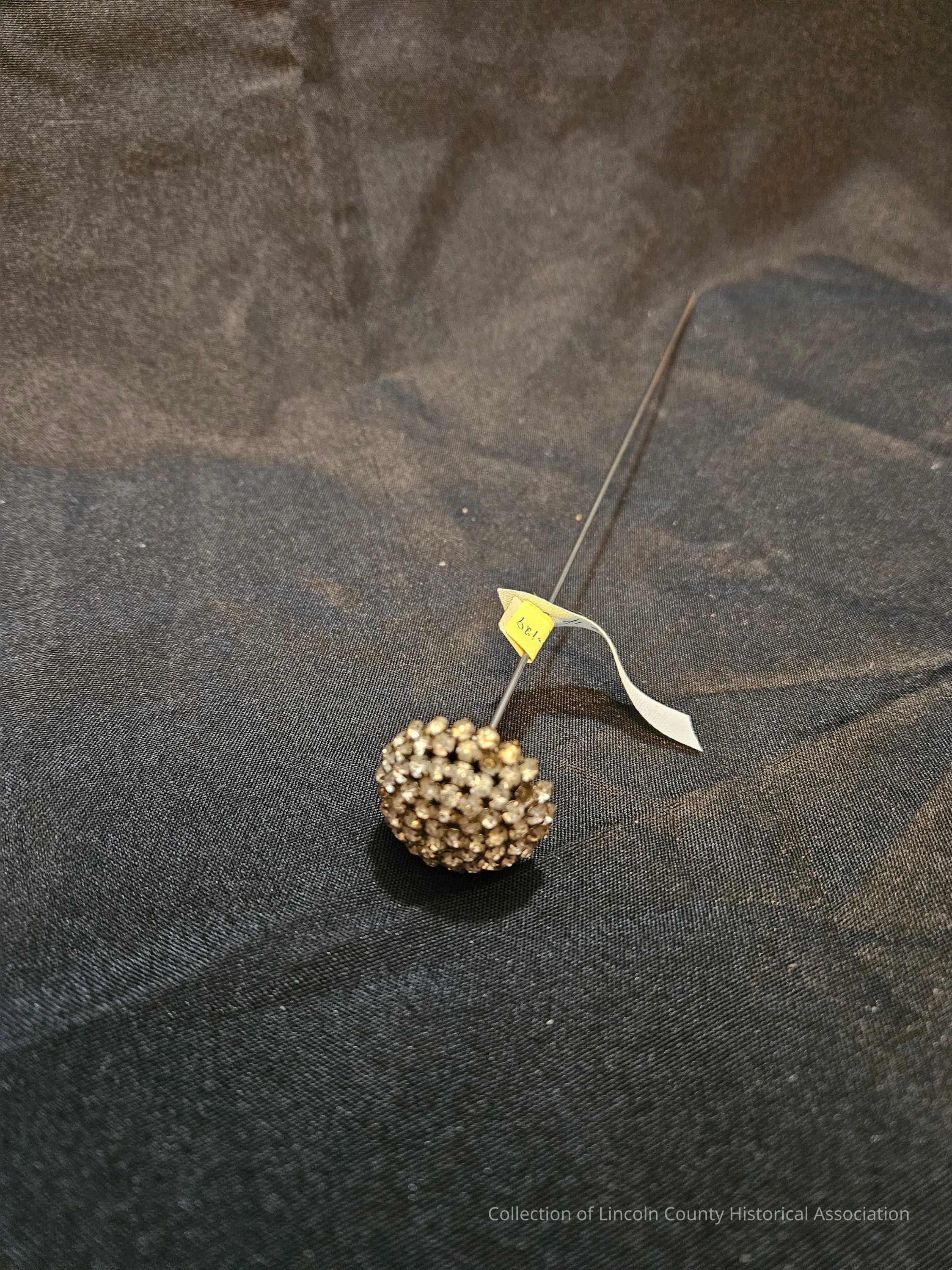 Women's hat pin. Flower shaped head with small paste diamonds. Brass base.