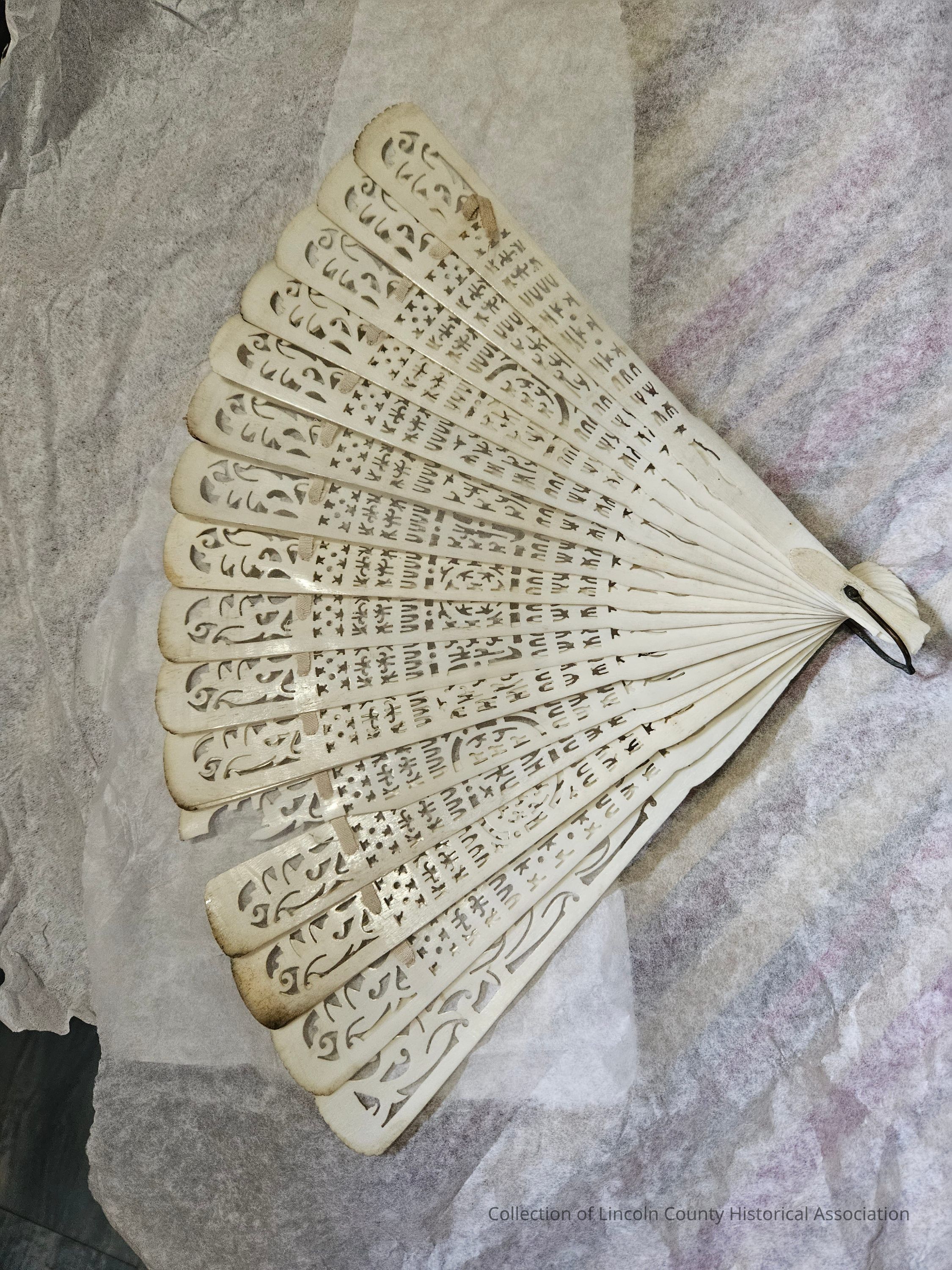 Ivory fan with 19 carved filigree ivory spines. One spine broken above pivot point. Brass pivot and attached wire handle.