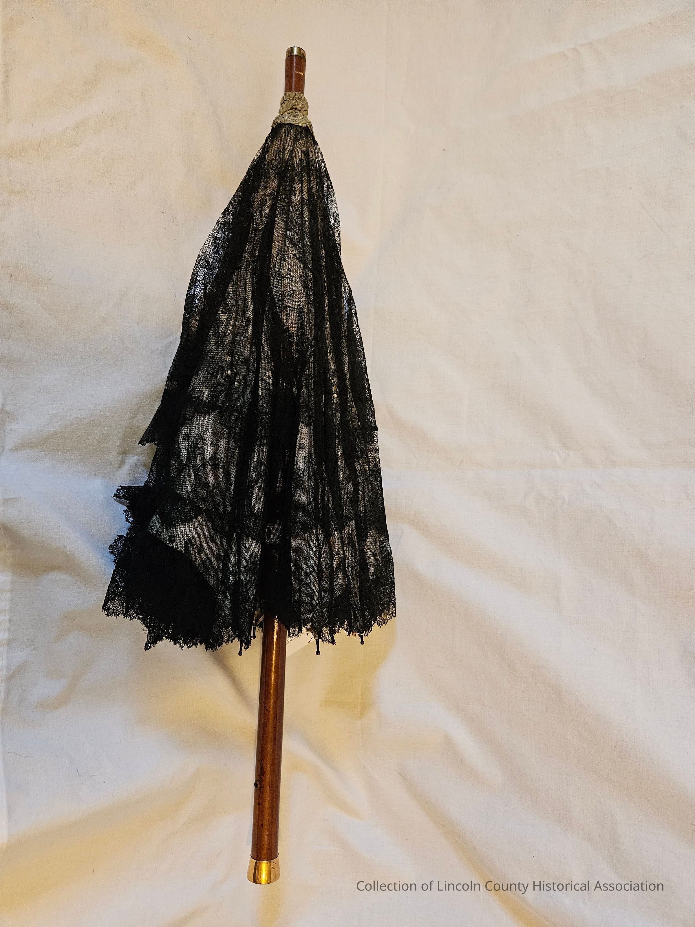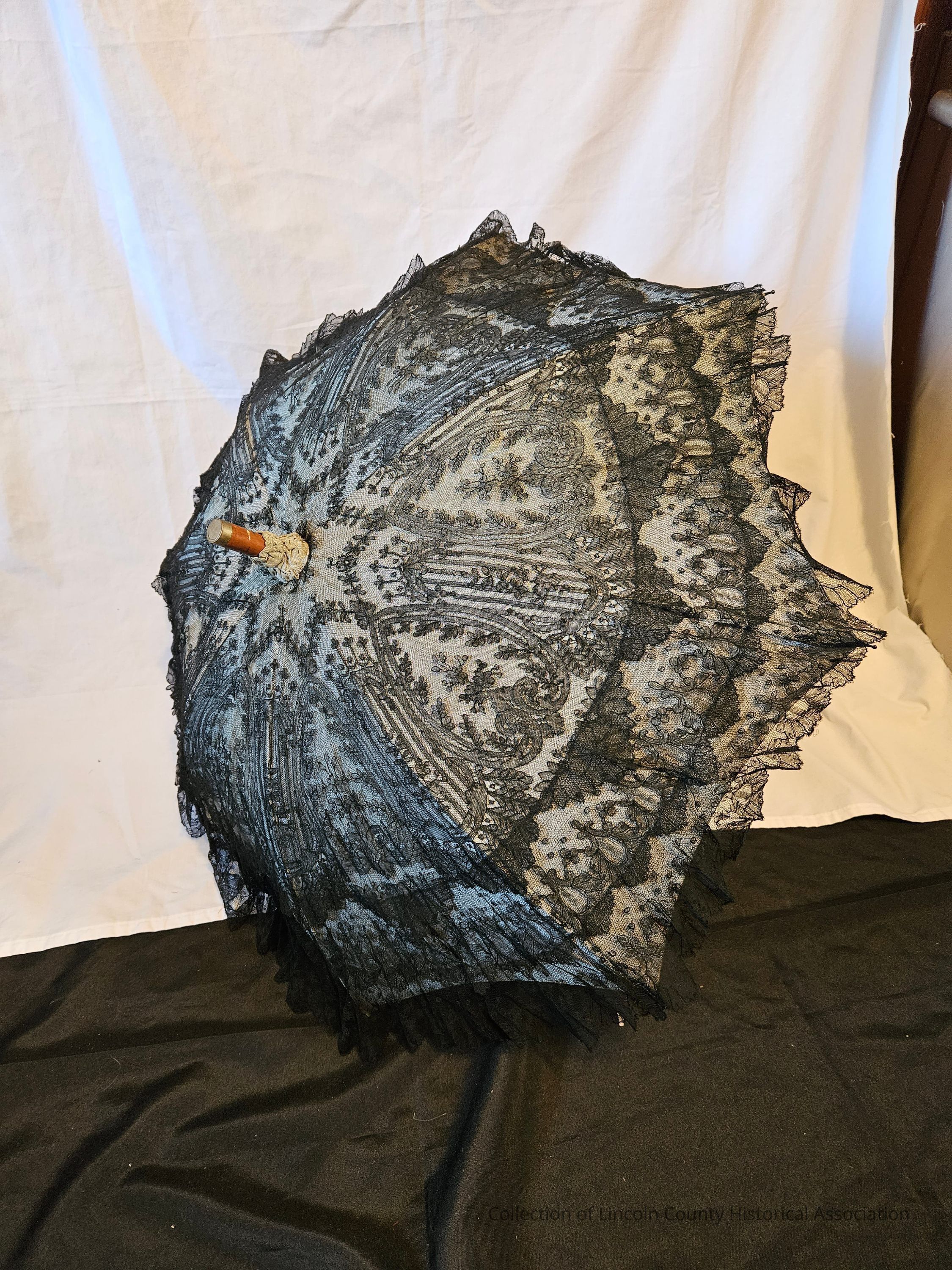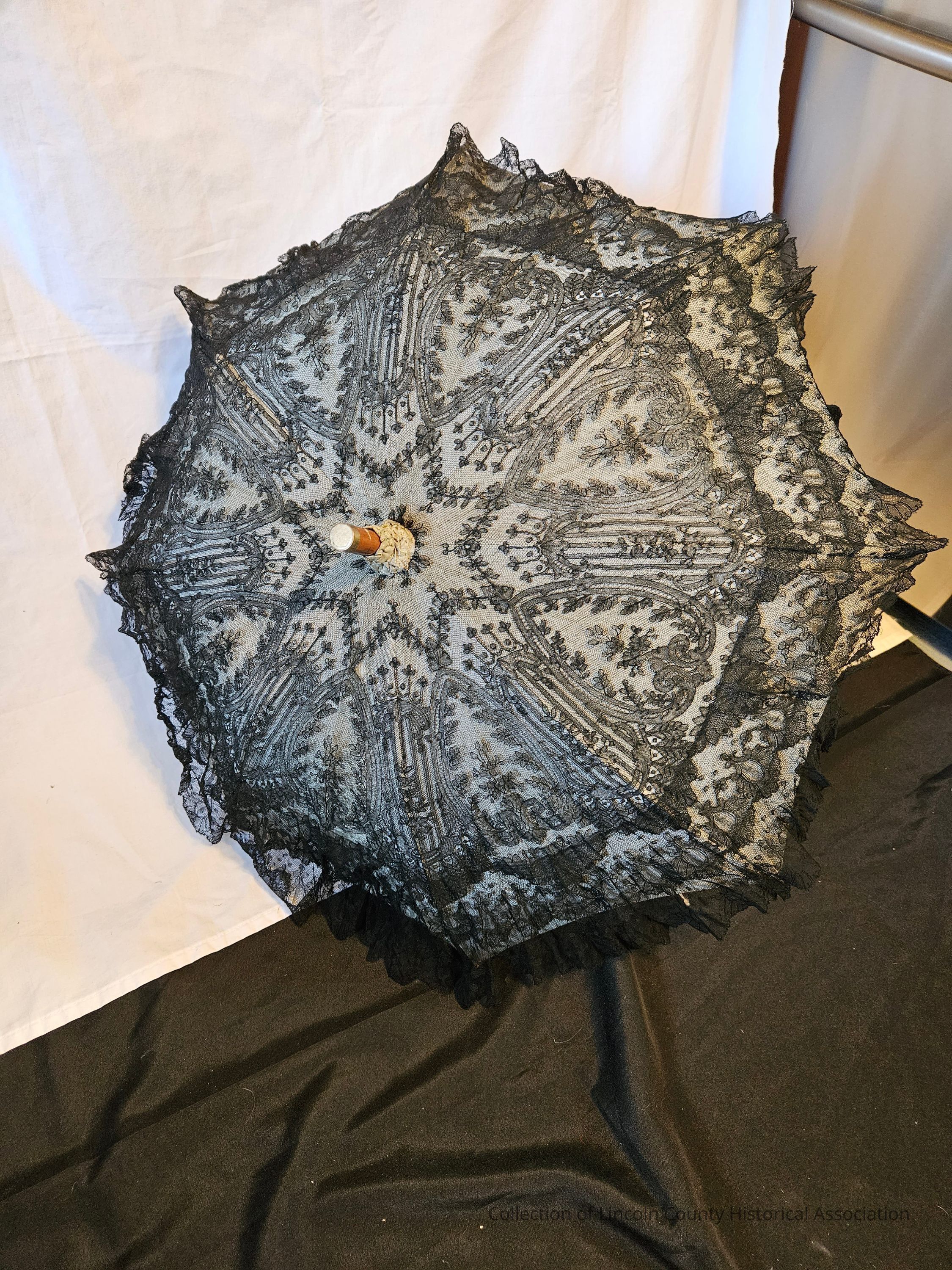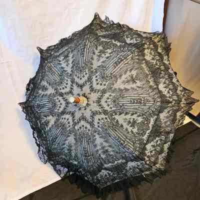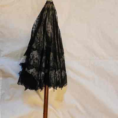 Black lace parasol/umbrella over grey lining. Short wooden handle with gold tips. Metal ribs.Made/Created